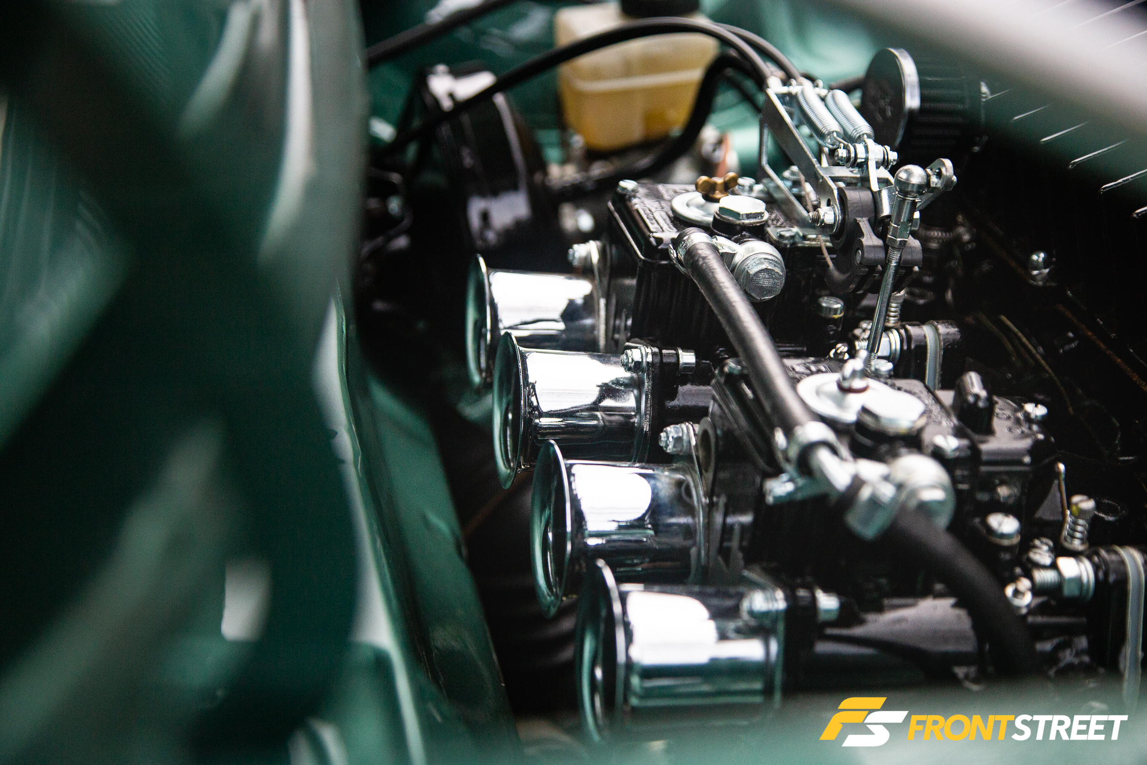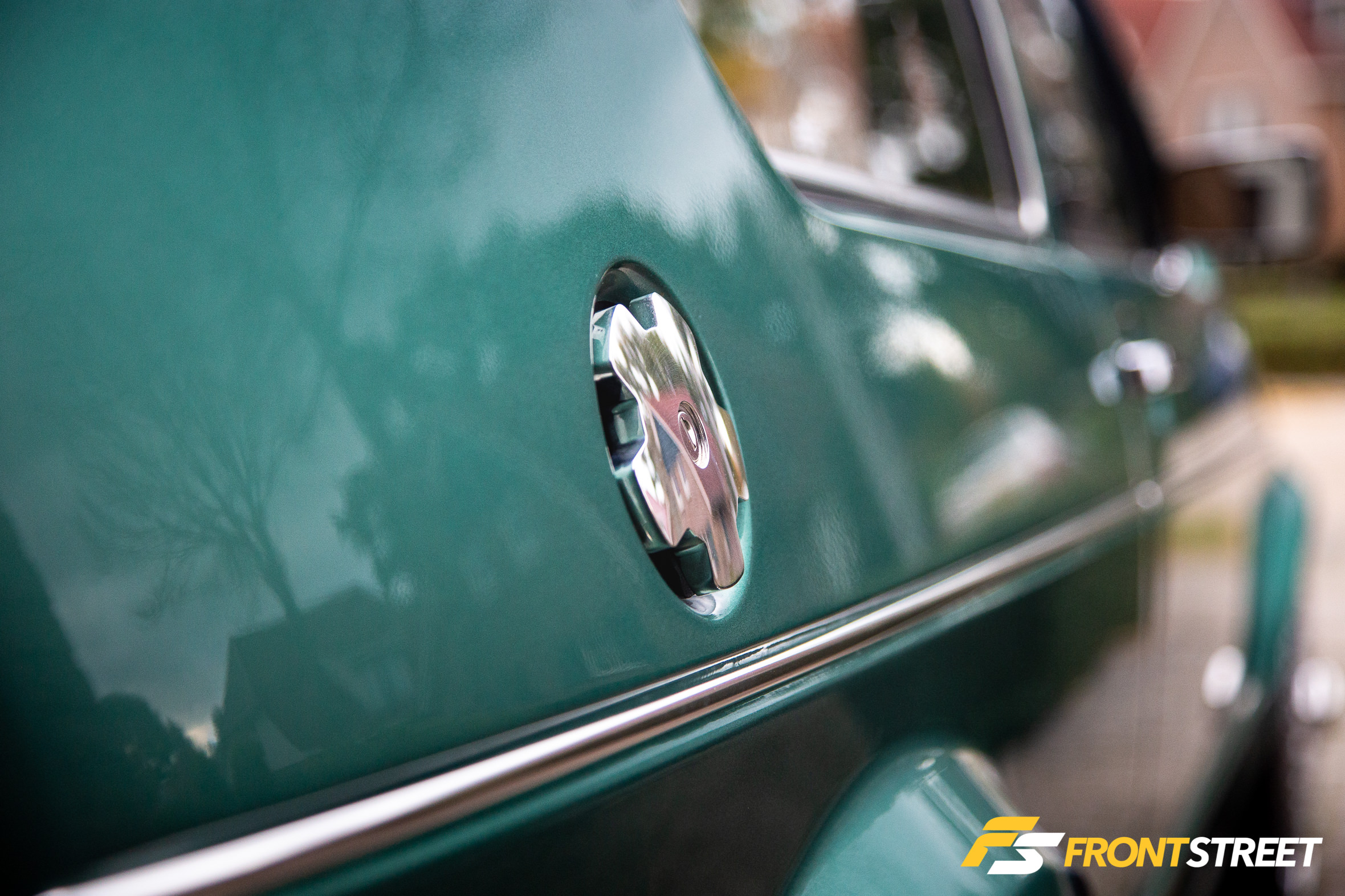 Throughout this time, he also bought OE Volkswagen chrome bumpers and repainted half of the car in its original Papyrus Green Metallic finish. A necessary step as he wanted to roll the fenders for better clearance anyway and didn’t want any of the OE holes in the fenders. Of course, with the additional room of the rolled fenders, he purchased new adapters to take full advantage of the new space.
