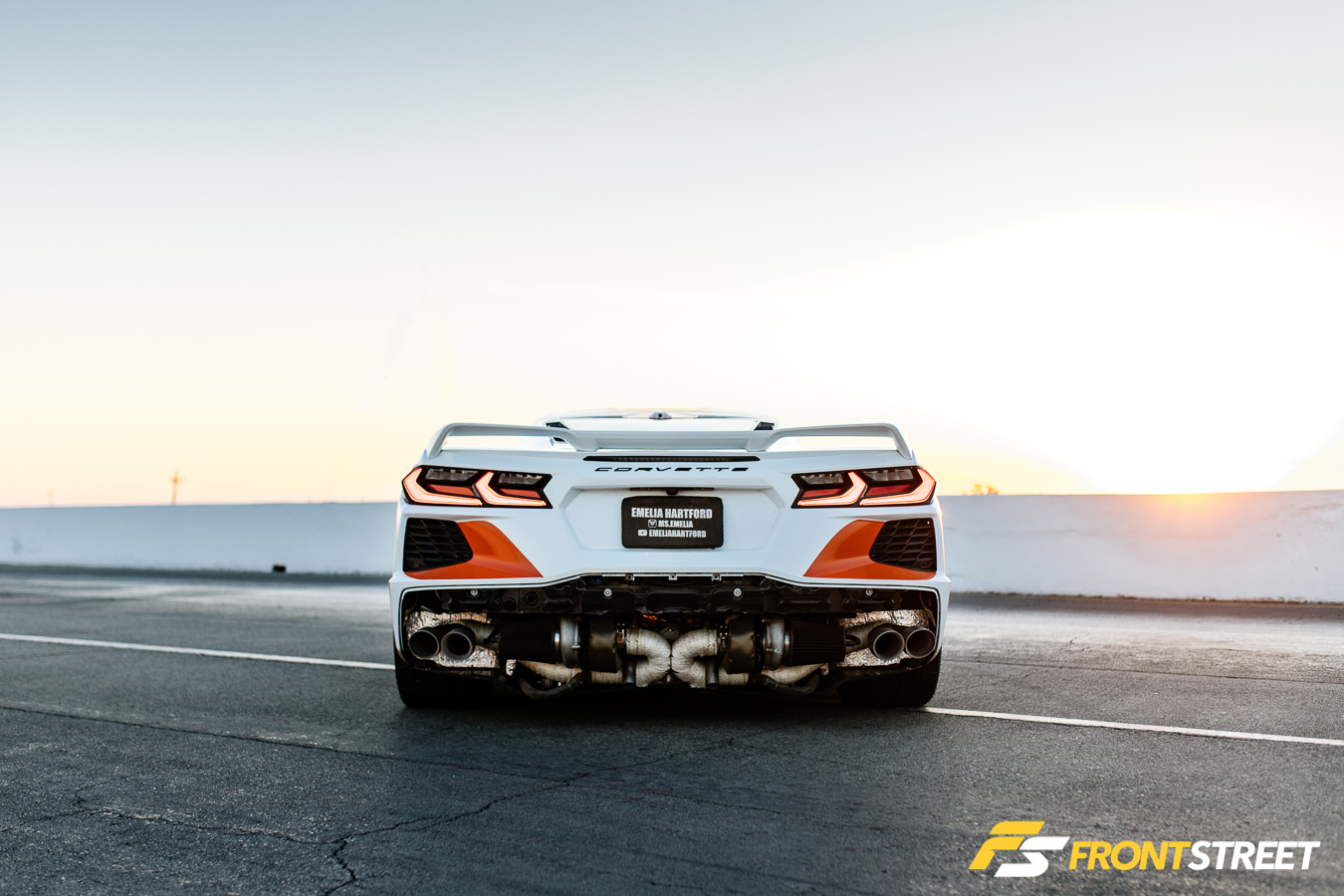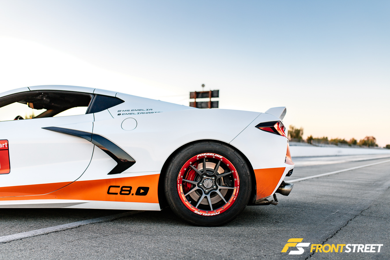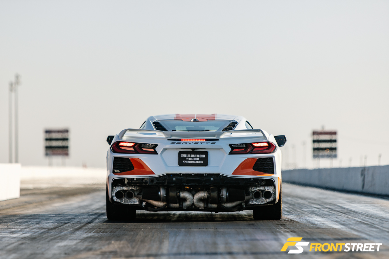 After figuratively setting the dyno ablaze (and actually igniting several shop rags and a slice of pizza in the process), Emelia’s C8 achieved new ground eclipsing the highest horsepower record for a C8 Corvette with an astounding 1,022 horsepower (942 lb-ft of torque) dyno pull. From there, she had her sights on another record — the fastest C8 Corvette in the quarter-mile.