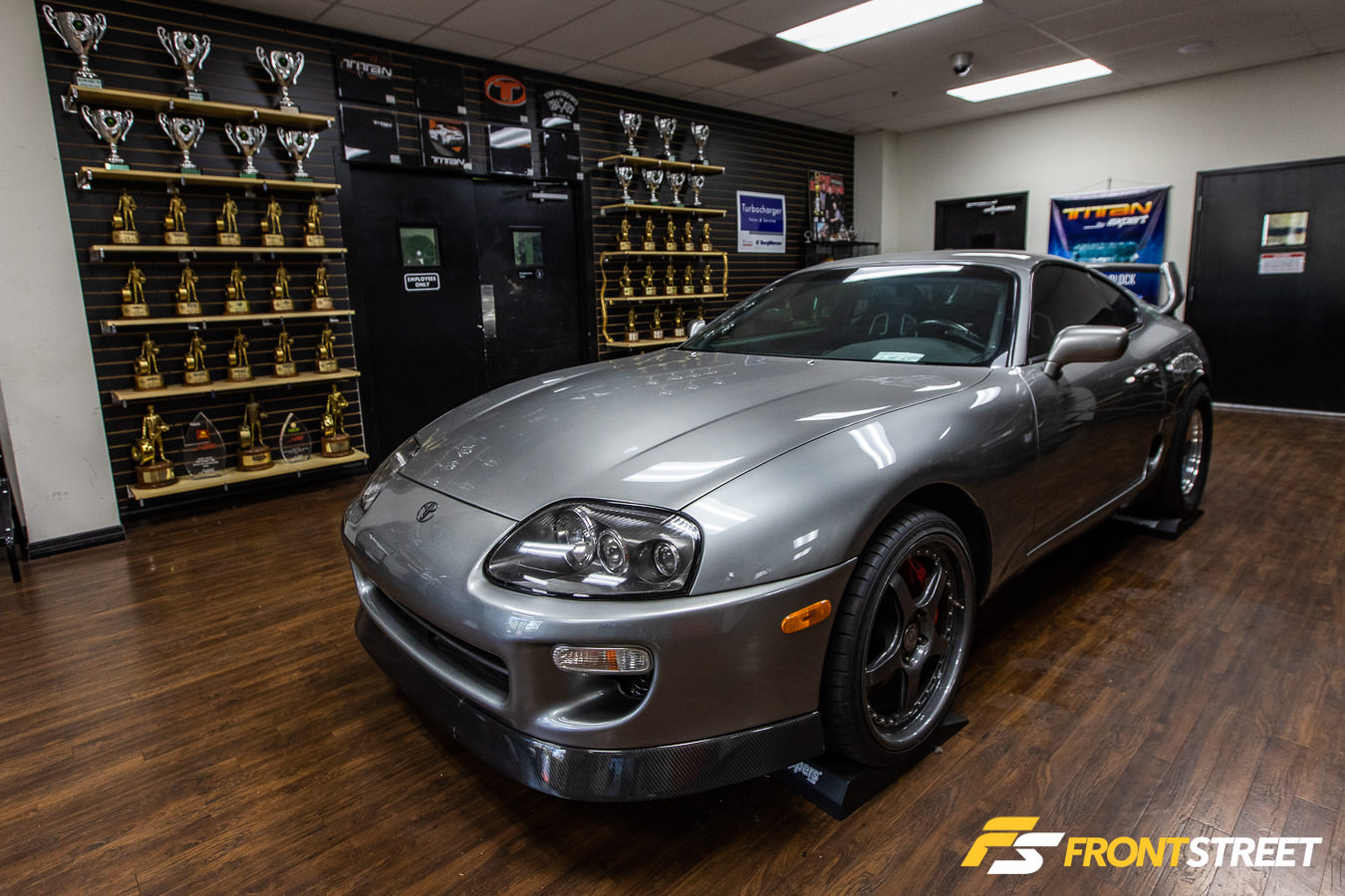 Titan Motorsports is located 15 minutes away from Orlando International Airport and maybe about 20 minutes away from Walt Disney World (meaning you can drop off the kids and catch up with them later). As I arrived at the facility, I was taken aback by how tall it stands from the main street. It’s no ordinary operation but a 25,000 square foot warehouse. Inside houses a massive installation bay with five lifts (during my visit, I counted eight cars under the knife). Next on the tour was Titan’s in-house R&D and fabrication center. They engineer well-known parts such as their 2JZ billet blocks and stroker kits, Mk4 Supra Chromoly rollbars, and high flow A90 downpipes. The other half of the warehouse consists of rows of inventory that carry virtually everything the business offers online or via wholesale, including goodies from ARP, Brian Crower, Wiseco, and Bosch. Last but not least is the front office and showroom, perhaps on the quieter side during my visit as the majority of the staff were gearing up for the weekend’s big race. Still, I admired a 1,000+hp Mk4 Supra displayed front and center along with walls decorated with countless trophies and magazine features.