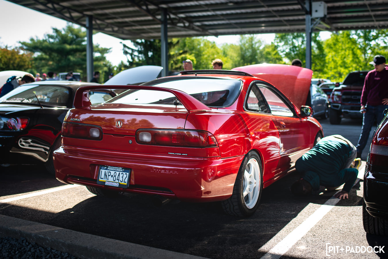 Let’s start it all off with this wild Integra. Positioned with some of my favorite Hondas that regularly attend our Cars+Coffees (thank you all for your constant support). I was first drawn in by the ripe red paint and gleaming white Regamasters. Once the white-on-red scheme lured me in, the open hood and glimpse into the engine bay kept me scanning as intended. A nicely equipped K-series engine swap resides in the bay, while a fat Precision turbocharger force-feeds extra fun. I was almost finished admiring it when I noticed something interesting on the taillight garnish — an OEM Honda sticker displaying “Realtime AWD”. At this moment, other onlookers saw the same badge and got down on all fours to inspect under the car. I joined in, and sure enough, it yielded a view of a custom-mounted CR-V rear subframe with its respective AWD-drivetrain setup. As if the K-swap wasn’t enough, or adding a turbocharger didn’t scratch the itch, an all-wheel-drive system keeps things that much more enjoyable. Nicely done.