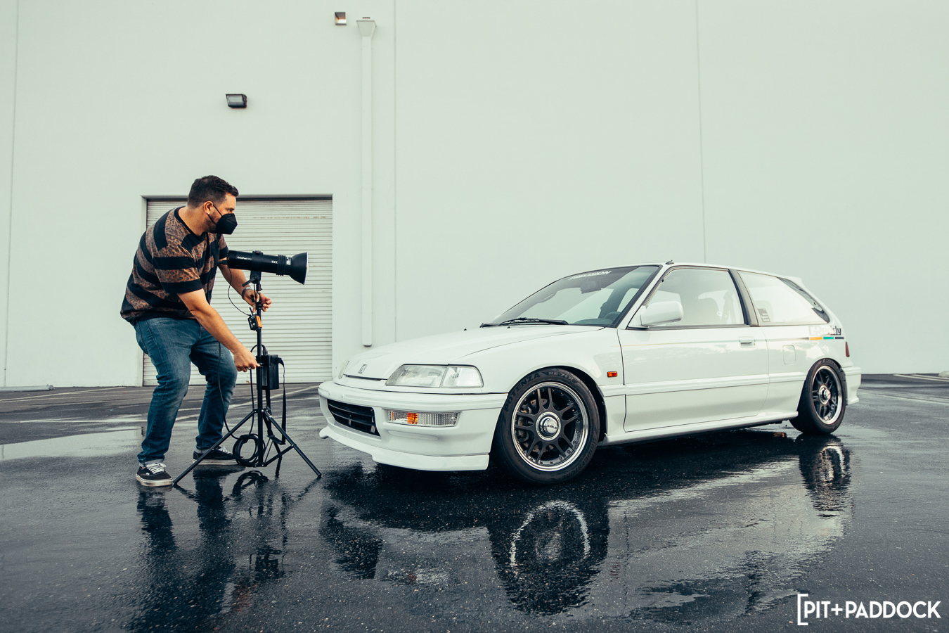 With every Pit+Paddock poster shoot, we’re not just going to be highlighting a significant vehicle builder in the industry but also the artists responsible for the beautiful imagery we admire. Last month, we interviewed Viet “V” Nguyen, whose fiery photo of Jonathan Grunwald’s Mazda RX-7 really kicked our poster series off with a bang (and a brap, brap, brap!). This month, we’re excited to showcase Kenji Sumino of GReddy Performance Parts and his extremely clean EF Honda Civic, as seen through the lens of Nate Hassler.