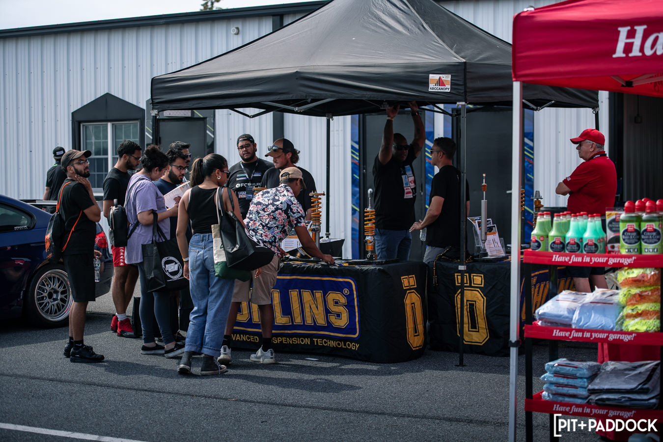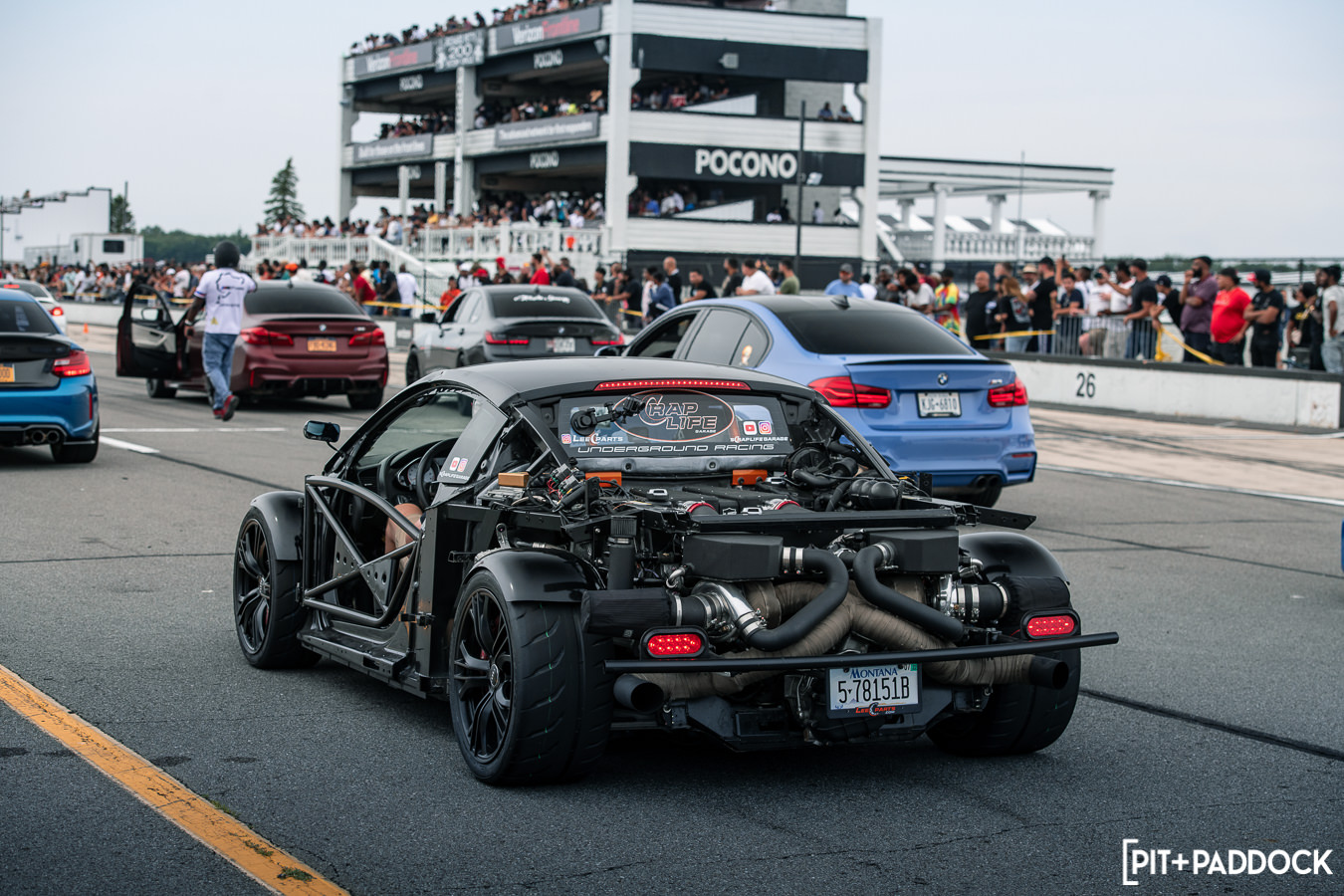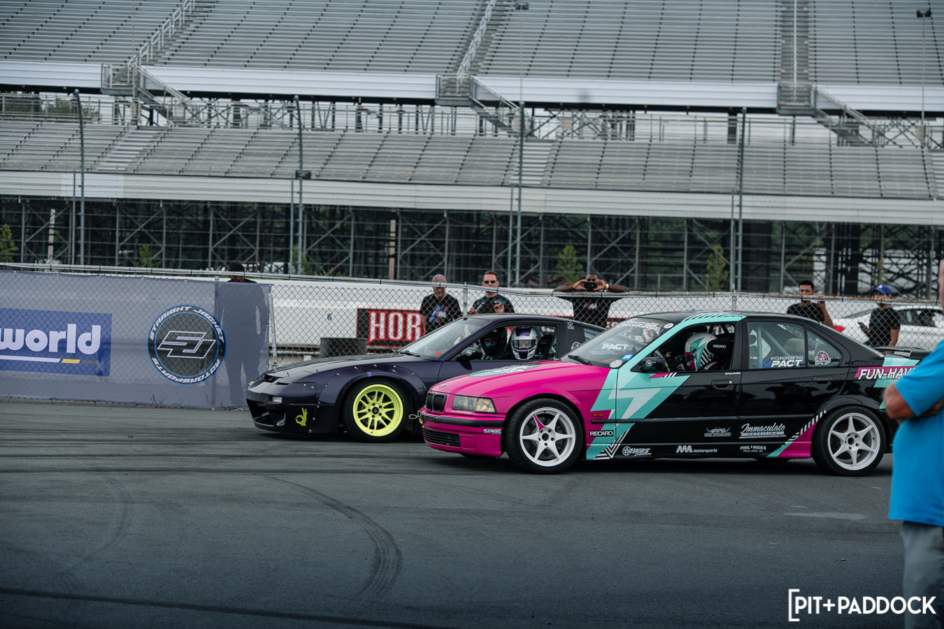 Like previous years, before any of the vendors were even finished getting set up, rows of cars quickly formed alongside the paddock area in preparation for roll racing. Taking full advantage of the dry weather and slightly cooler Pocono mountain temperatures, the track was busy all day with fans lining the pit lane to watch cars go head-to-head at speeds in excess of 170mph! At the same time, the guys participating in the NASA HPDE event and 14-year old drifter, Rhys Conklin, were enjoying the dry conditions as well. This year Rhys and his dad offered ridealongs to fans on the skidpad — Rhys in his LS-swapped #FunHaver E36 sedan and his dad in his LS-swapped Pandem/Rocket Bunny Nissan S13.