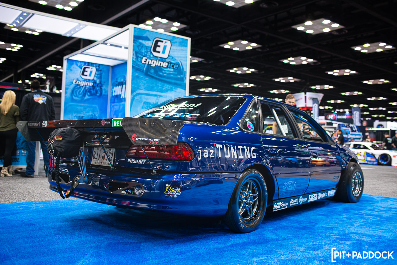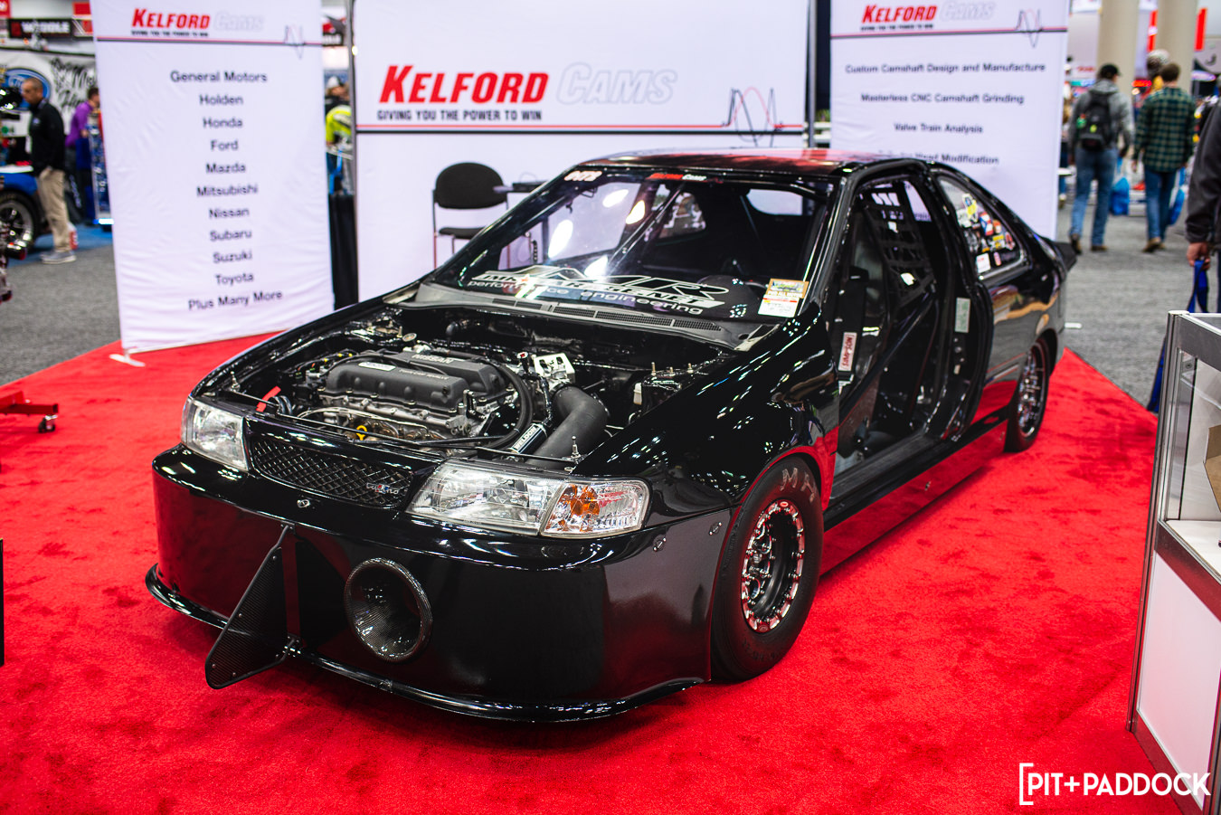 Fresh from its 9.1-second record-setting pass at this year’s World Cup Finals event, JMR Garage displayed its fastest naturally aspirated SR20 engine in the Kelford Cams booth, alongside its superb all-motor Sentra itself. Walking the aisles of PRI, it’s not uncommon to see a drag car garnering attention for a brand. What’s not expected is for sport compact drag racers to be the ones representing, let alone to see a Nissan Sentra. I admittedly wasn’t familiar with JMR Garage’s Sentra, and from far away, I found myself muttering, “Ooh, that looks like a nice EG coupe up there!” Except, of course, as I stepped closer, I noticed the valve cover looked strange for a Honda, and the body lines were all out of proportion. After a lengthy examination and some trips to YouTube, I have tons of respect for this beautiful build and what it has achieved.