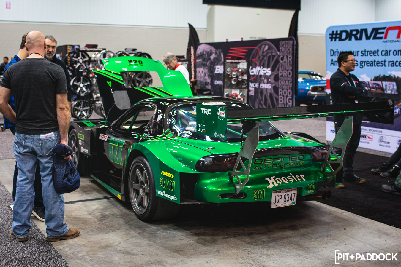 I mean, where can I even begin with this car? First of all, it’s gorgeous. Well done, Defined Autoworks! The unique widened body hosts an attractive livery, carbon fiber accents, and a professionally-designed carbon fiber front splitter system. Add to that, the magnesium centerlock JGTC-spec Volk Racing TE37 motorsports wheels, and the exterior is a real treat. Moving onto the engine bay, inside sits an incredible morsel of automotive heaven, a four-rotor Wankel engine. The custom-fabricated trimmings surrounding this sensation are nothing short of spectacular, as well. The interior is all business, mainly because this car actually gets driven and hard! That’s right, the little numbers on the body and those sticky Hoosiers are actually for something, hence its presence at the NASA booth. Oh, and I almost forgot my favorite part: the sound. Ugh, the sounds this car produced when leaving the convention center were incredible! I must not be the only one who thinks so, either. The Forza Motorsports video game series apparently used this car to sub-in when they recorded the glorious engine noises for the Mazda 787B racecar.
