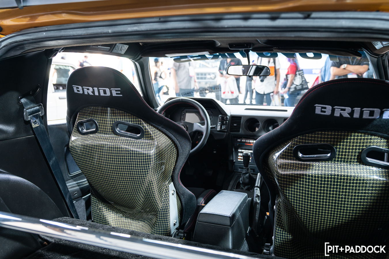 The body has some very subtle but significant changes. The rear bumper is stock but has been cut into seven pieces, shortened, and shaved. I wanted to get the proportions of the ‘90s GT-R bumpers, and it makes a huge difference. It’s several inches shorter than stock. The front bumper and hood had these thin trim pieces that stuck out, and those were bonded to the car and shaved. Lastly, the rear trim, U.S. side markers, and antenna were all shaved. JDM side markers were added, and the front end and side skirts have been updated to the ‘87-’89-spec. The interior is largely stock, but the main goal was to use the Bride Stradia II Kevlar seats as the fabric, similar to the Recaros used in the Z31 Shiro [Special]. The Kevlar ties into the intakes on the RB as well as picking up the yellow tones from the car a bit.