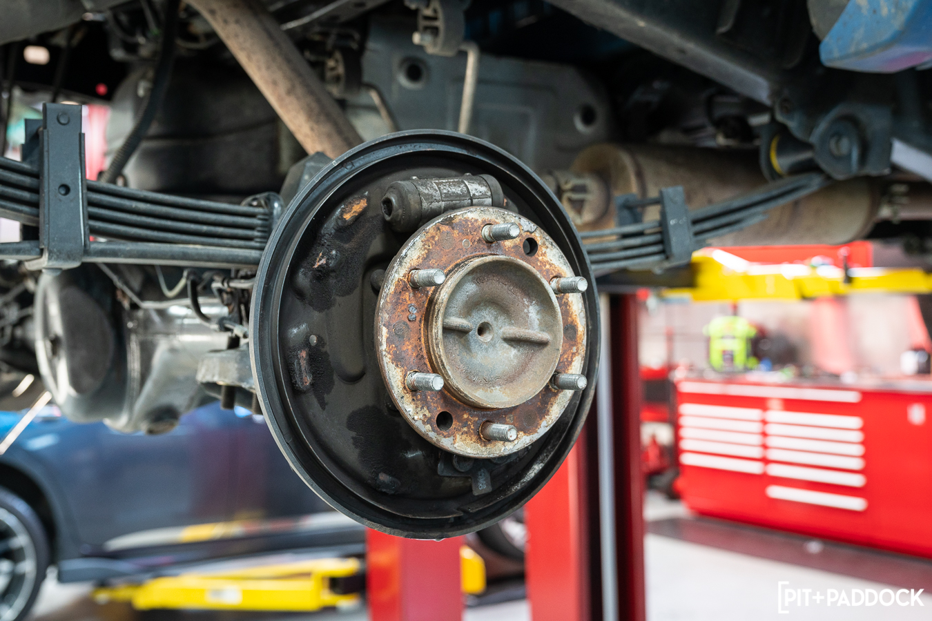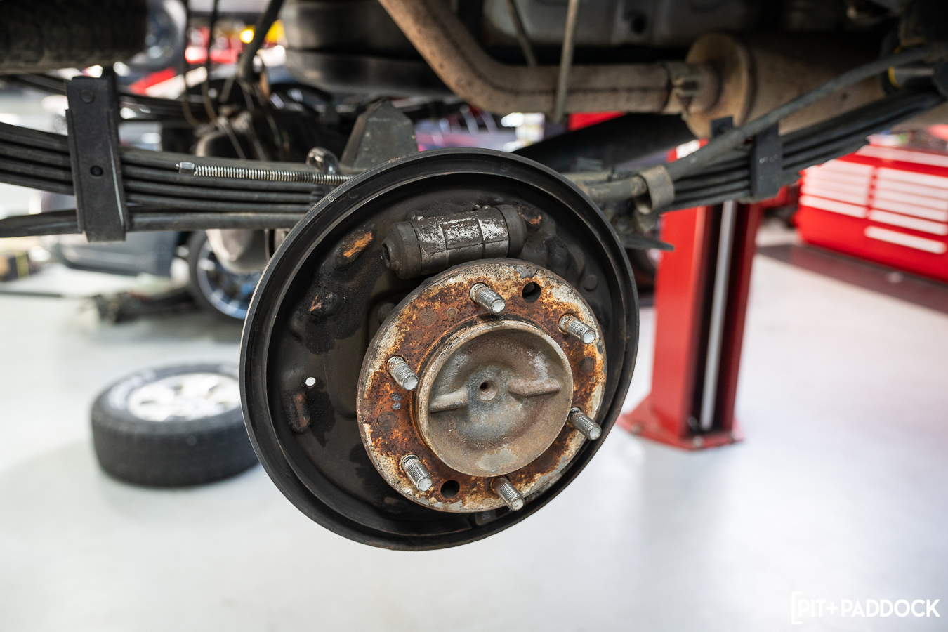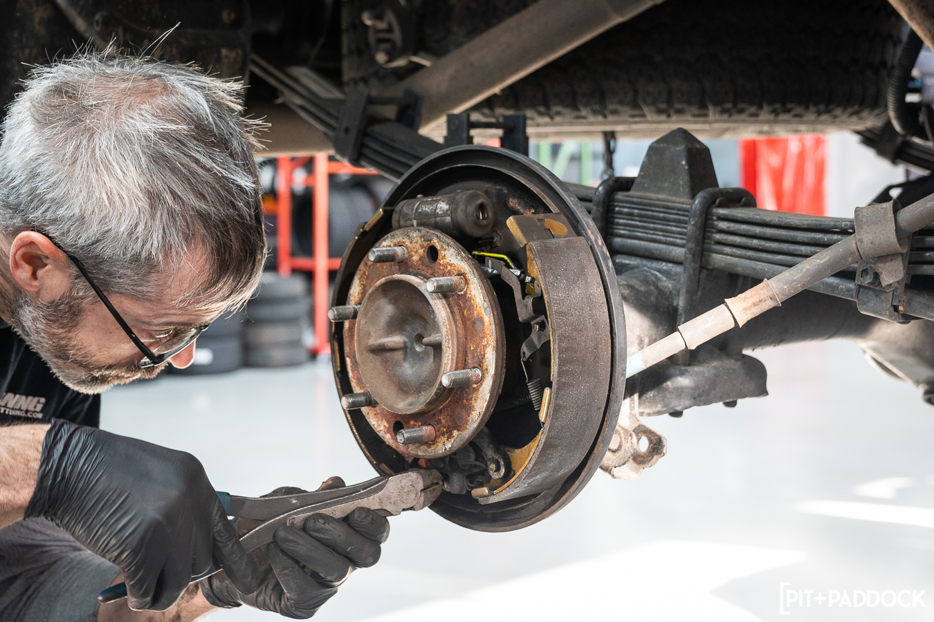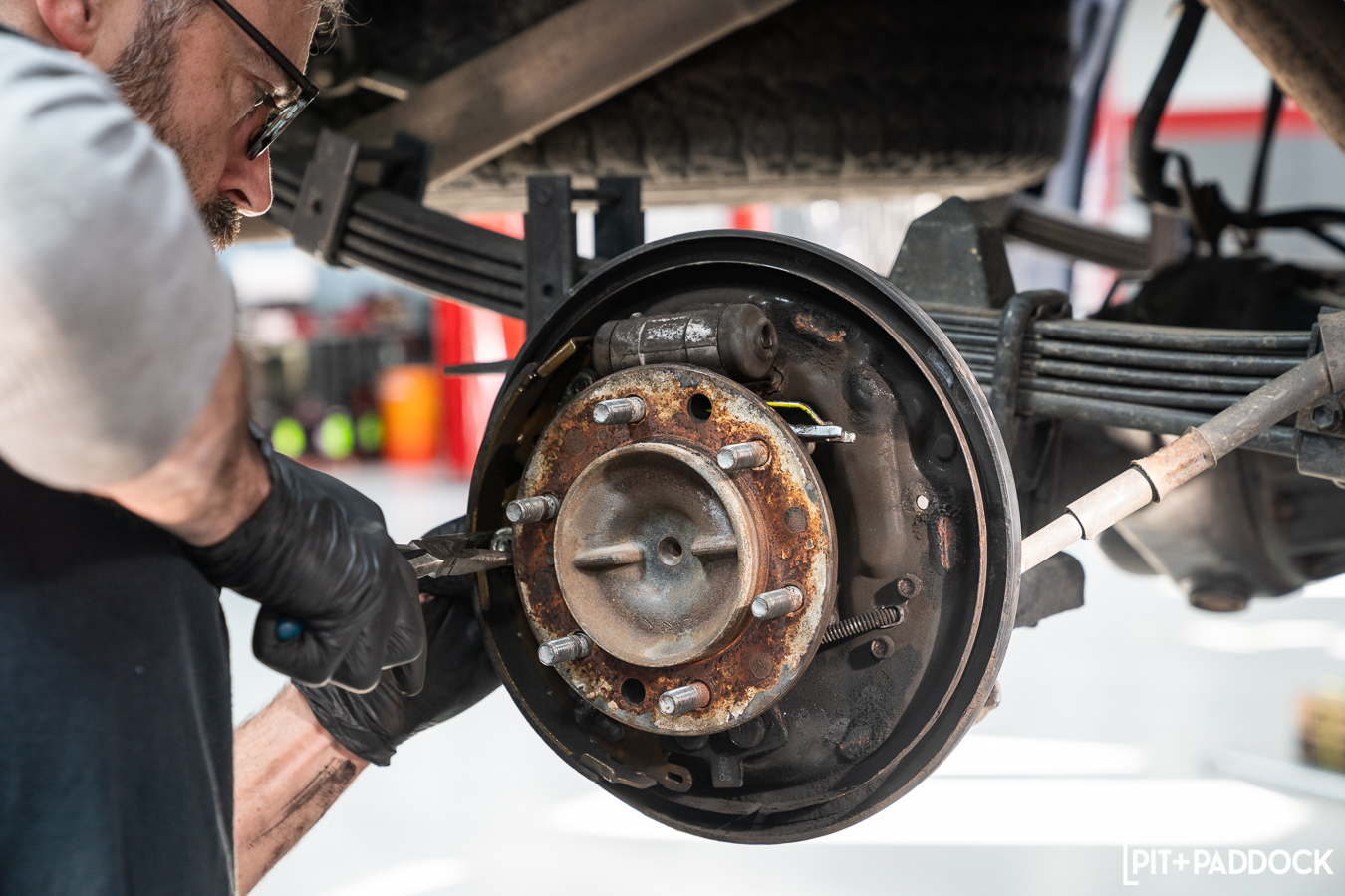First, Pat from R/T Tuning raised the truck into the air and removed the wheels. He pulled the rear differential’s fill and drain plug to release the fluid inside. Next, he removed the drum to access the components inside, which he also removed — along with the parking brake cable, hydraulic brake lines, and the wheel cylinder itself.