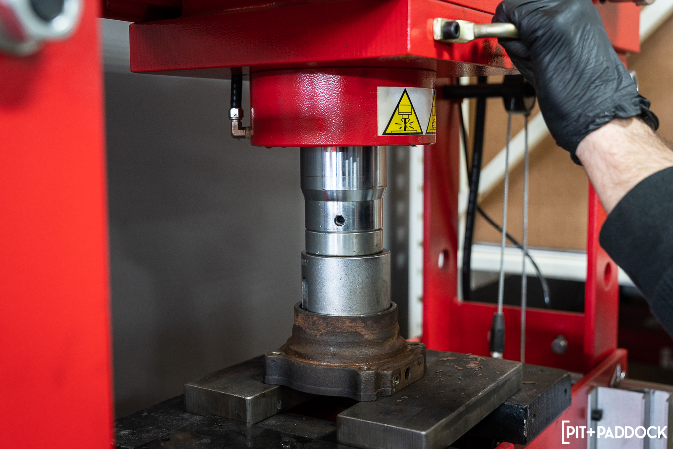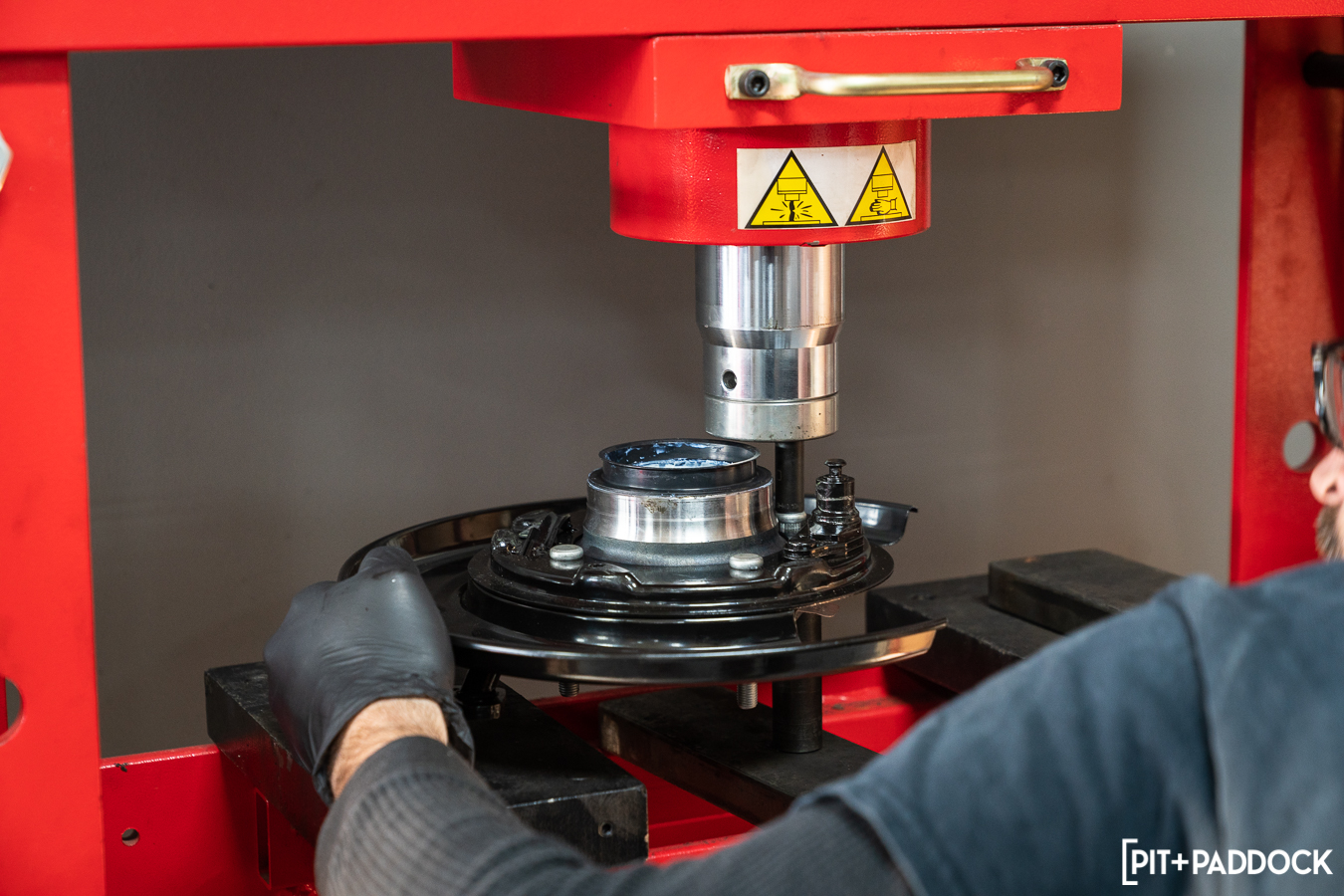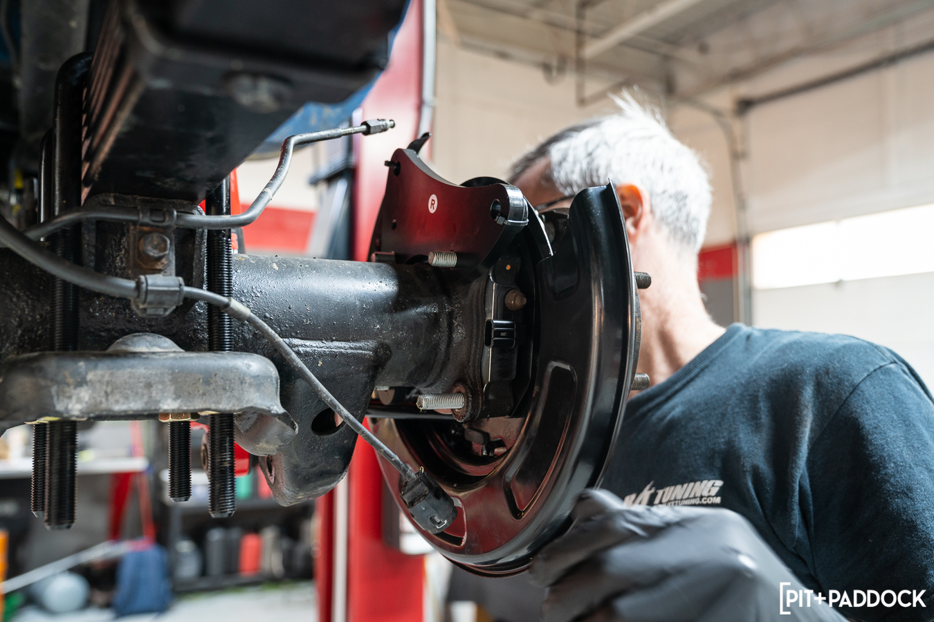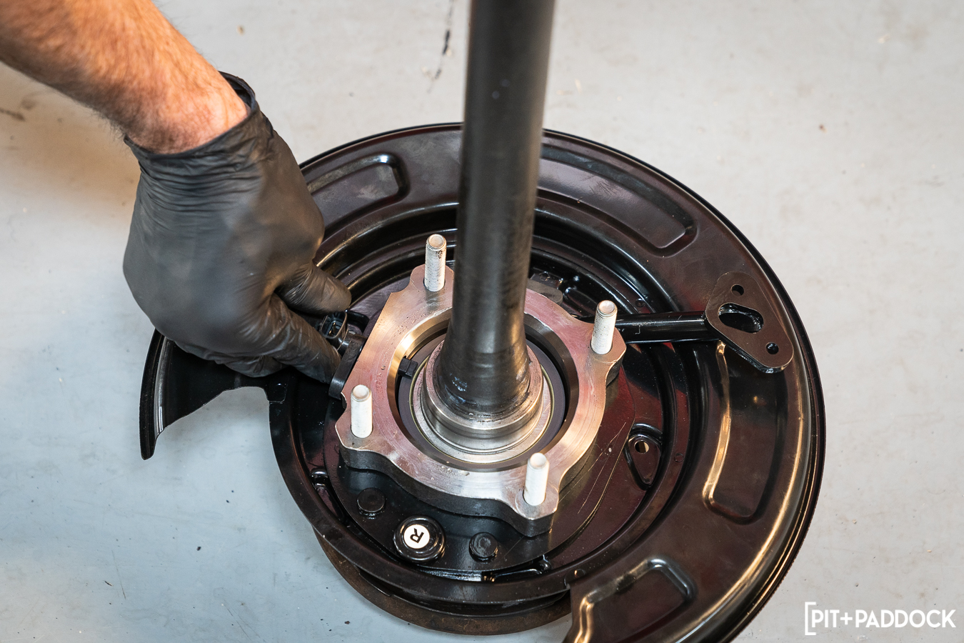 From there, he removed the axle flange bolts and carefully pulled the axle completely out. Once out, a visible circlip is next on the removal list before heading to the press. The bearing, housing, and backing plate are pressed out from their home on the OE unit and removed. You’ll need to reuse the OE wheel studs, retainer, and spacer, so don’t lose them or forget how they’re attached. Here is where you’d be back at the press, pressing the bearing from its housing to replace it with a new bearing. However, if you recall, we mentioned this kit includes damn near everything needed for installation — well, it doesn’t include wheel bearings. Pedders (and Pit+Paddock, and R/T Tuning) recommend replacing the wheel bearings during this conversion process. So, we opted for the less-risky (albeit more expensive) alternative of purchasing an OE bearing already in its housing rather than ordering just the replacement bearing itself. This option prevents any mishaps with pressing a new bearing in, reusing the old housing, or worse, reusing the old bearing.
