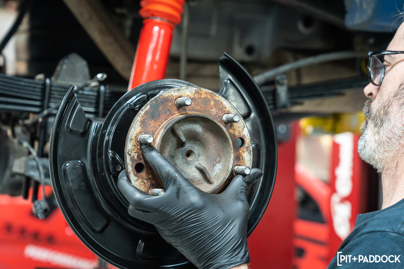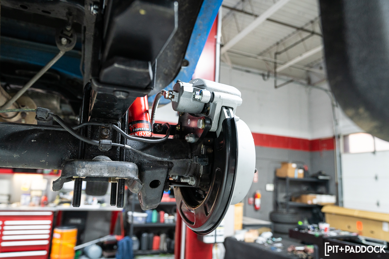 Then, it’s a bolt-on affair attaching all of the included brackets, hardware, emergency brake shoe assemblies and cable, rotors, calipers, and brake pads. With everything tightened to spec, adjusting the e-brake shoes’ tension, refilling the gear oil in the differential housing, and bleeding the entire brake system is the final step. During the road test, Pat bedded in the pads and checked the tension of the parking brake to finish it all off.
