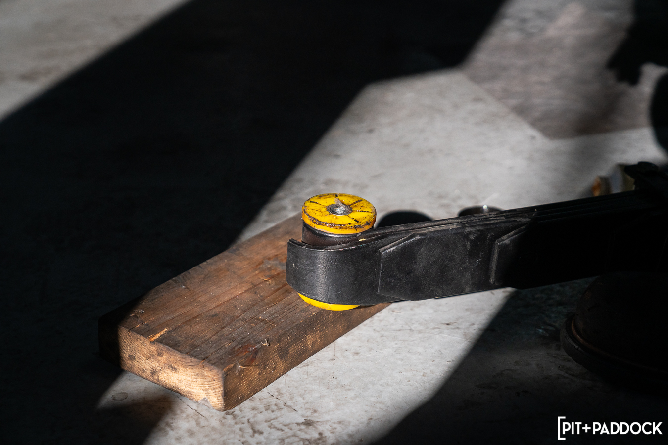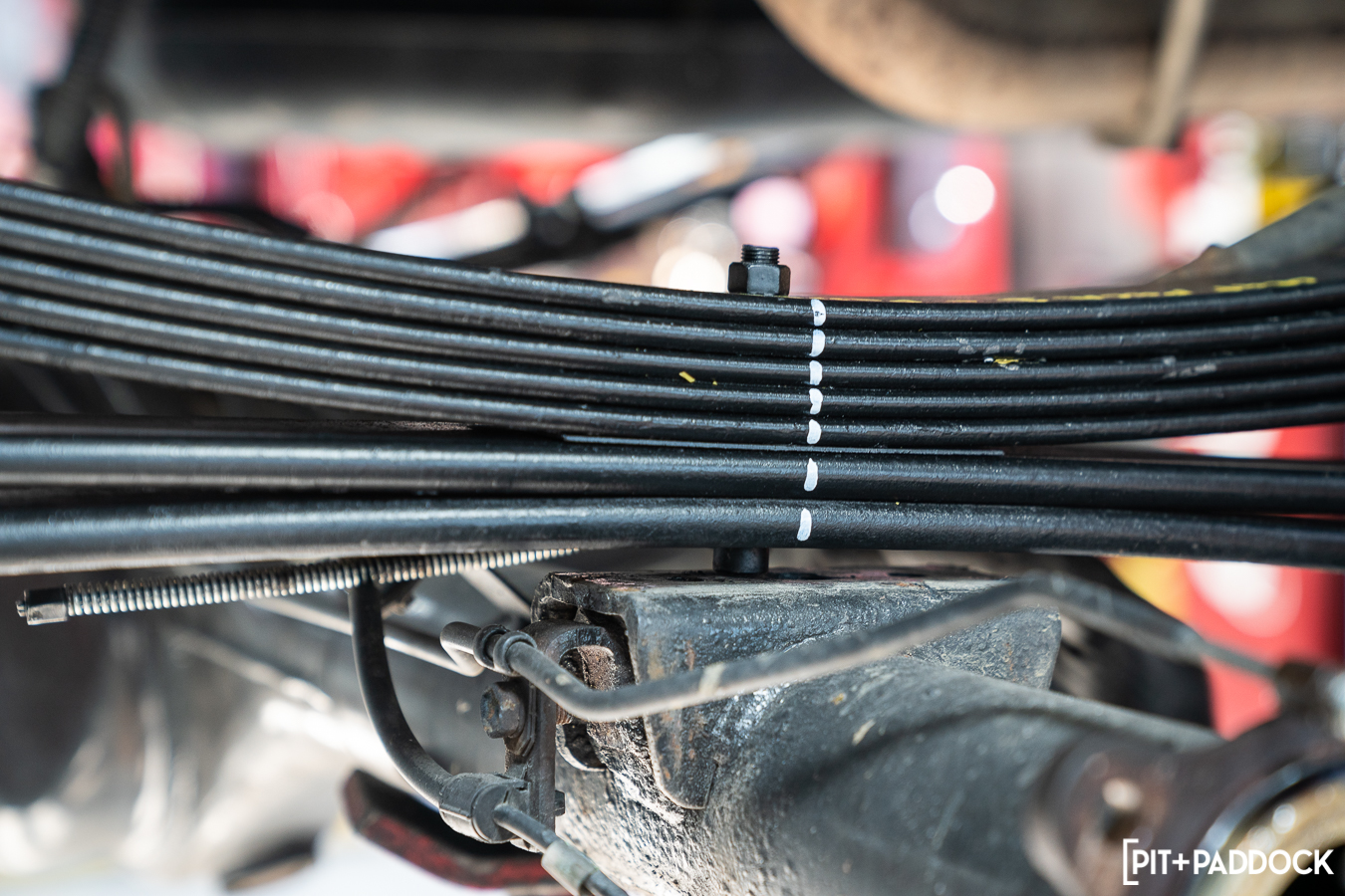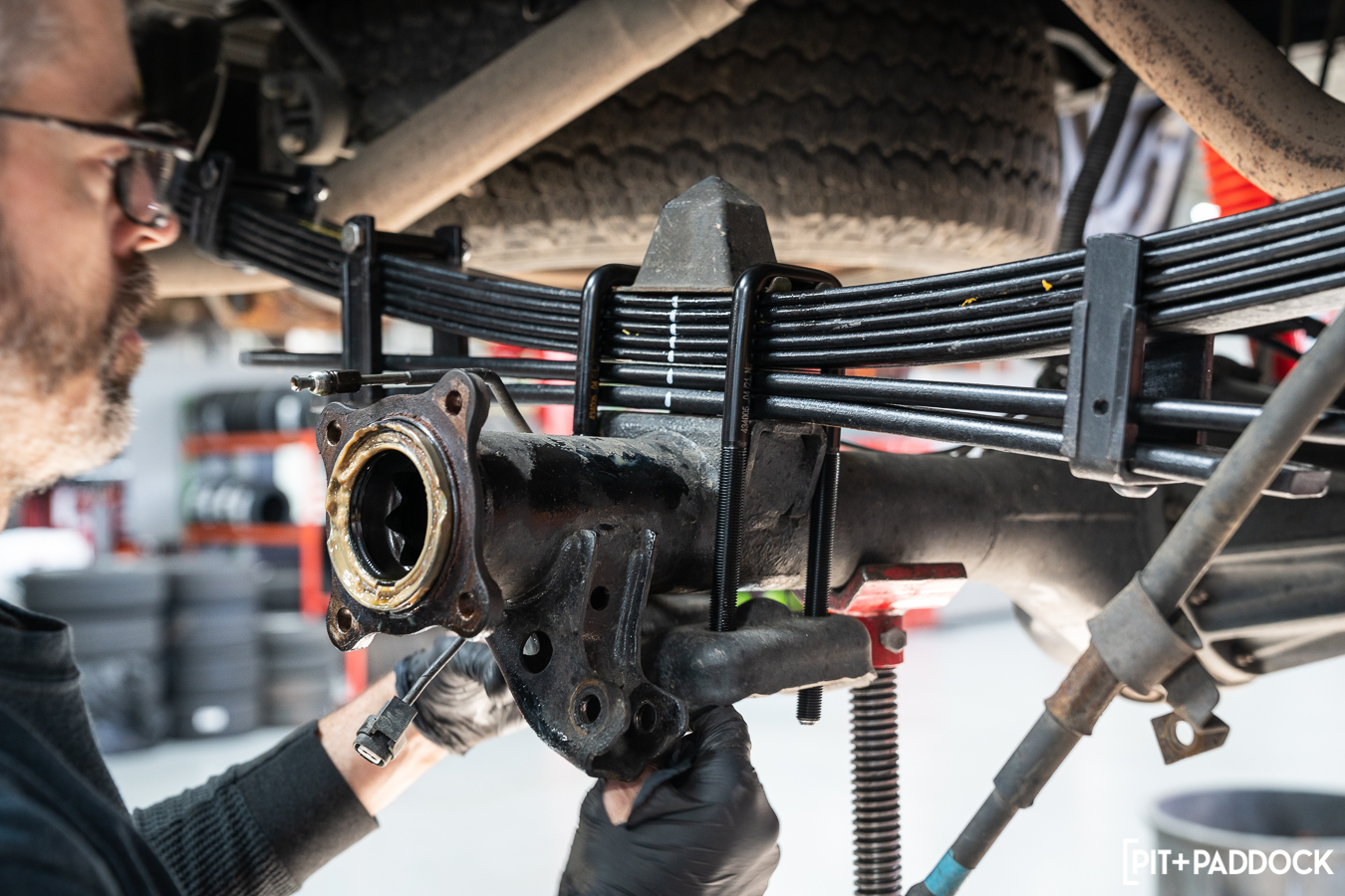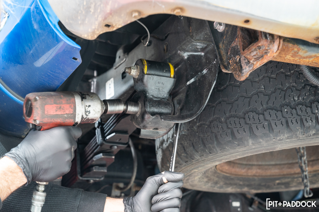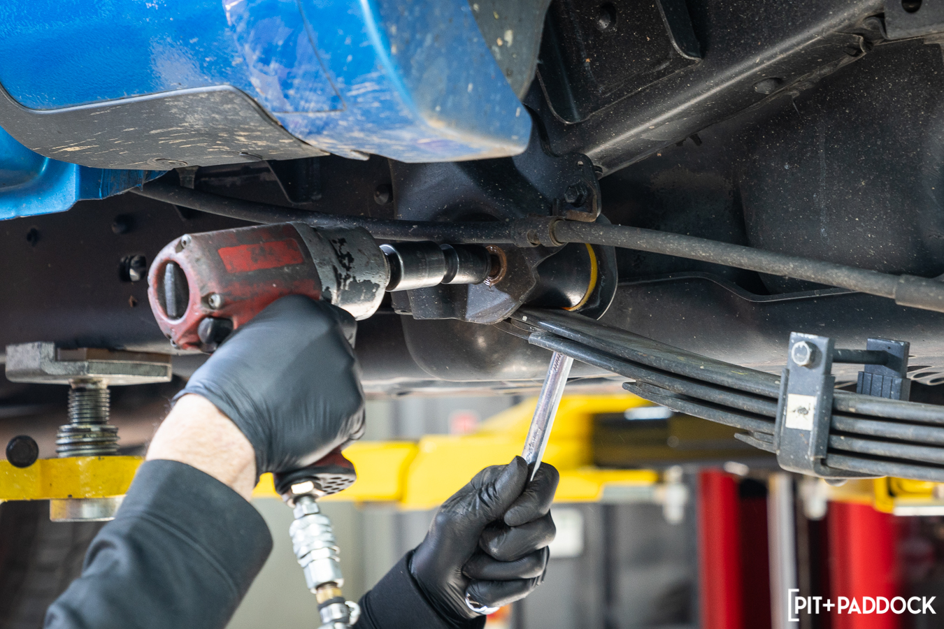 In the rear, the truck was already half apart due to the brake conversion and only needed a few more bolts removed to release the pieces of suspension we were replacing. As mentioned above, the eye bushings inside the leaf springs will have to be reused, but don’t fret; they just pull right out. Pat pushed them into the Pedders leaf spring with some grease and lifted the whole piece into place. Next, it was just the removal and replacement of the new rear shock, and just like the front, all bolts were torqued to spec. Replacing the wheels and tires was the final step of the installation.