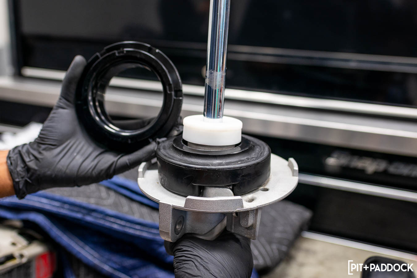 He took the assembly over to the spring compressor and released the top hat from its clutches on the factory spring. Next, the MSS-supplied polyurethane front spring seat was aligned into place. The seat uses specific cutouts that correspond with the factory spring perch design and fit snugly into one precise position. Continuing on, he added the CNC-machined front ride height adjuster before combining the orange spring, factory dust shield, and top hat assembly onto the shock and torquing to spec. The front unit was tightened into its OE location, the process was repeated on the other side, and this installation was officially half-finished.