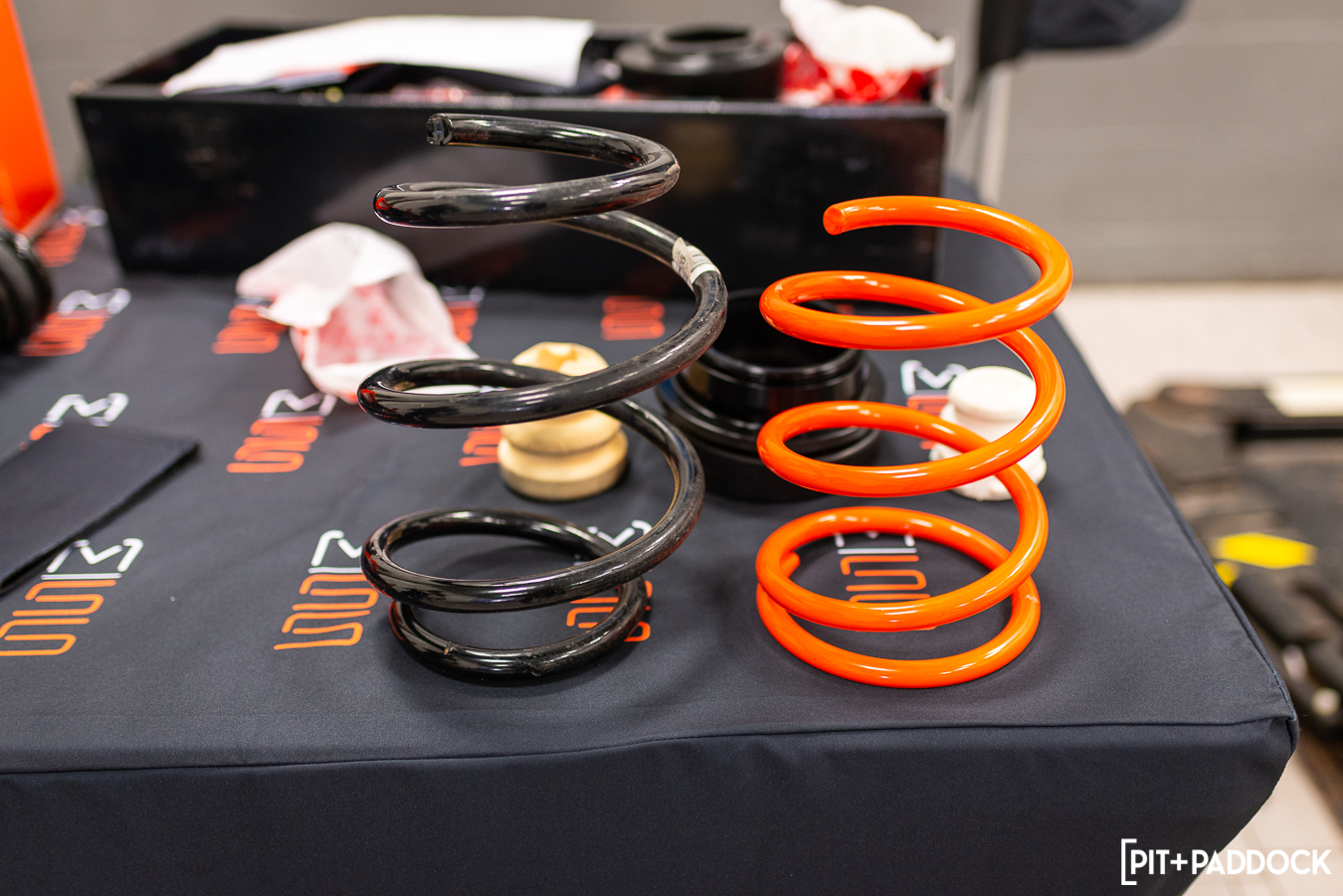 The single-rated, heavy-duty orange spring stabilizes the vehicle on the CNC-machined rear ride adjuster, which sits on a multi-rate black spring in the rear so that neither spring has to compromise its ability to handle different scenarios. If single-rate springs made up the kit, it would be good in one instance but sacrifice either ride quality or performance in others. This stacked solution gives the best of all worlds without sacrifice.