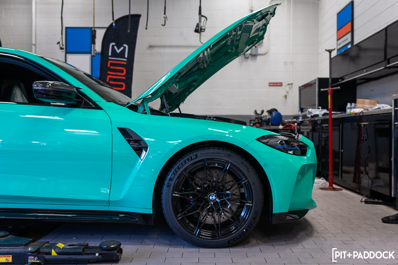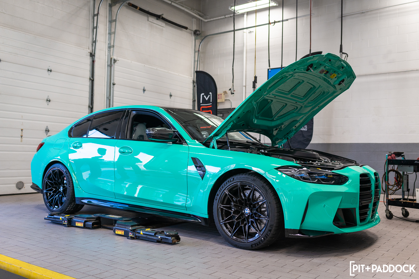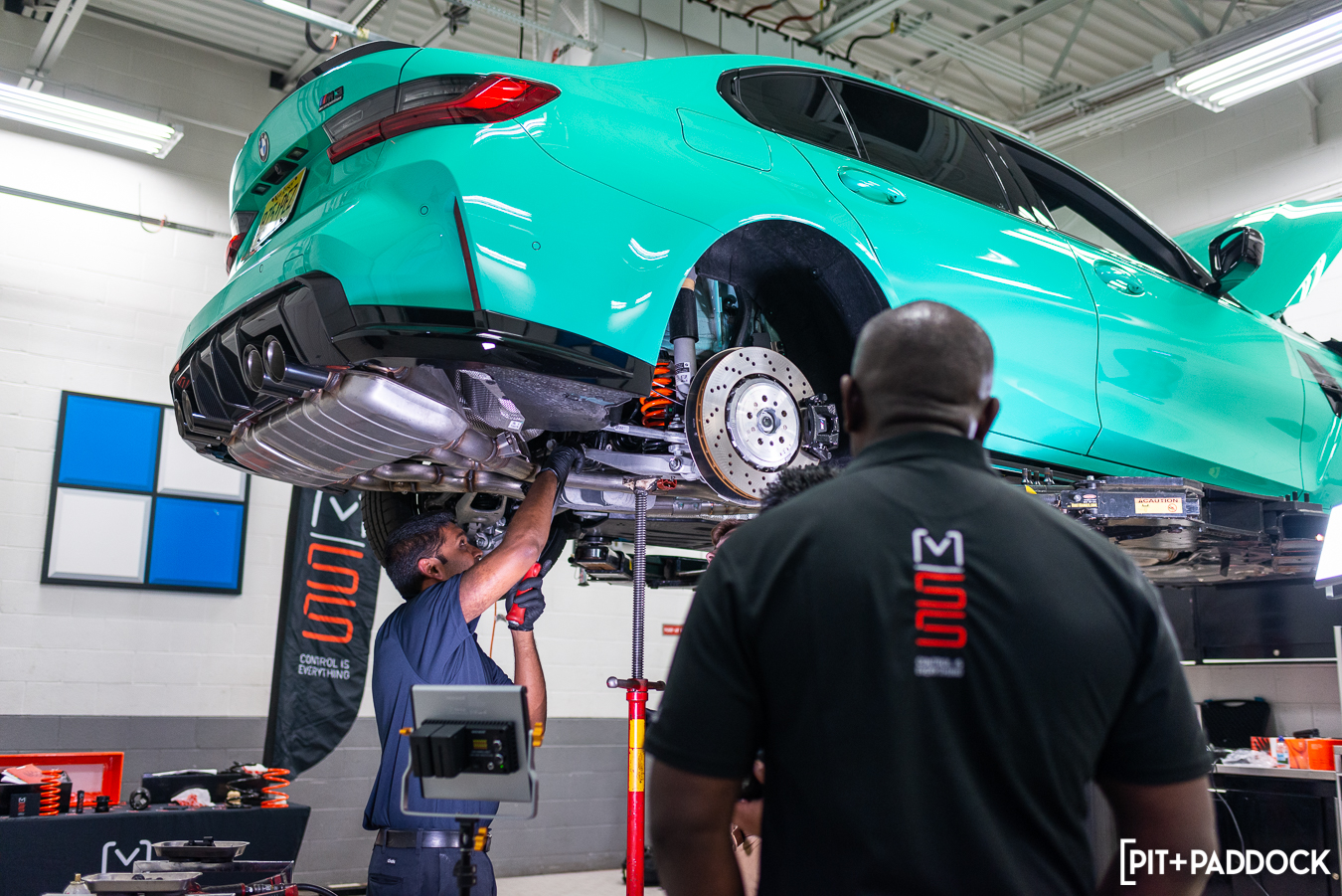 With everyone fueled up, we took a walk to the back of Thompson BMW’s service area, where a tidy MSS product table was constructed, and the main focus of our day, a 2022 BMW Individual Mint Green G80 M3 Competition, was on display in the bay. Veteran BMW technician, Mike, removed the stock wheels and tires from the car and then removed the G80’s stock front suspension.