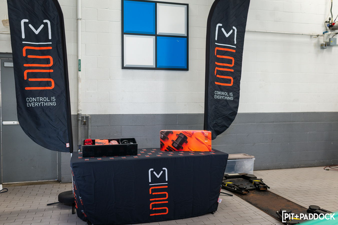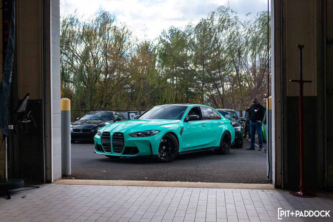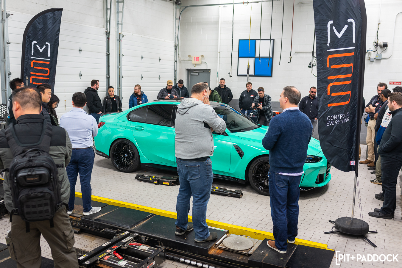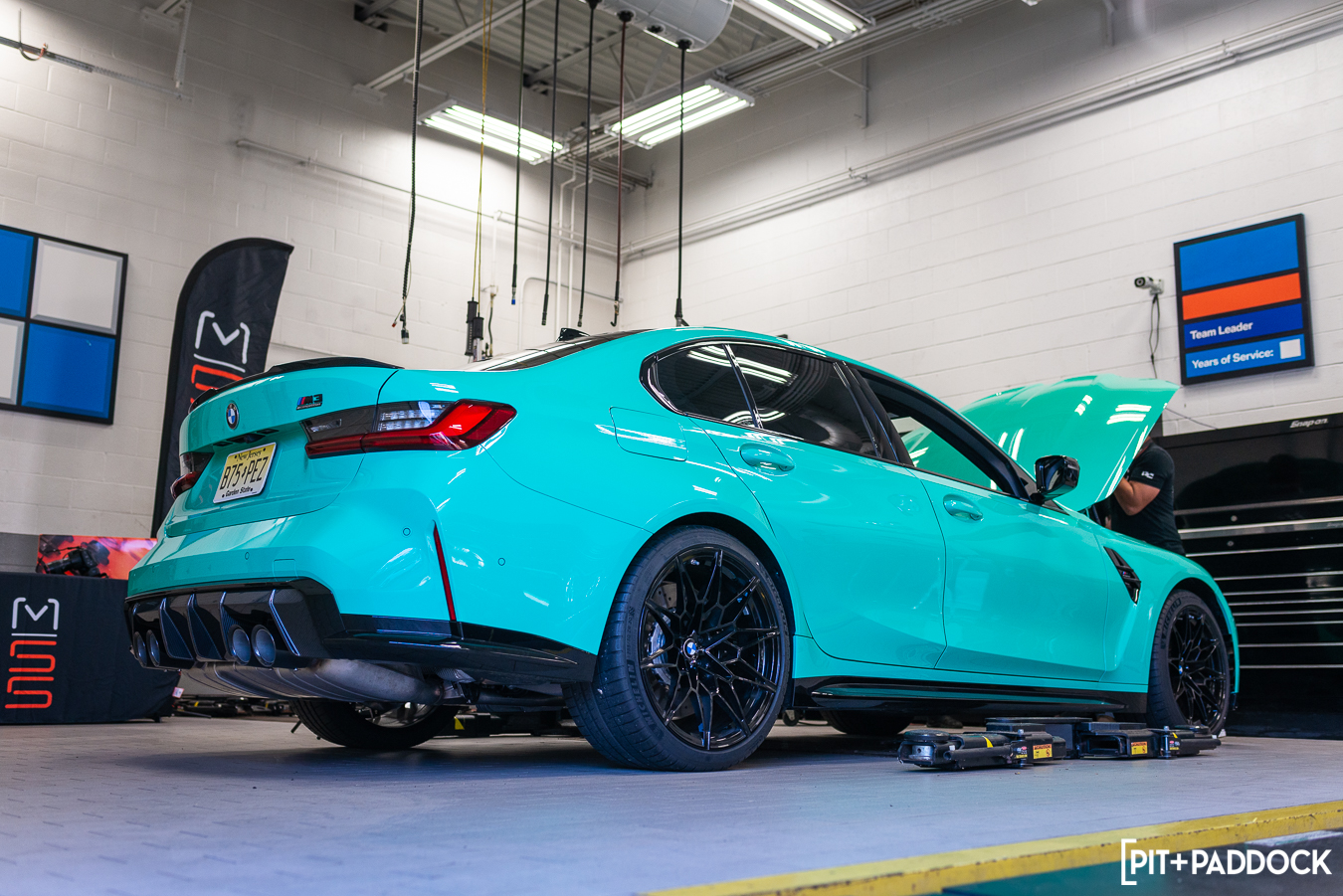 With everyone fueled up, we took a walk to the back of Thompson BMW’s service area, where a tidy MSS product table was constructed, and the main focus of our day, a 2022 BMW Individual Mint Green G80 M3 Competition, was on display in the bay. Veteran BMW technician, Mike, removed the stock wheels and tires from the car and then removed the G80’s stock front suspension.