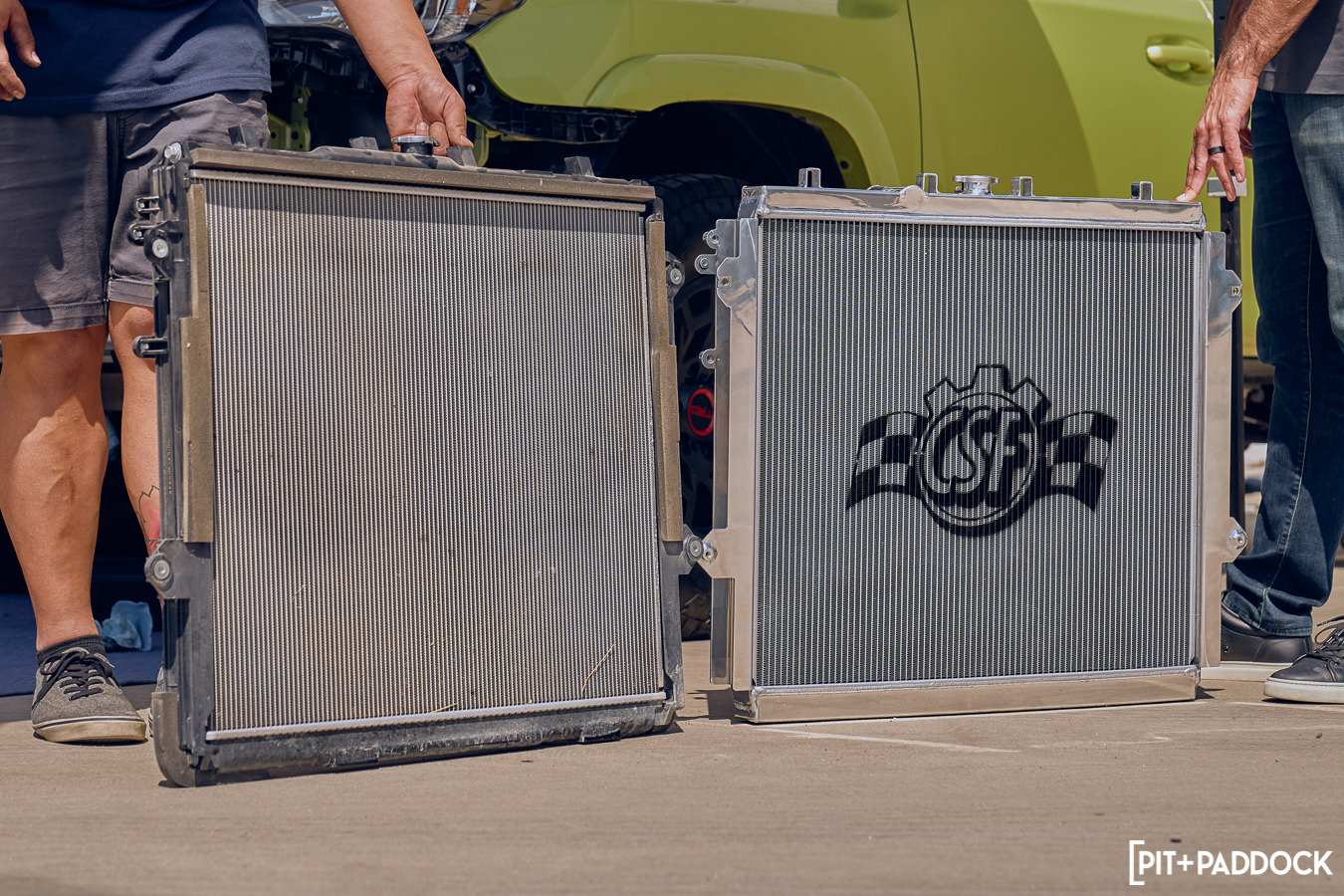 Over the last two weeks, we have introduced you to our latest project vehicle – this 2022 Toyota 4Runner TRD Pro in Lime Rush green. Together with our collaboration partner, CSF, the plan is to build the 4Runner into a more serious off-road rig with the goal of debuting the final look at a special Pit+Paddock Cars+Coffee: Overland Edition pop-up event at CSF headquarters in Rancho Cucamonga, California. So far, we’ve successfully added basic bolt-on upgrades such as an Airaid intake, throttle body spacer, and Pedal Commander controller (you can read all about it here). We’ve made some solid headway this week by installing a CSF radiator, Westin front bumper, and Superwinch winch.