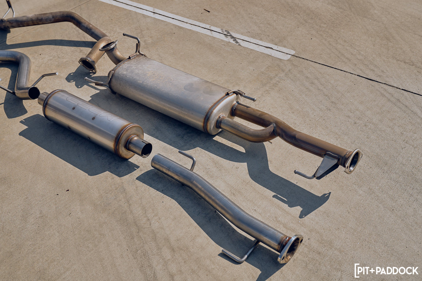 Performance should see a nice bump with a freer-flowing muffler and 2.5-inch diameter tubing as opposed to the stock 2.25-inch system. The improved airflow will complement the Airaid intake we added last week.