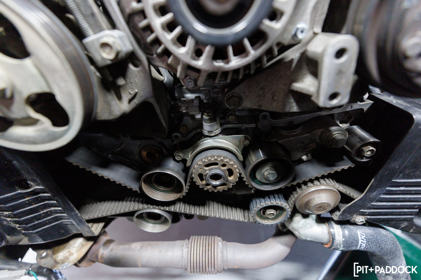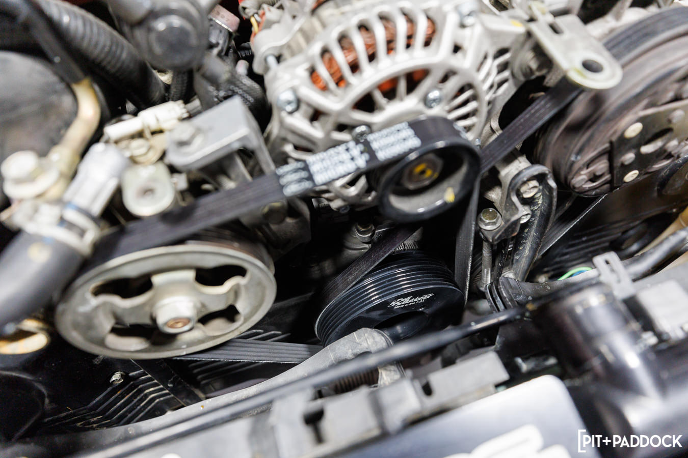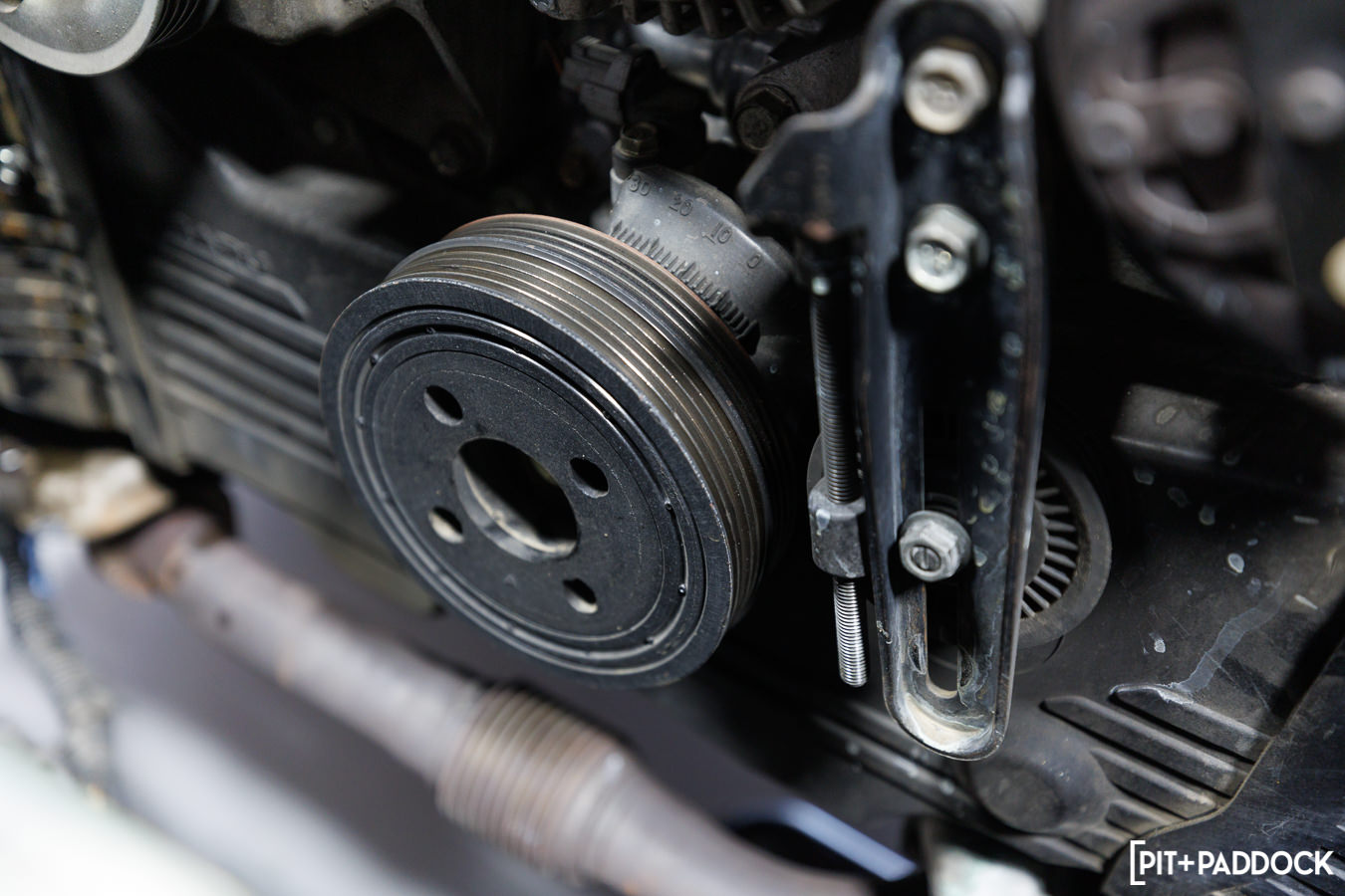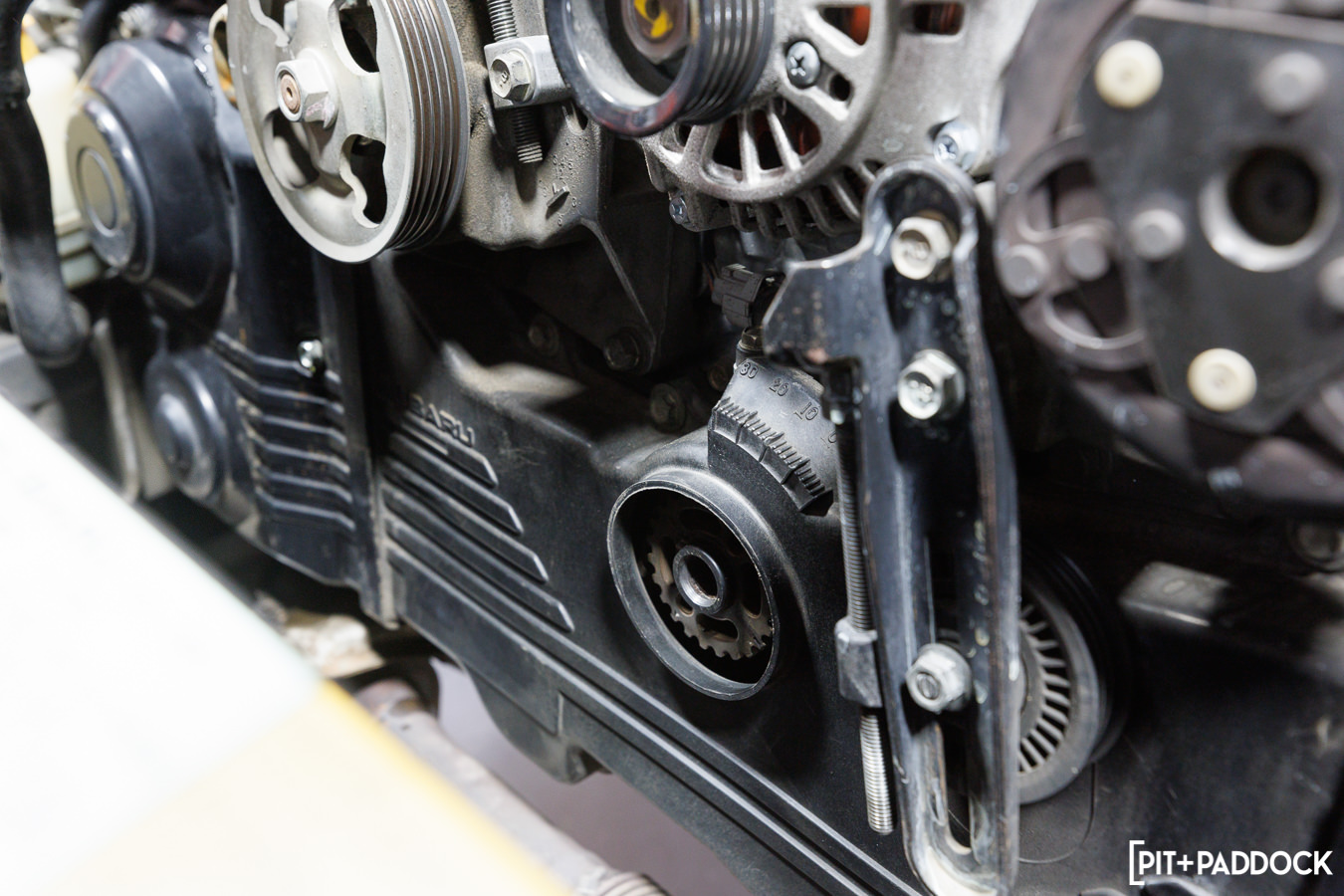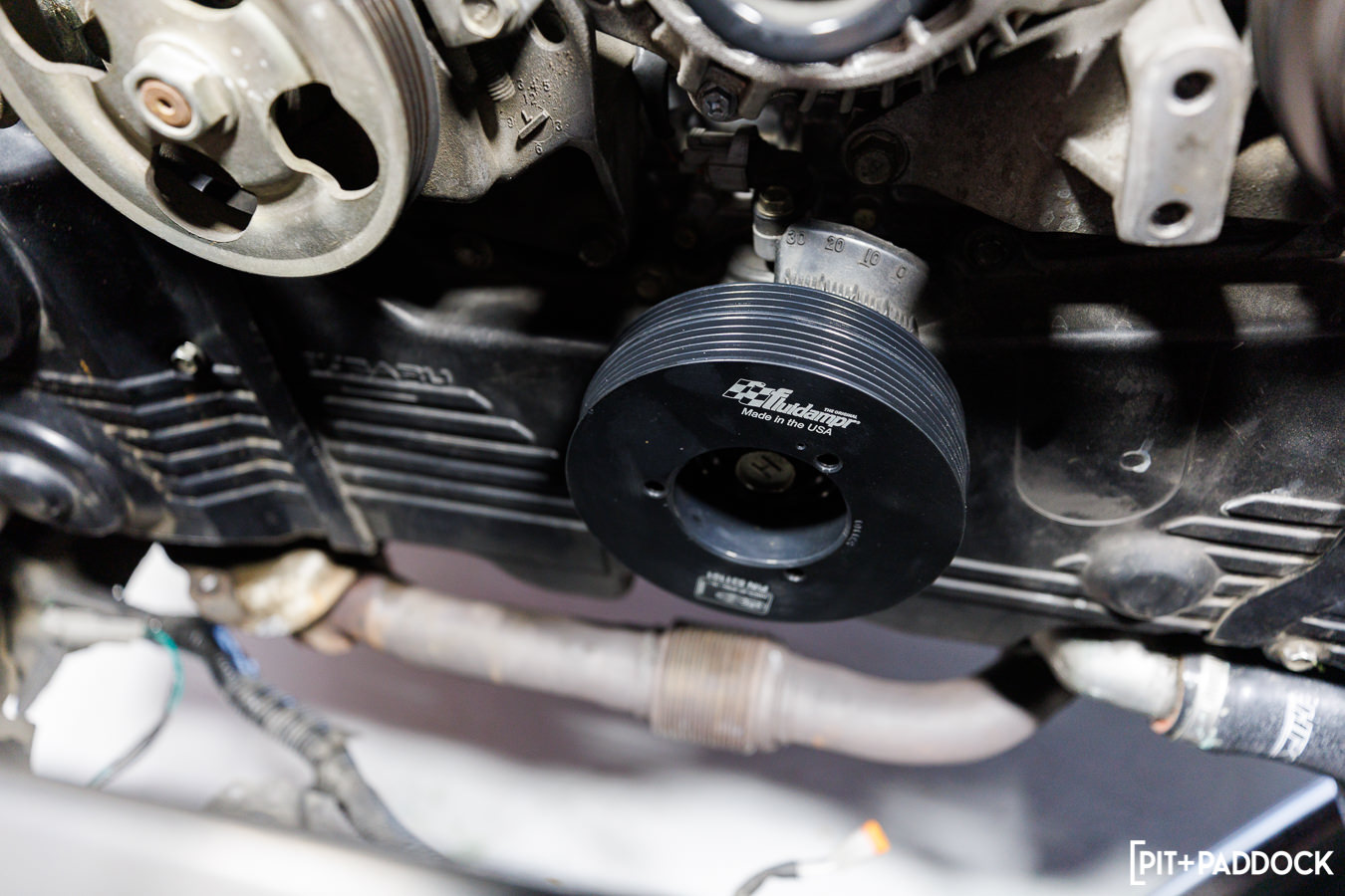 With the trimmed timing cover back in place, it was time to reverse the previous steps with the addition of the new Fluidampr. The single keyway and engraved timing mark on it make alignment easy. Once in place, they torqued the Fluidampr to spec (either 95 lb-ft or 130 lb-ft, for USDM and JDM, respectively) as the factory service manual recommends.