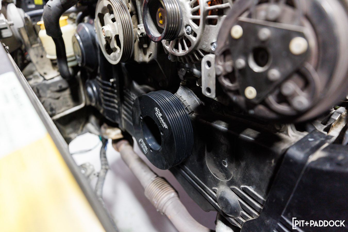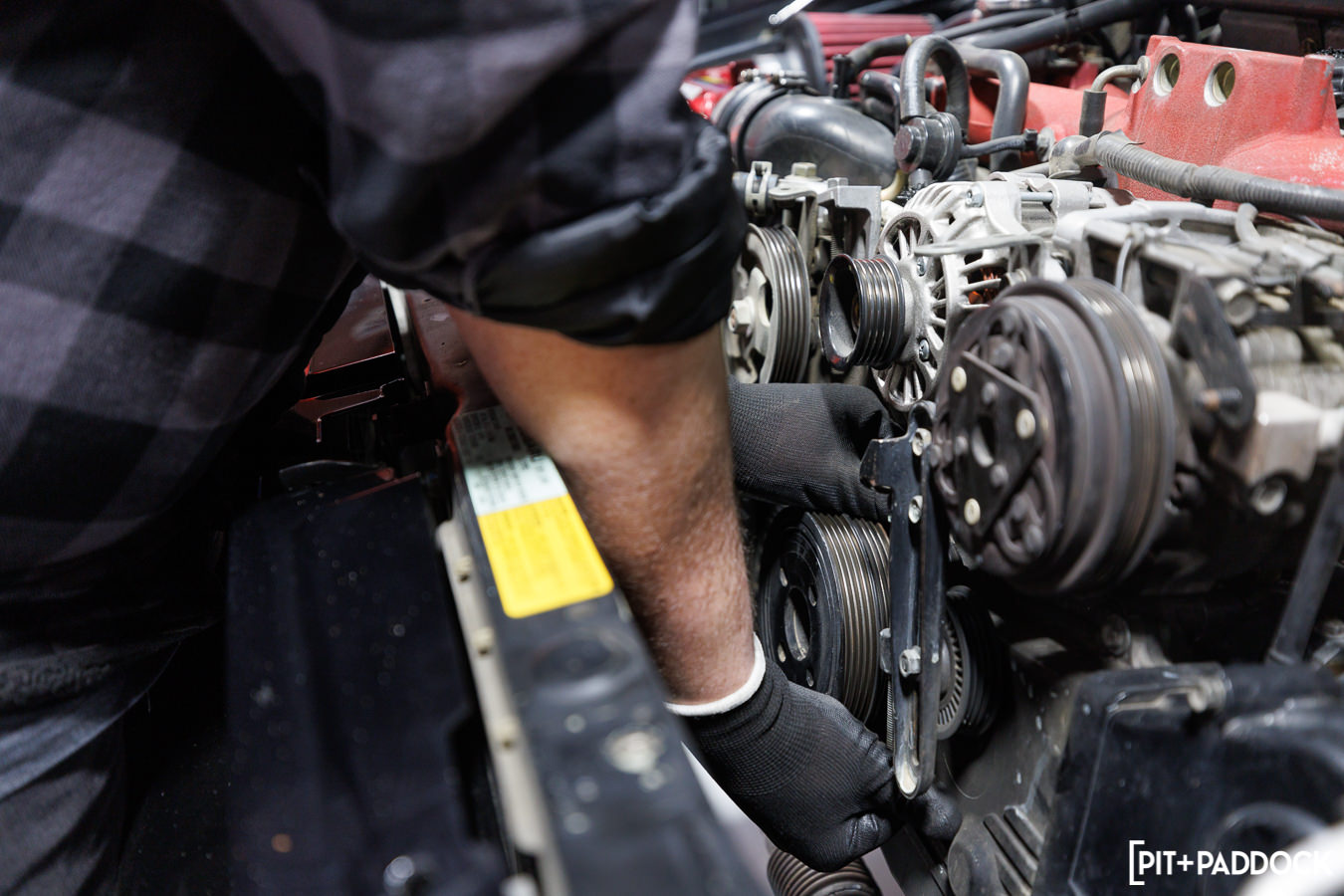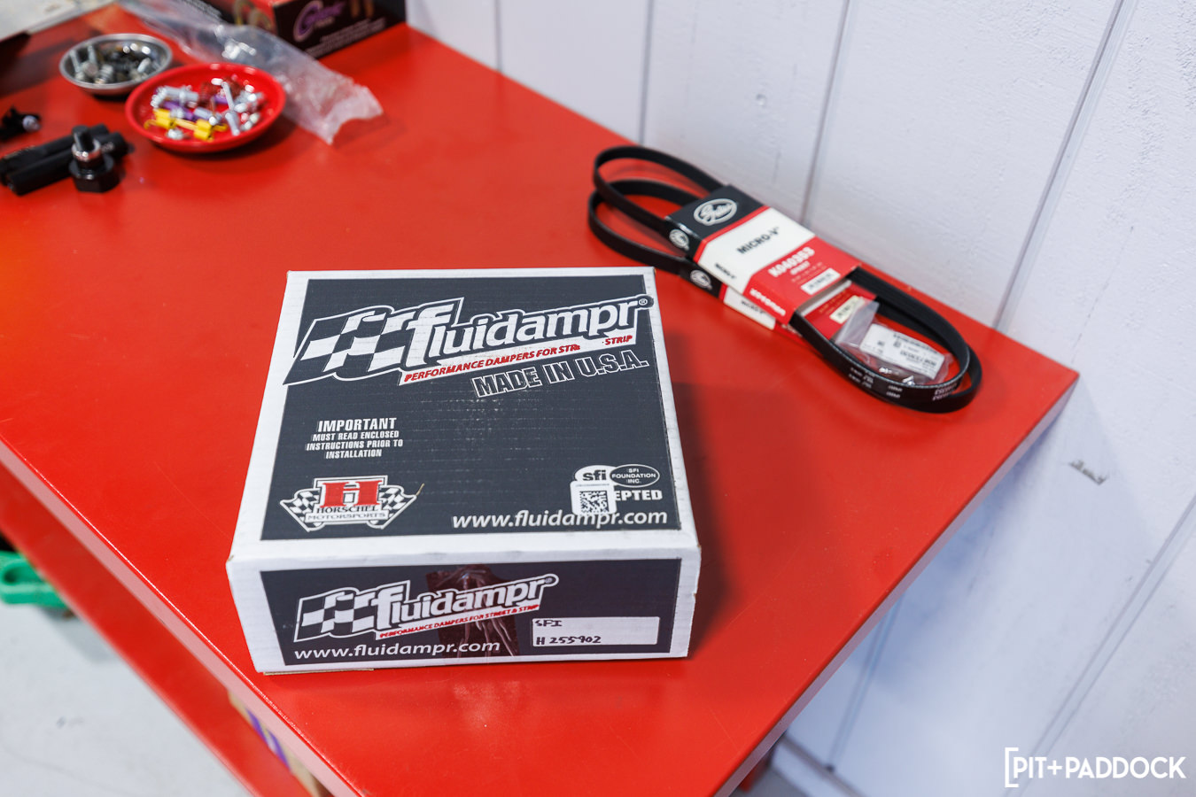 Like any other modification, we begin the Fluidampr installation process at his friend’s garage, prepping the workspace and removing the factory pieces. First off, they drained the engine’s coolant to enable the removal of the radiator and fans. This step provides easy access to the belts and pulleys located at the front of the engine. Next, they loosened both belt tensioners, removed the belts, and used a breaker bar to remove the factory crankshaft pulley.