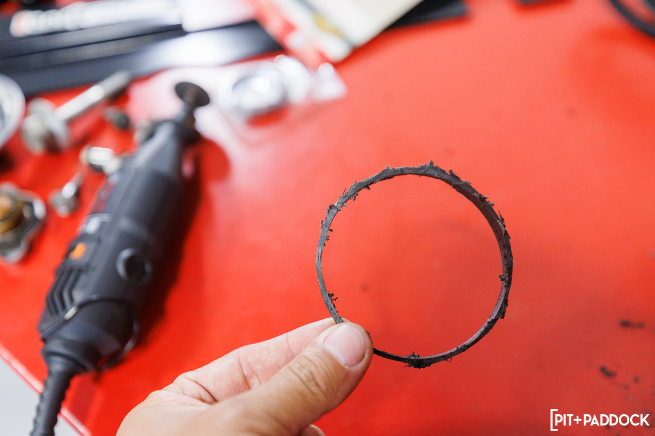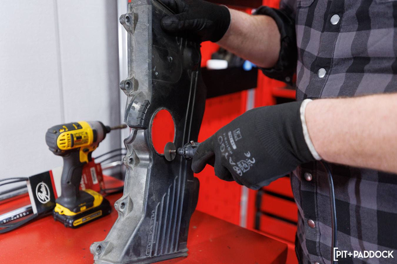 If it weren’t for this next phase of the installation, the whole process would already be half completed. Still, it’s not much of an intense step, but it is a necessity — trimming the timing cover. Fluidampr includes fully detailed instructions with the damper for this step. With the factory balancer removed, the timing cover must also be removed, then follow the directions and either grind, cut, or trim the lip of the timing cover to sit flush with the rest of the piece’s surface. This relief allows clearance for the back of the Fluidampr.