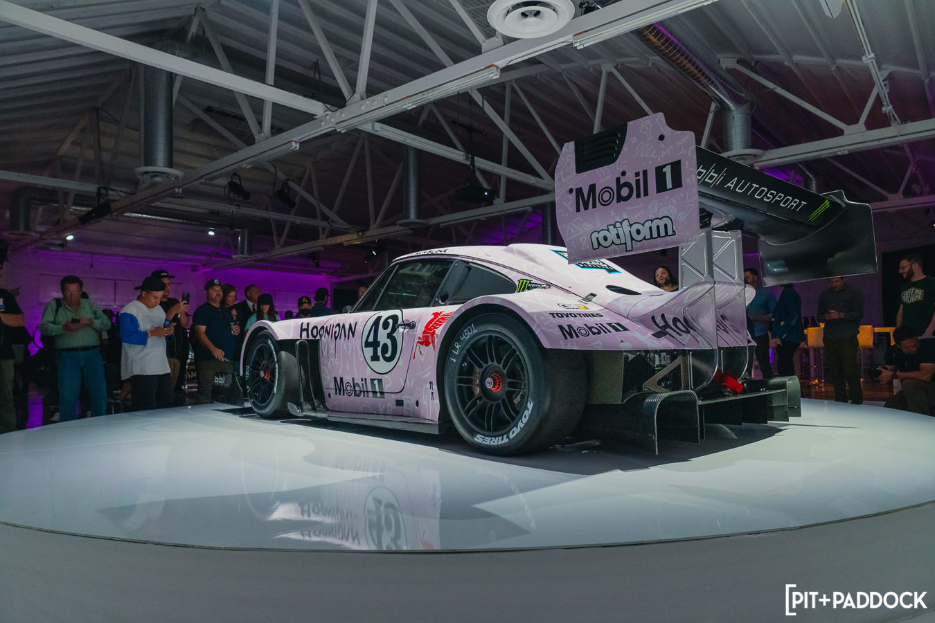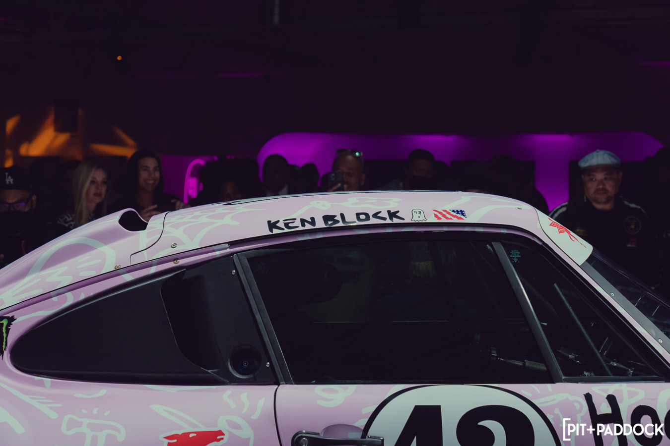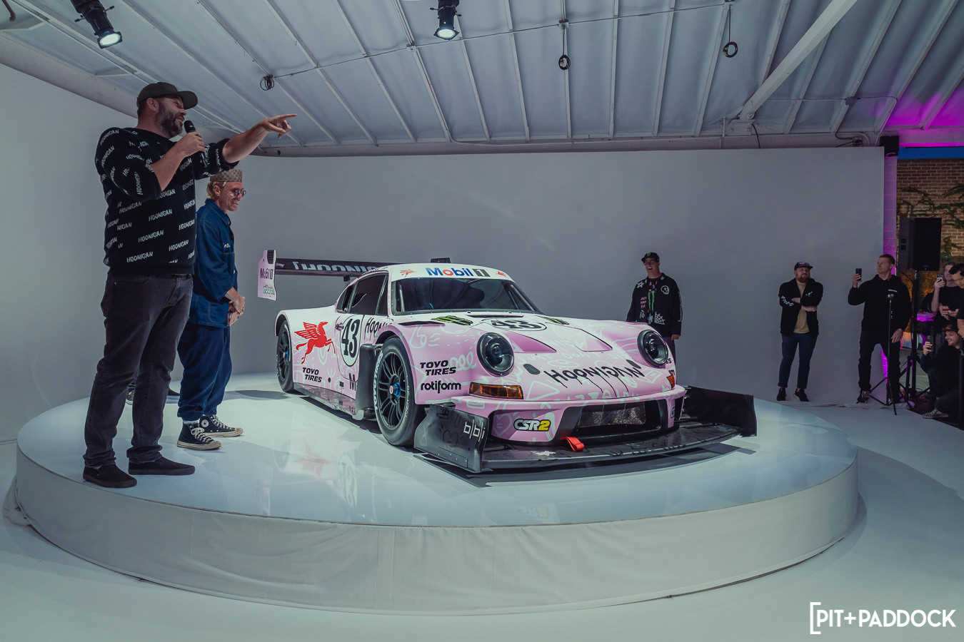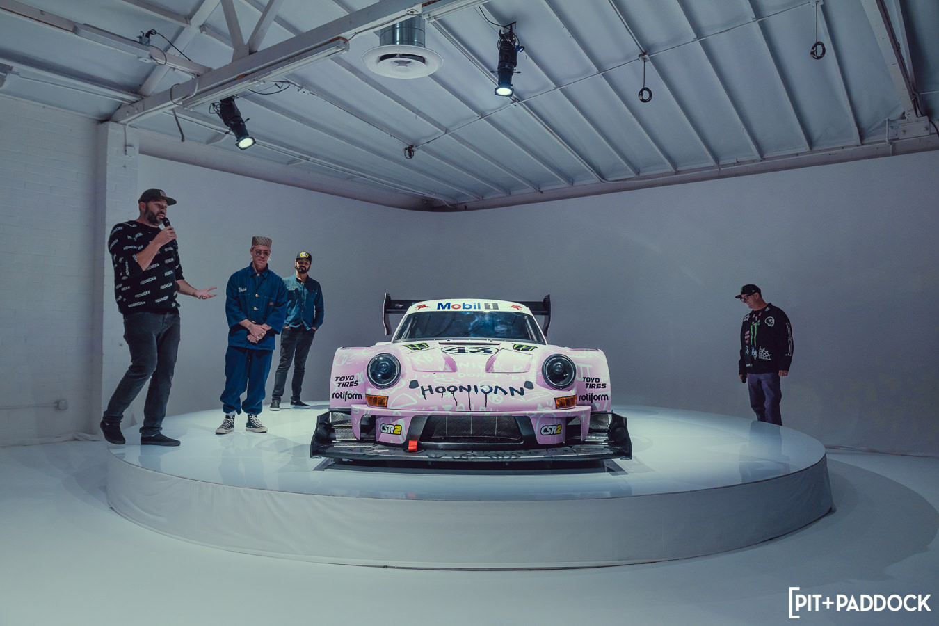 Last night, the gang at Hoonigan invited Pit+Paddock to a private party in downtown LA to witness the unveiling of the “Hoonipigasus” (that’s Hoon-Ni-Pig-A-Sus). Sadly, the BBI Autosport-built 4.0-liter twin-turbo 911 wasn’t running yet, with things like the wiring and tuning incomplete. But on the outside, the mega-wide Porsche is nothing short of glorious. Its carbon/Kevlar aero is hill climb ready. Its unique livery, designed by artist Trevor Andrew aka Guccighost, pays homage to one of the most iconic race cars in Porsche Motorsport history – the 1971 917/20 “Pink Pig.” The whole shebang weighs a mere 2,200lbs (approximately 63.6 power-to-weight ratio).