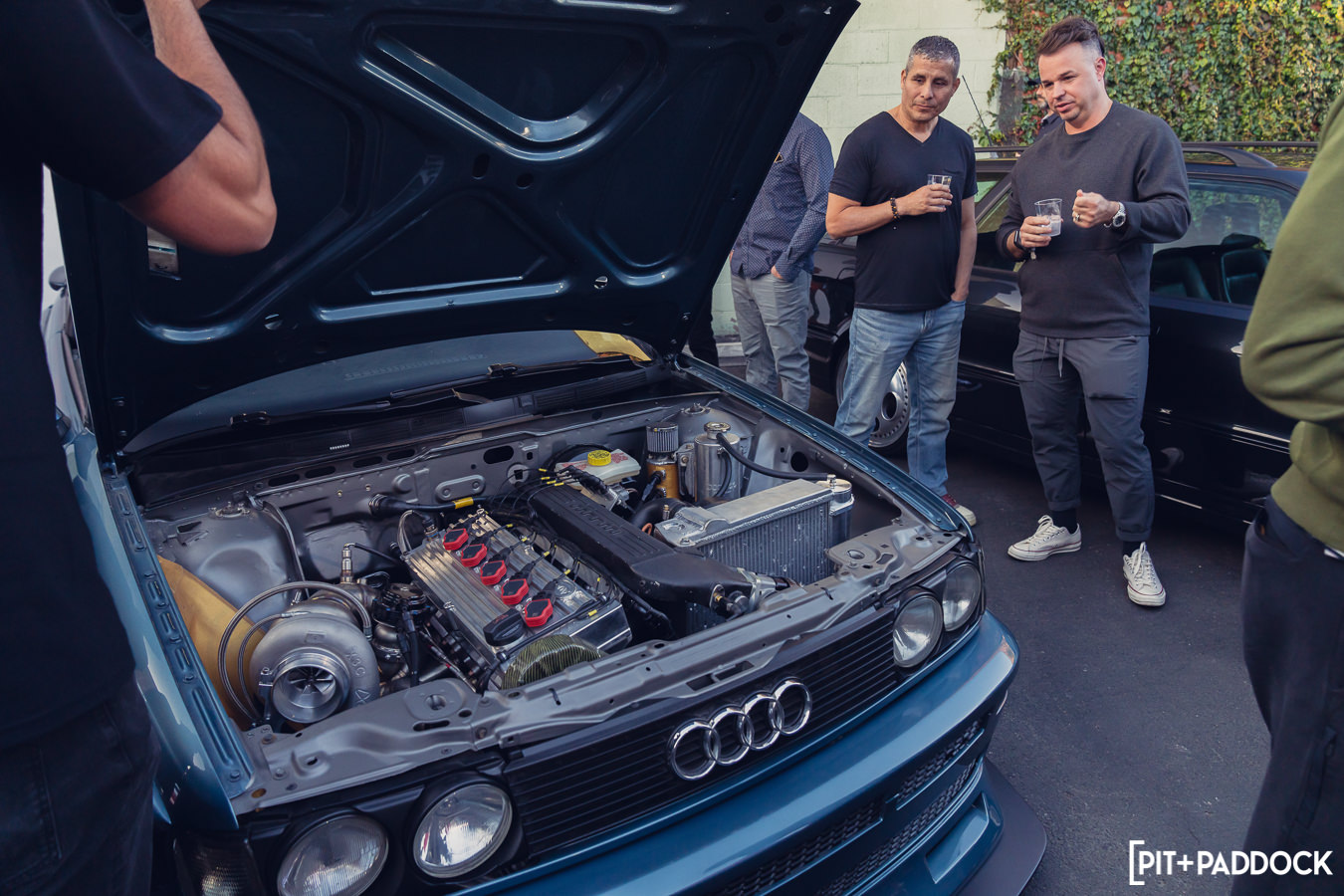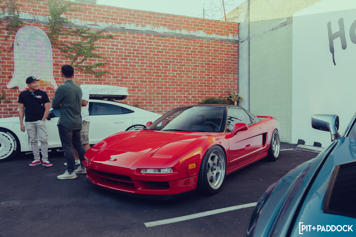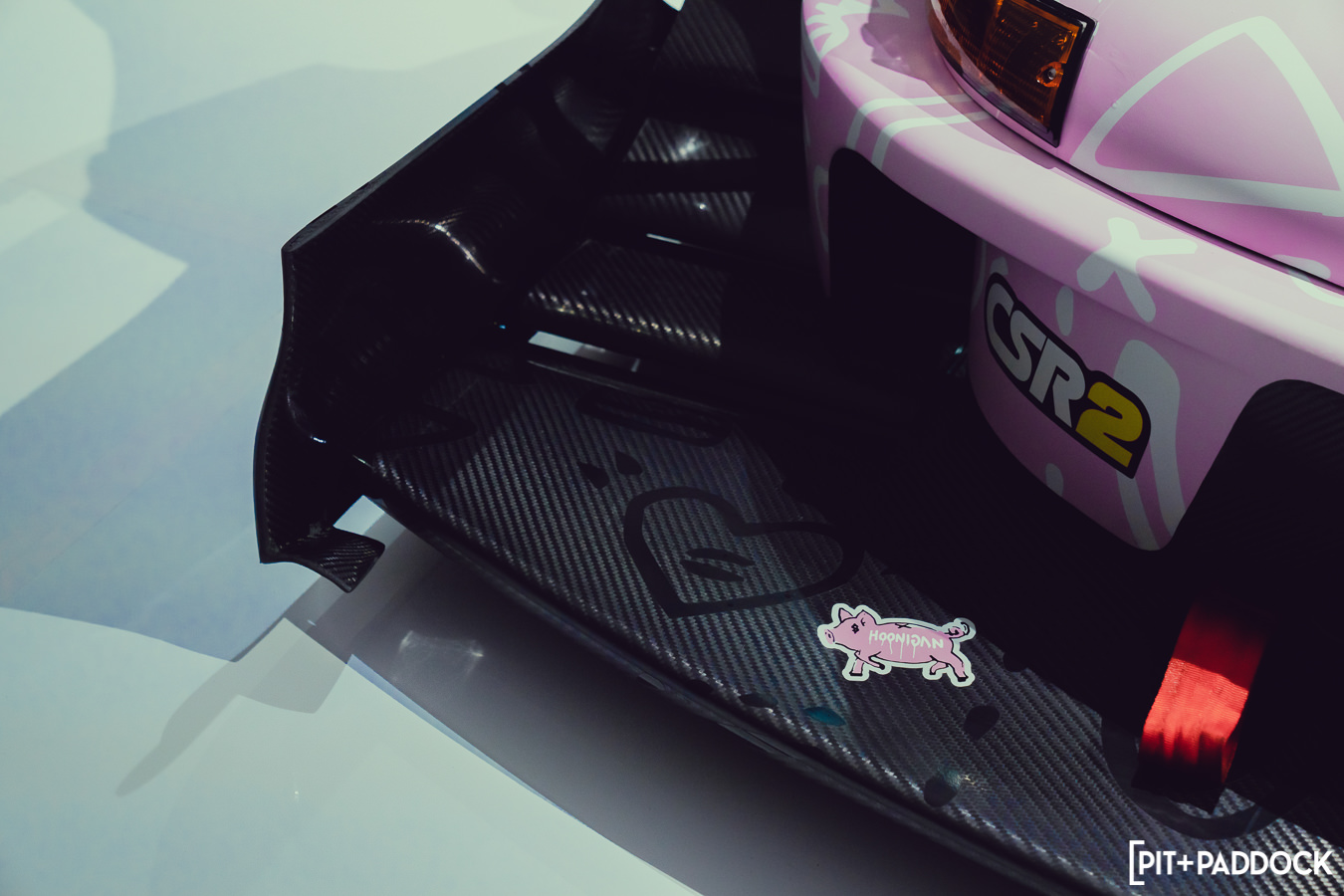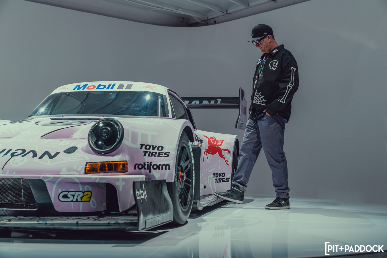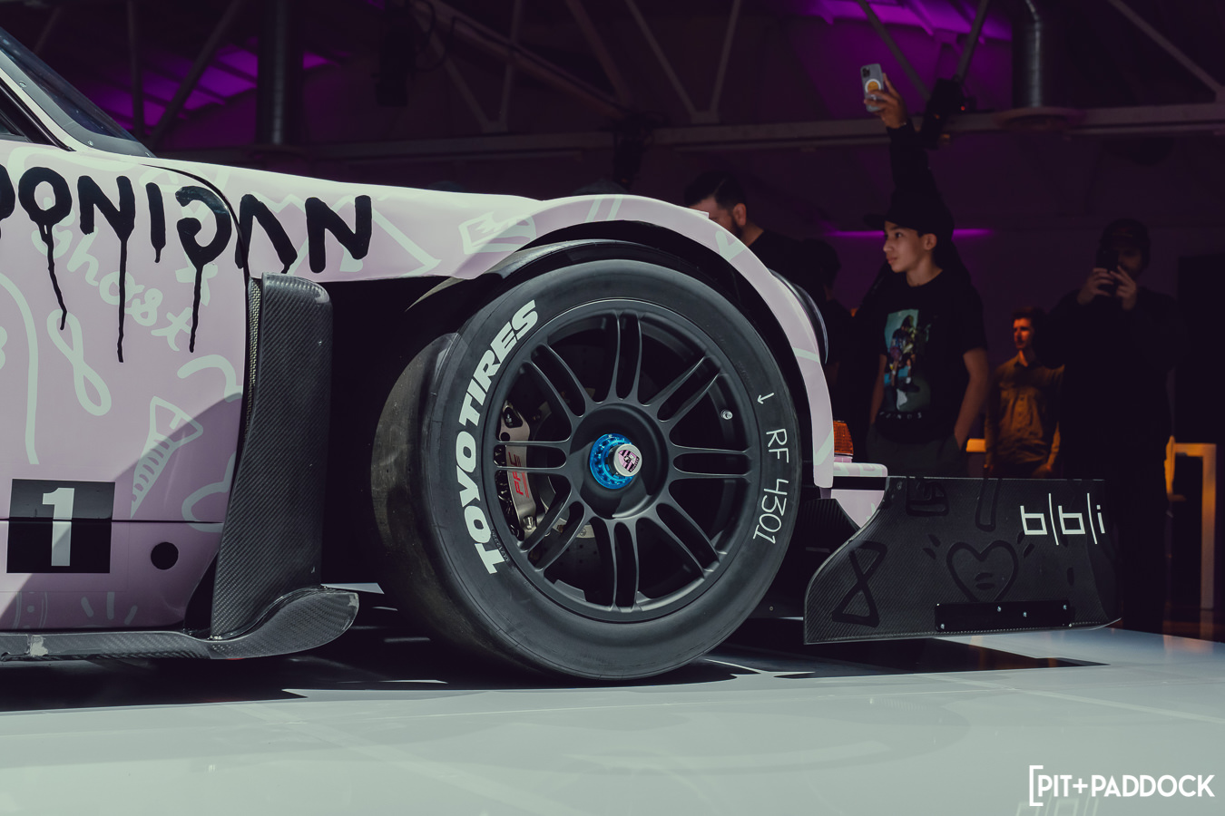 Last night, the gang at Hoonigan invited Pit+Paddock to a private party in downtown LA to witness the unveiling of the “Hoonipigasus” (that’s Hoon-Ni-Pig-A-Sus). Sadly, the BBI Autosport-built 4.0-liter twin-turbo 911 wasn’t running yet, with things like the wiring and tuning incomplete. But on the outside, the mega-wide Porsche is nothing short of glorious. Its carbon/Kevlar aero is hill climb ready. Its unique livery, designed by artist Trevor Andrew aka Guccighost, pays homage to one of the most iconic race cars in Porsche Motorsport history – the 1971 917/20 “Pink Pig.” The whole shebang weighs a mere 2,200lbs (approximately 63.6 power-to-weight ratio).