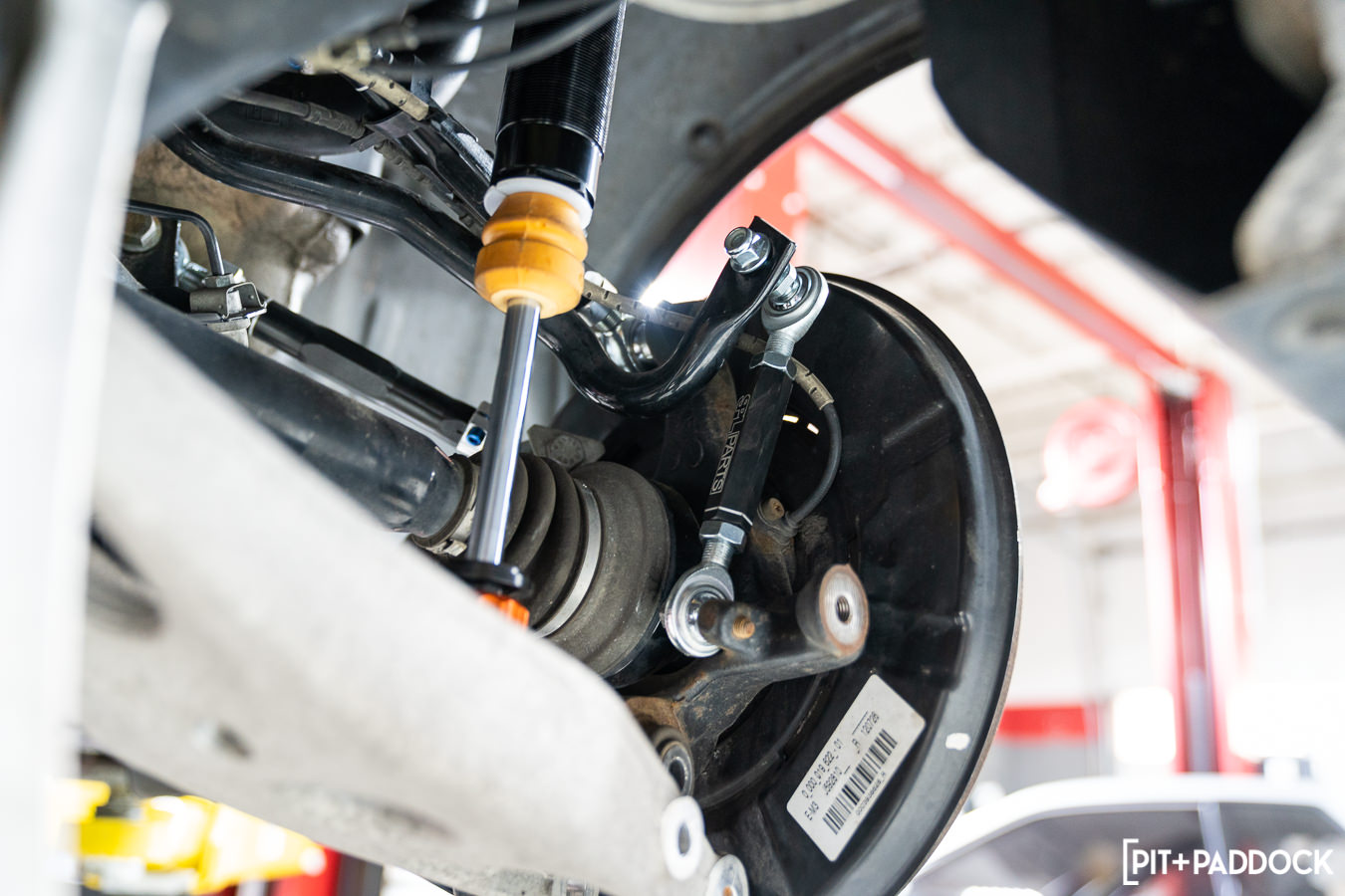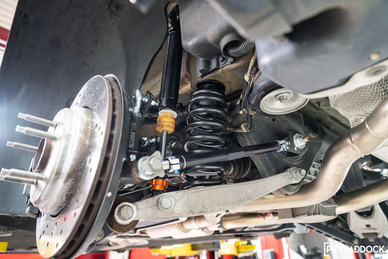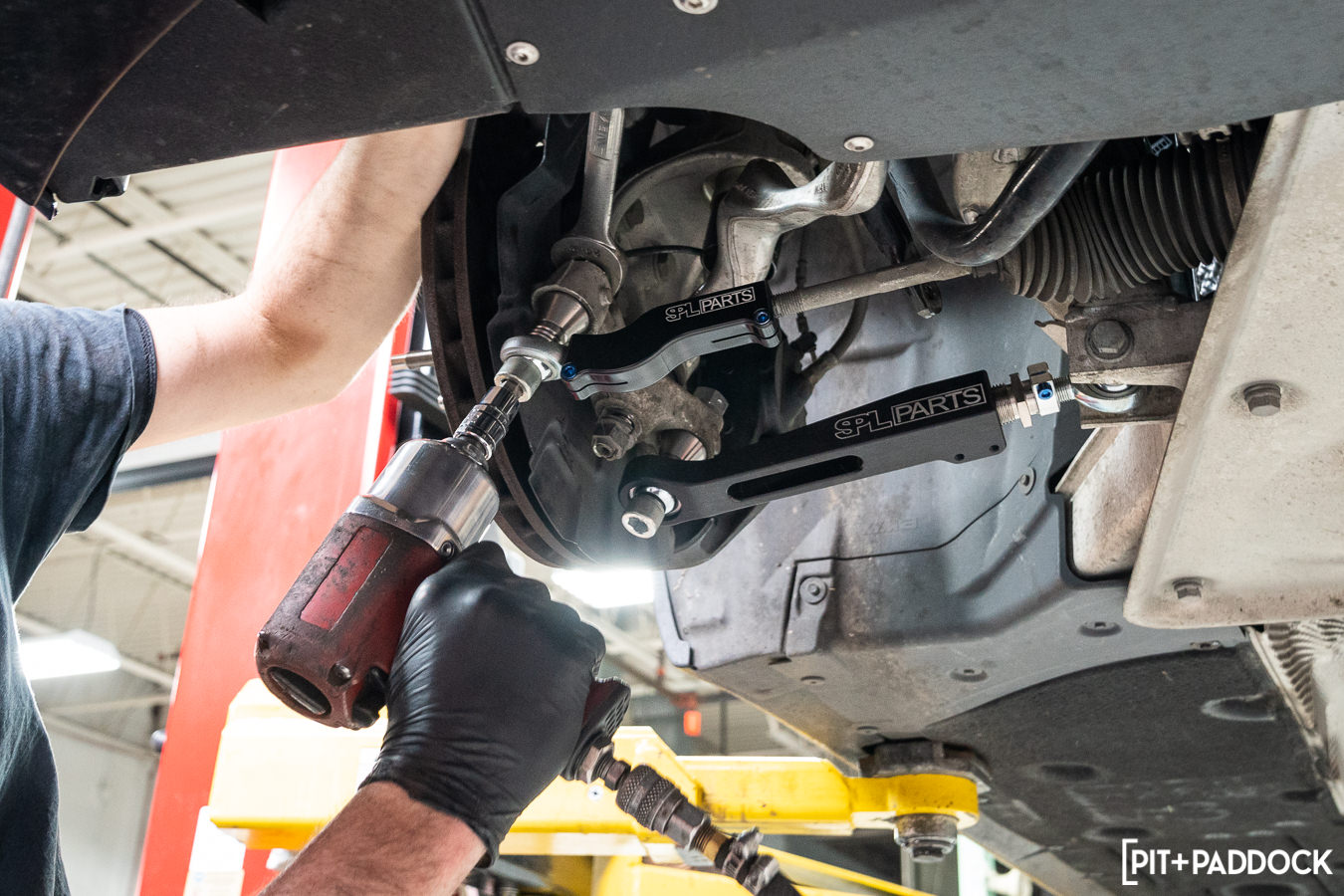 With the factory suspension dismantled at various points on the car, Pat at R/T Tuning installed the adjustable arms from SPL Parts in their corresponding factory locations. Not before spinning each component and rod out to match the factory arm lengths in preparation for making finer adjustments later on R/T Tuning’s in-ground Hunter laser alignment rack.