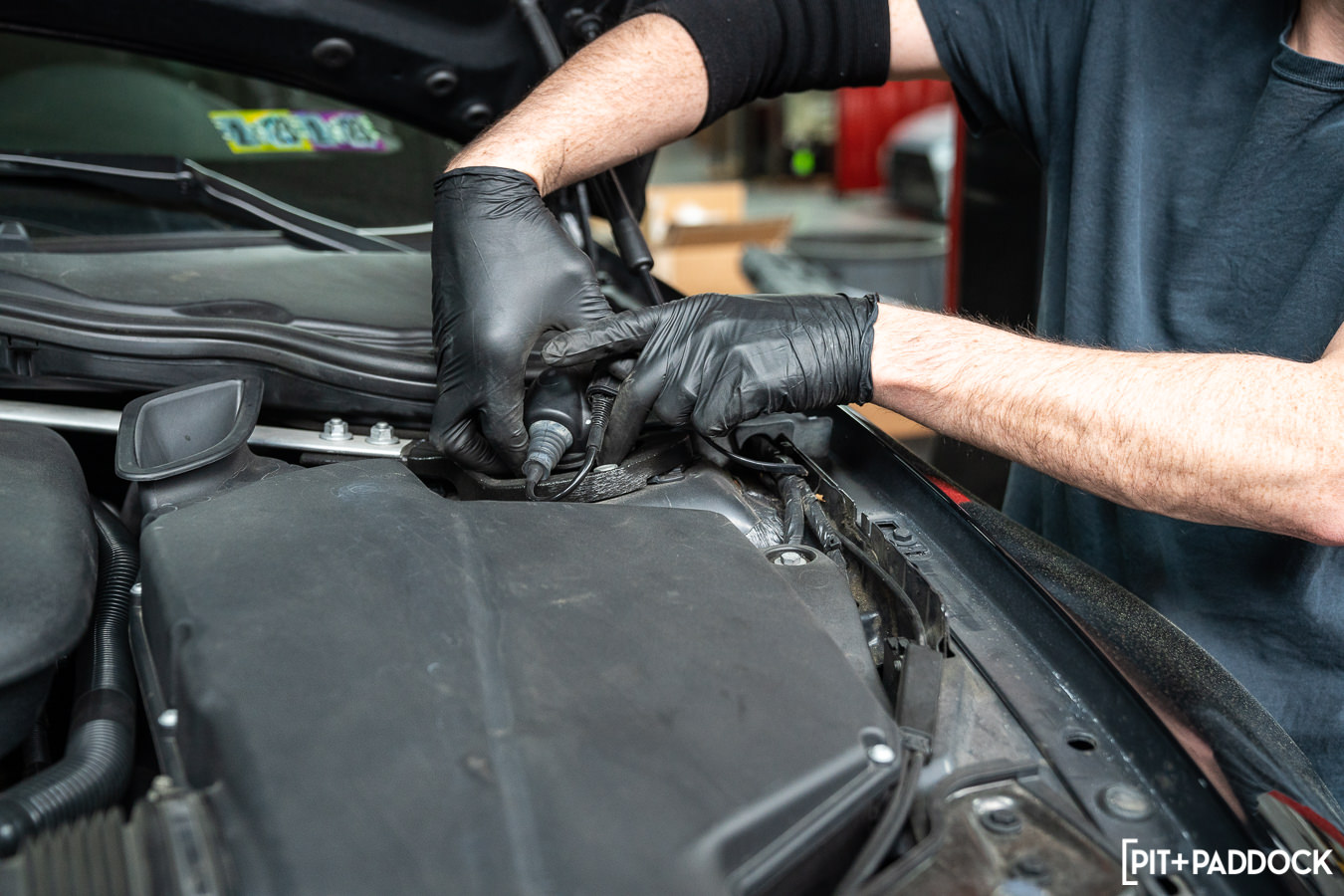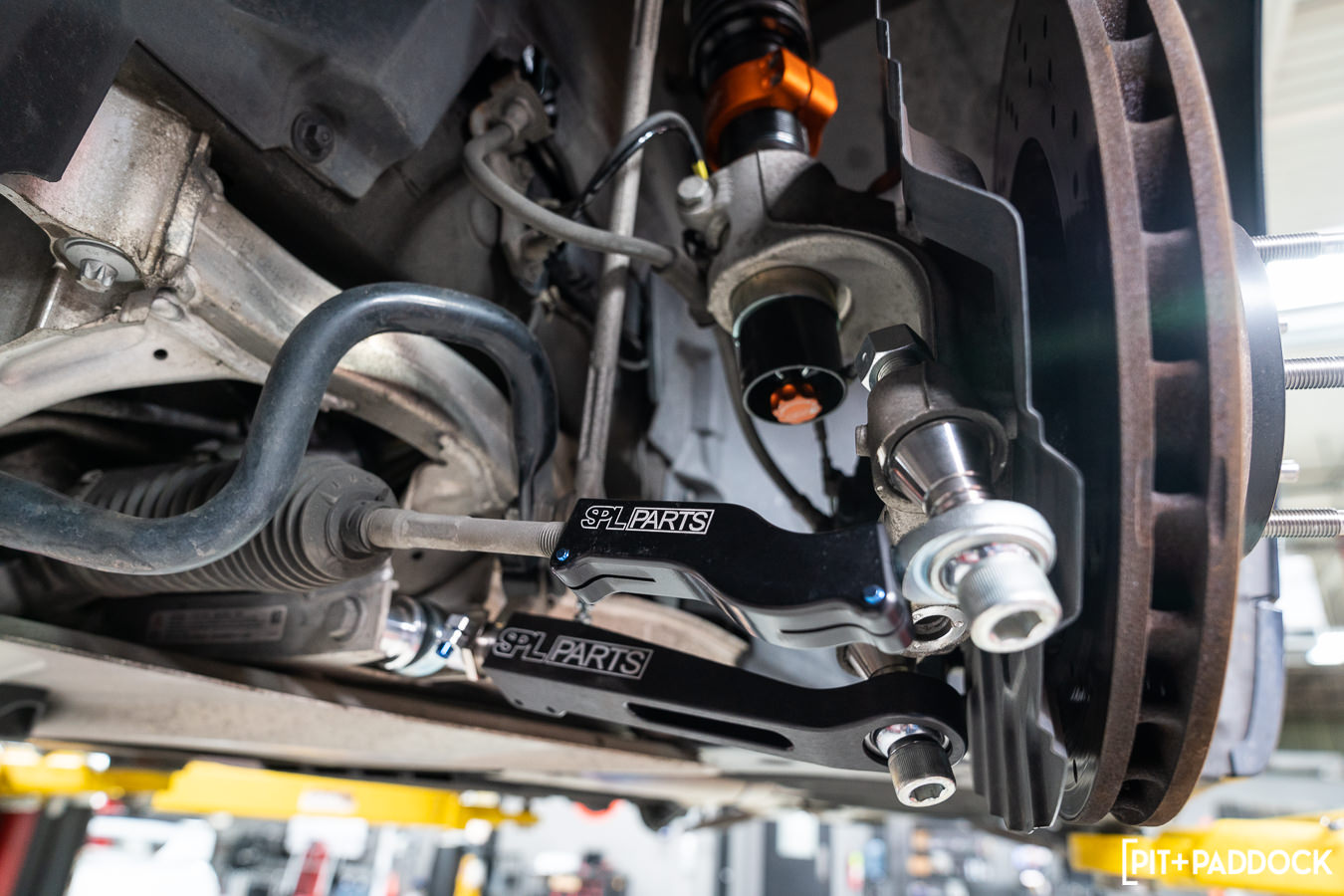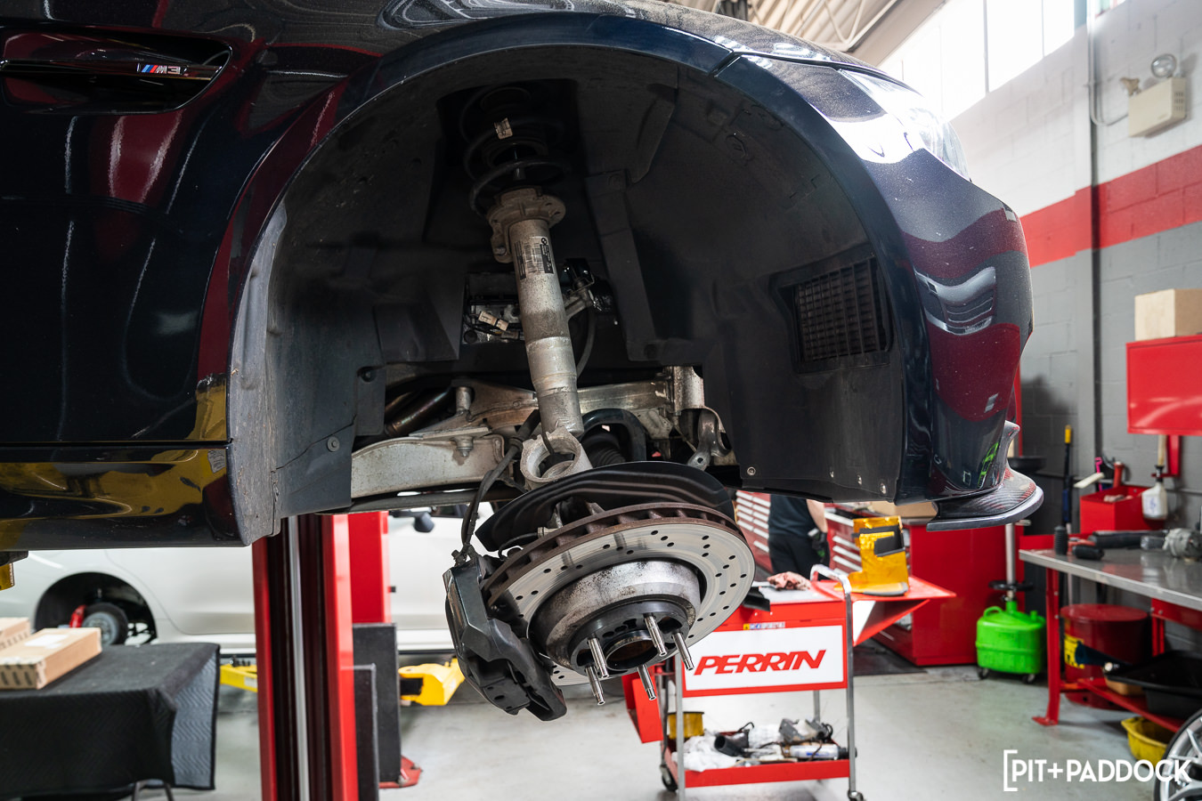 With the factory suspension dismantled at various points on the car, Pat at R/T Tuning installed the adjustable arms from SPL Parts in their corresponding factory locations. Not before spinning each component and rod out to match the factory arm lengths in preparation for making finer adjustments later on R/T Tuning’s in-ground Hunter laser alignment rack.