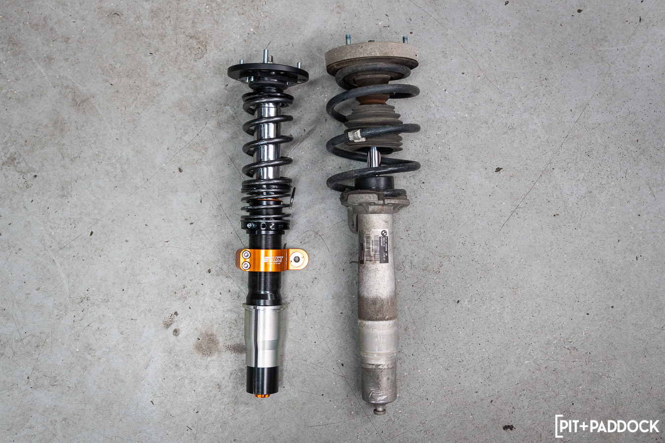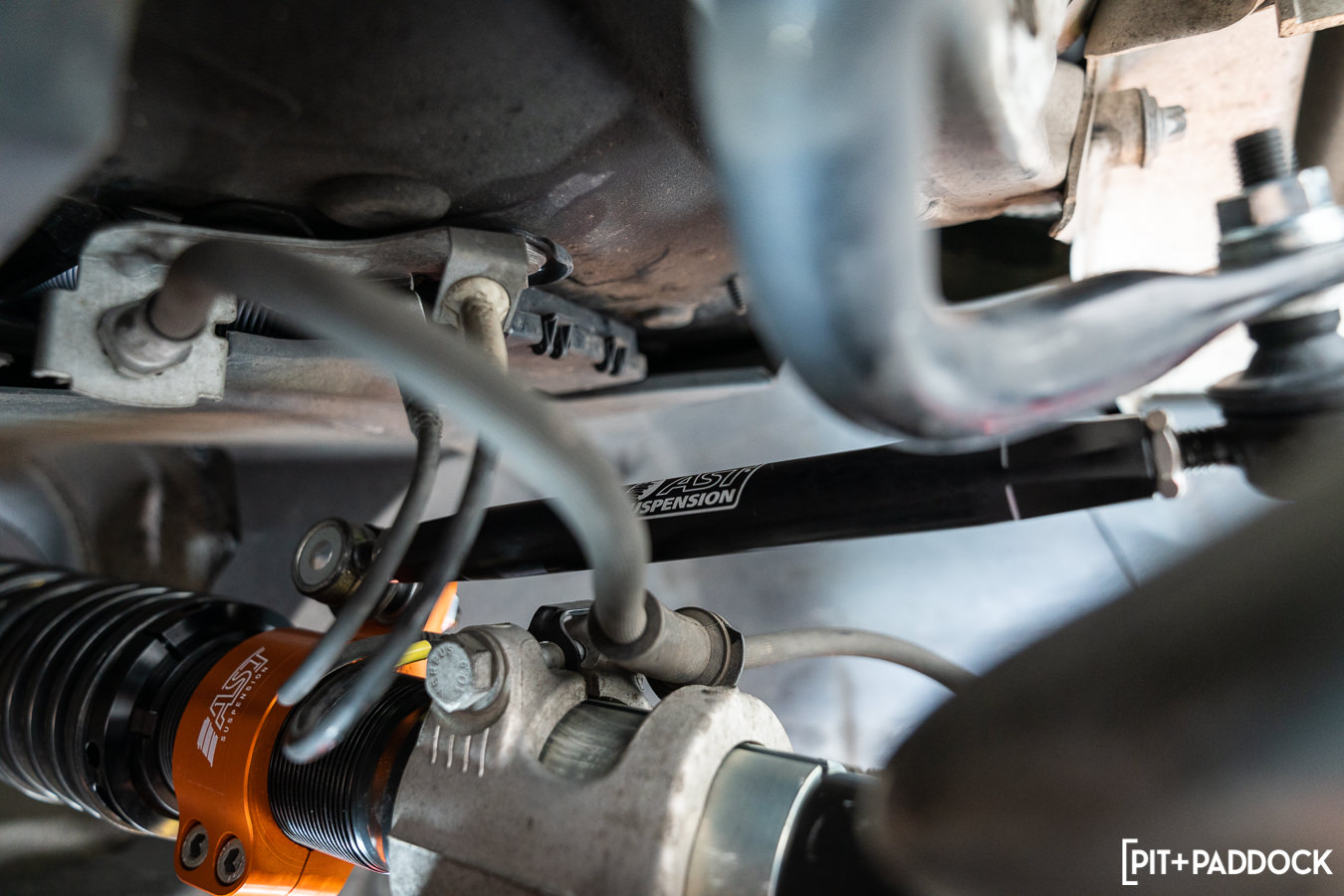 Earlier, we mentioned a major positive of the AST 5100 setup: it maintains factory mounting points. Anyone familiar with fabricating custom mounting solutions for motorsport dampers knows how much easier it is when items bolt into place. Such is the case with the E92-spec AST 5100, which not only maintains the divorced spring setup in the rear, but the heights of each product nearly match the factory components. The only holdup on these was setting the car at the correct ride height to clear the orange sway bar end link mount threaded onto the front coilover.