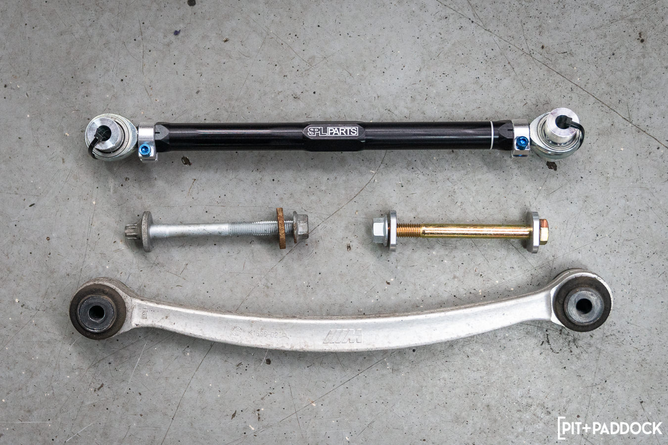 One of the arms that required further provisions was the front caster rod monoball bushing. A modification whose install steps we similarly covered in our F80 M3 suspension article. The stock bushing will need to be pressed out of the arm, and its enhanced spherical bearing will be pressed into place in the same component.