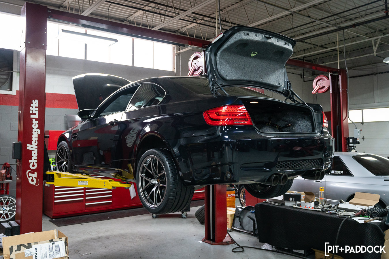 It hasn’t been that long since we introduced our Project E92. If you missed it, it’s a 2013 BMW M3 Competition (LCI) with a dual-clutch transmission, carbon fiber roof, and finished in Jerez Black. In our last article, we improved upon the aural delight of the stock S65 V8 powerplant by equipping an Akrapovič titanium exhaust. Other areas of the vehicle still need upgrading, though. Most will be a bit more involved but yield a more visceral experience than the factory spec. The crucial areas of suspension, wheels, and tires are on today’s agenda. We again visited our friends and technical wizards at R/T Tuning in Montgomeryville, PA, to complete the installation. Let’s get into the new mods!