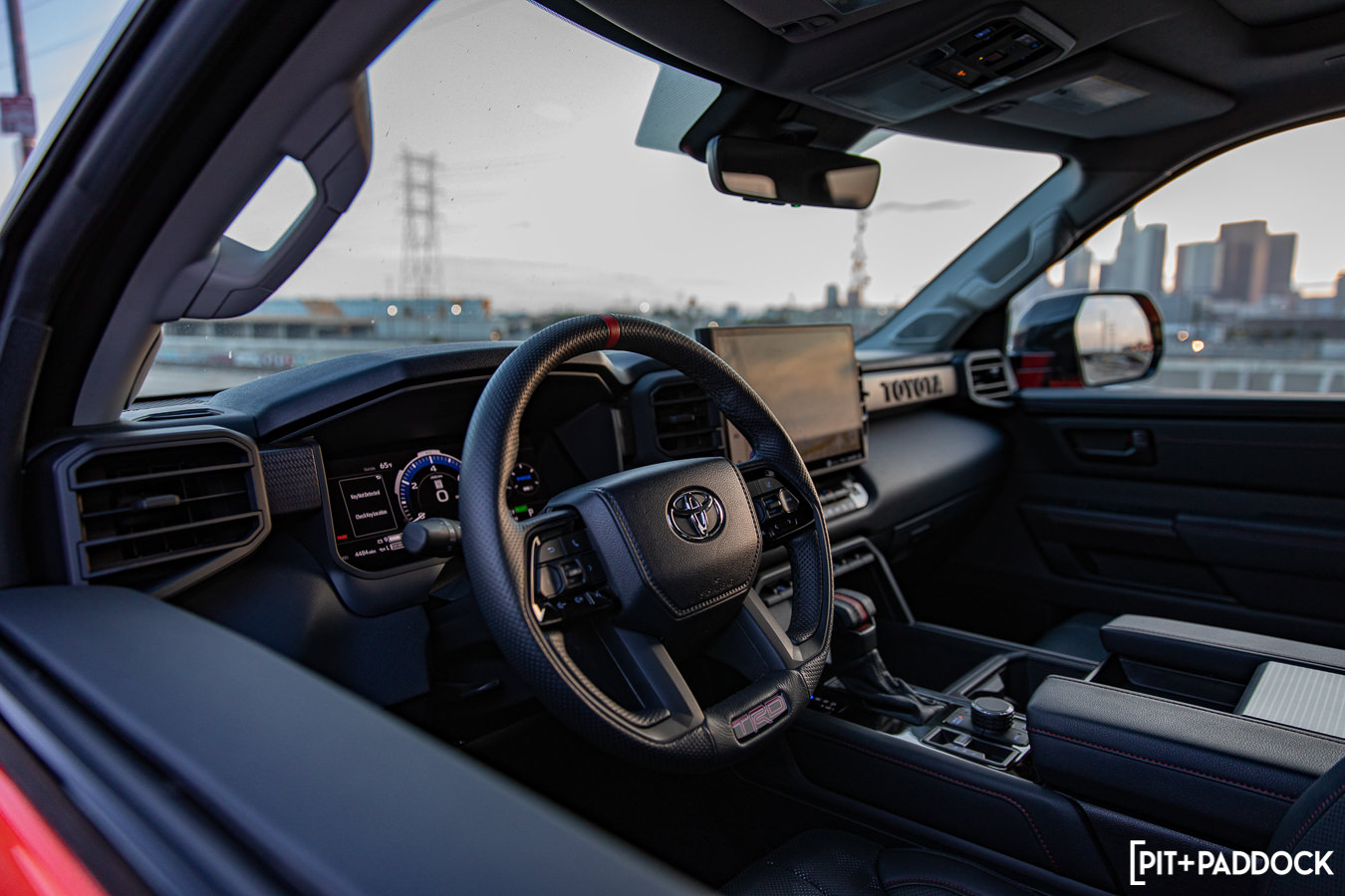 I was in command of the TRD Pro, and right off the bat, after my first 35mph to 90mph pull jumping onto the highway, I was convinced this new engine twin-turbo hybrid package from Toyota was the business. It accelerates strongly with max torque coming on at 2,400rpm. It also carries speed nicely, so nice that all your passengers will eventually hold on to their seats and wonder when the acceleration will mellow out. It doesn’t. Shifting from its 10-speed transmission was also smooth, with transitions from running both electric motor (48hp and 184 lb-ft) and gasoline engine being seamless. I was thinking I was going to miss the roar of a V8, but this hybrid V6, while it can be calm and quiet at low speeds utilizing its battery power primarily, it wakes the ‘f’ up when you punch with a deep rumble. I can only imagine how much better it would sound with a proper performance exhaust.