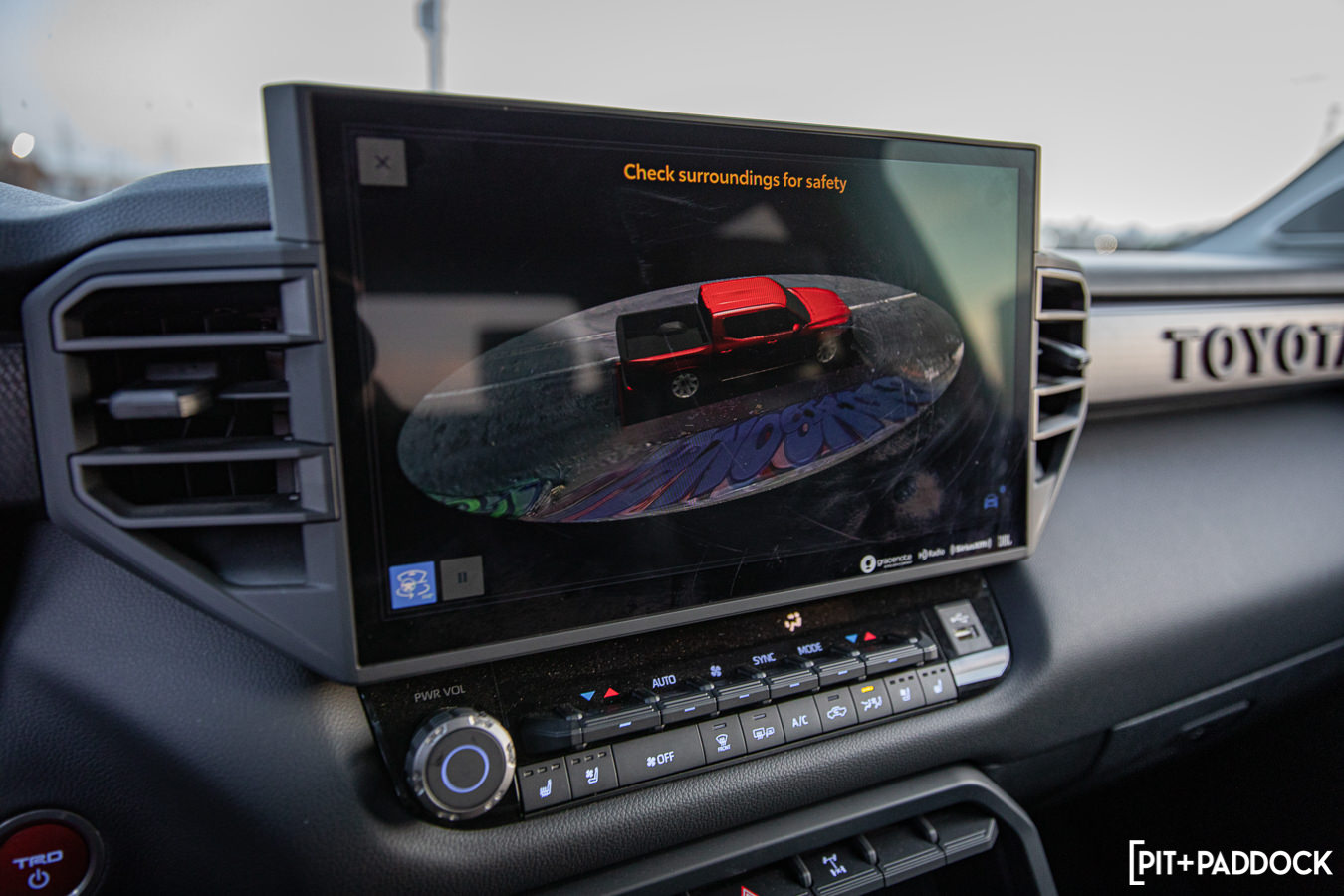While subjective, the Tundra’s styling was right up my alley. I can appreciate the large and aggressive black front grille, wide body panels, all the LED lighting (even in the cargo bed), 14-inch touchscreen, and of course, the forged black BBS wheels. If I had to nitpick a couple things, it would be the camouflage treatment on the fenders and seats that are specific to the TRD Pro. I also wasn’t a fan of the big Toyota emblem on the passenger-side dash either. But that’s pretty much it!