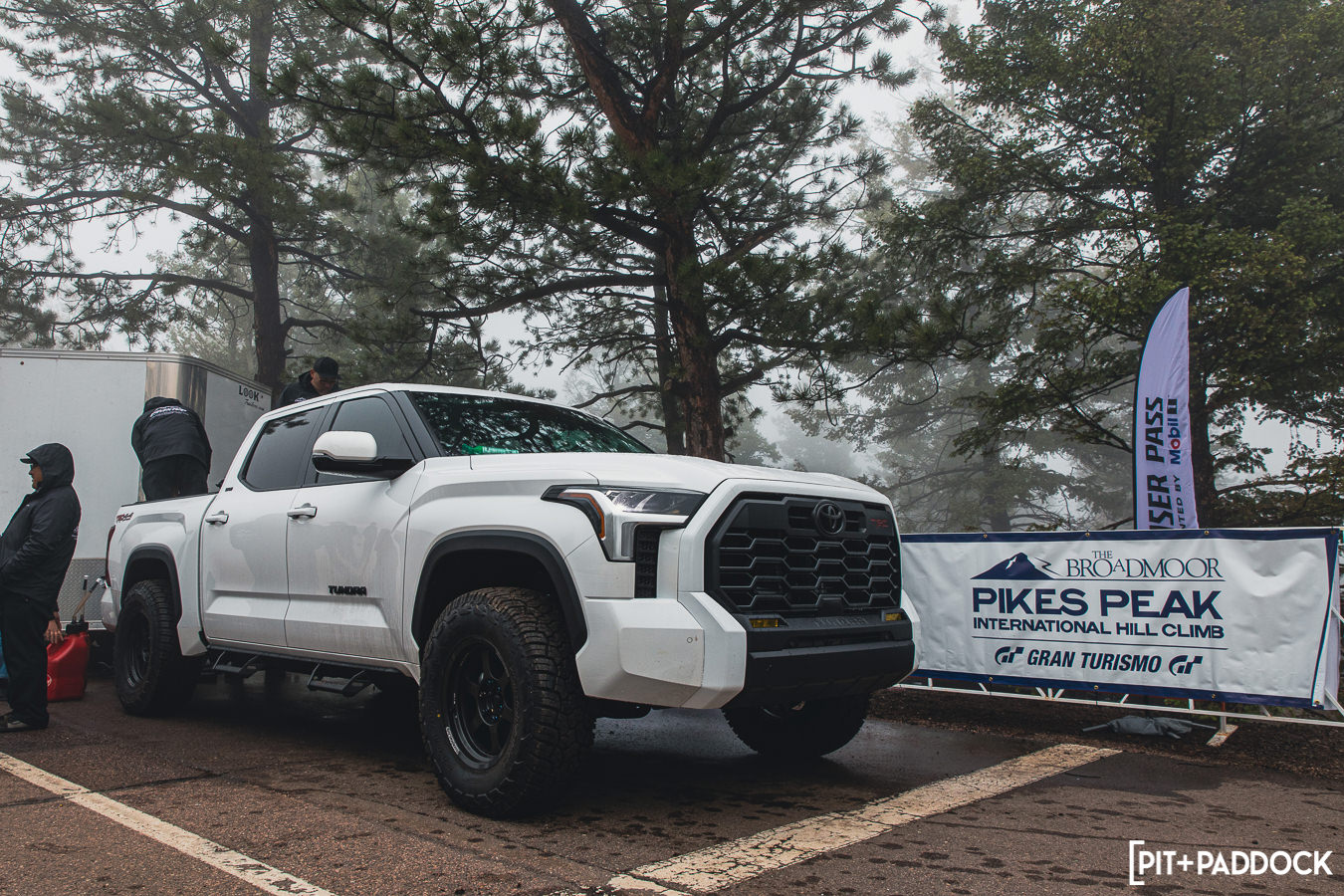 Now it might not be a TRD Pro model nor have as many cool goodies as the TRD SEMA build, but Evasive Motorsports picked up this Tundra with a TRD Off-Road 4×4 Package (adds Bilstein shocks and skid plates), and it looks the part! On all four corners are 18×9-inch +0 Volk Racing TE37XT M-Spec wheels with 35-inch Yokohama Geolander tires. The front has been raised two inches to avoid rubbing from the all-terrain rubbers. Best of all, it’s not just a mall crawler but used to tow the Turn 14 Distribution x Evasive Motorsports Tesla Model 3 Pikes Peak race car.