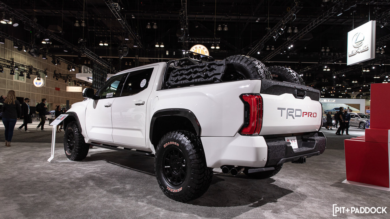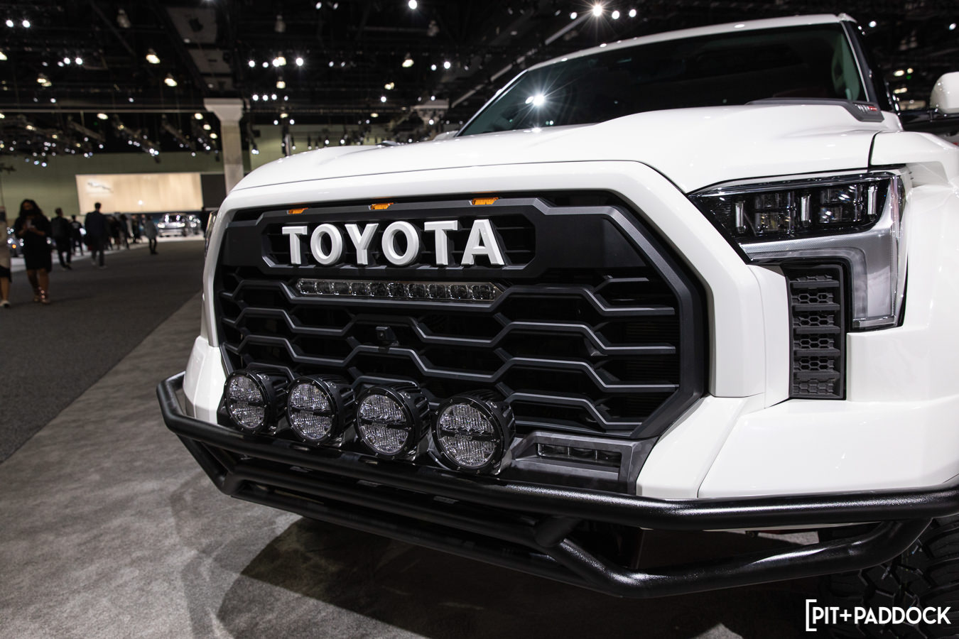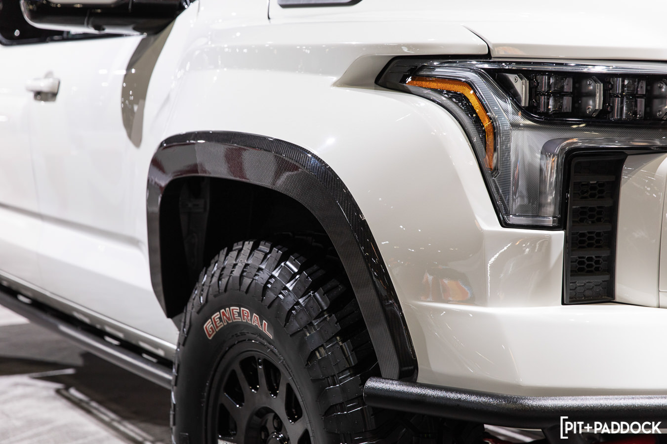 In case you’re wondering how the new Tundra looks modified, this build by Toyota’s TRD department was what really got me jazzed up for the Tundra in the first place. Nicknamed “TRD Desert Chase Tundra” and debuted at SEMA 2021, the TRD Pro features one-off parts like the long-travel suspension and fenders made of carbon fiber. The fenders accommodate 37-inch tires, while all the other accessories, such as the front-, rear- and side-facing lights, and a full bed of support gear, are meant to rescue a race truck in the desert in any condition.