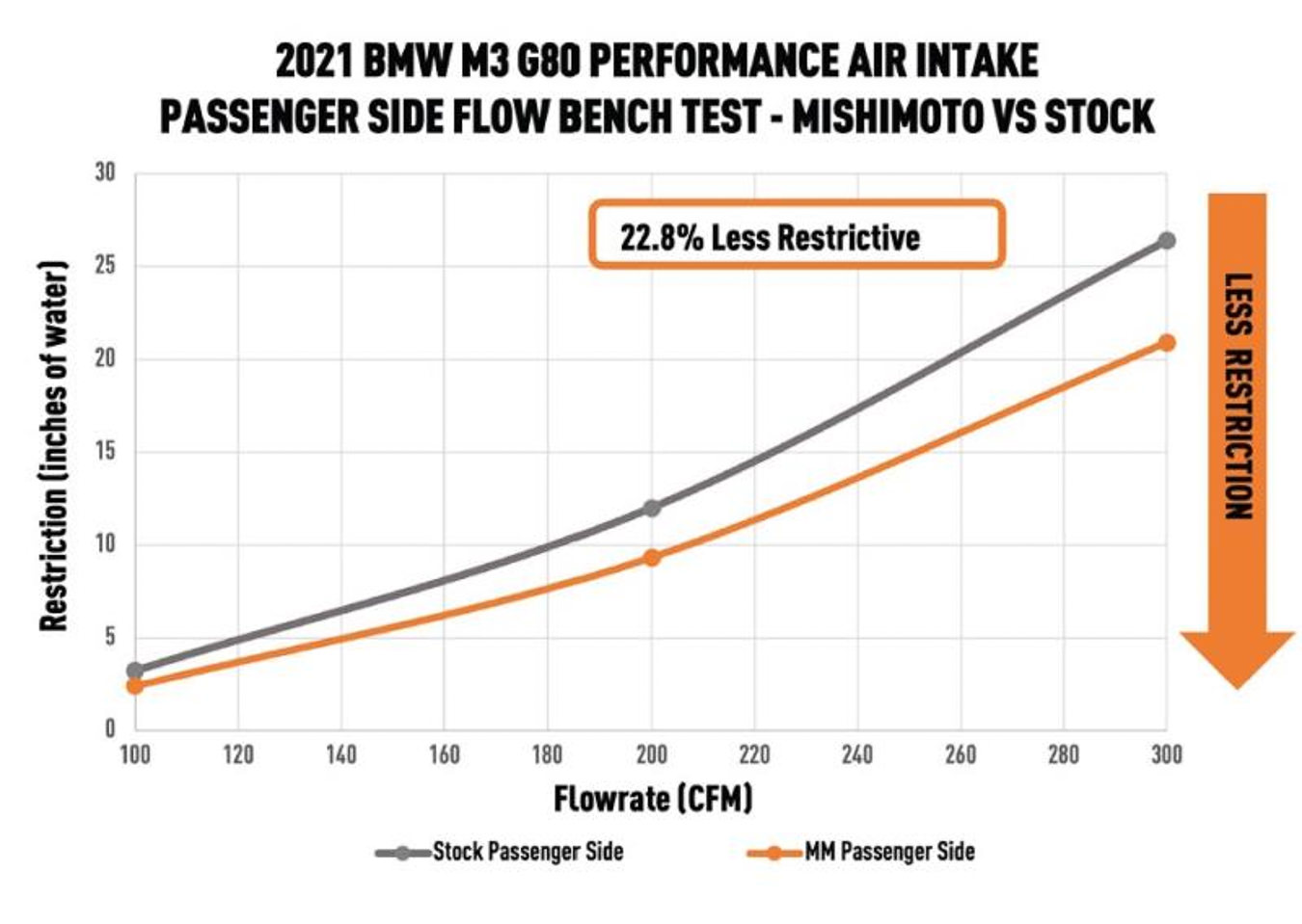 The advanced flow bench Mishimoto uses allows air volume measurements to be taken from 100 to 300 cubic feet per minute (CFM), simulating the S58’s entire powerband. With the brand-new design, Mishimoto measured 13% less restriction in CFM on the driver’s side intake and 22.8% less on the passenger’s side intake. While both sides of the S58’s intake work to achieve the same goal, they still operate independently, and the data needed to be recorded as such.