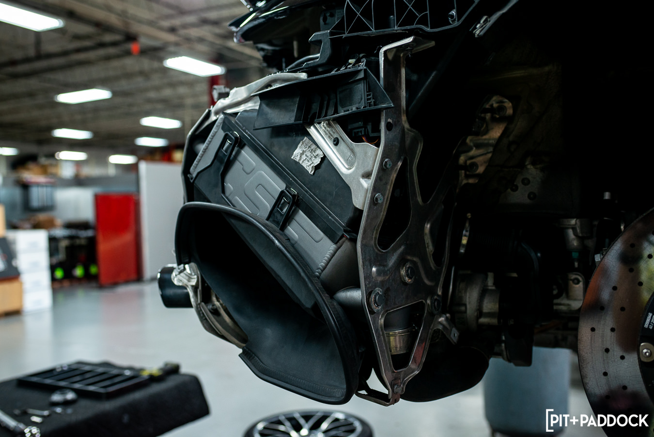 With the bumper and wheels removed, all of the bracketry, ducting, and hardware holding the stock intercoolers in place was separated from the chassis. It was all kept in reasonable condition as the replacement performance CSF units reuse every piece.