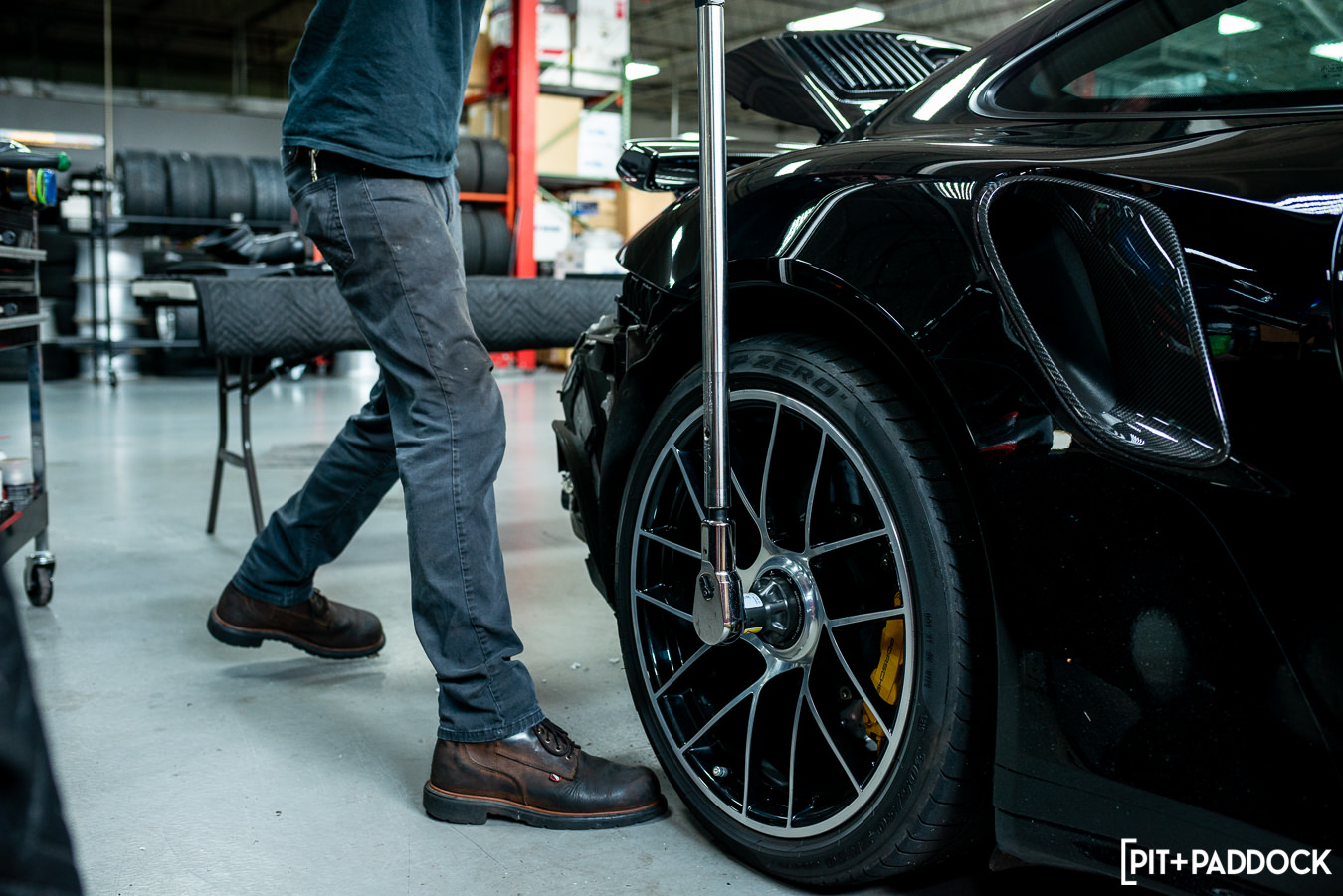 The wheel removal process requires knowledge and tools specific to this chassis. Pat from R/T Tuning broke out his massive centerlock ratchet just to get enough torque to crack the lug nut loose on the factory centerlock wheels. The remainder of today’s install was pretty straightforward.