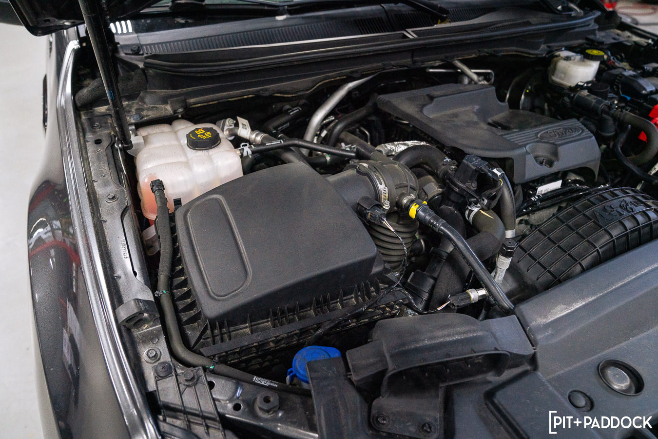With everything fastened, the Ranger has a more robust intake system for off-roading duty. The extended snorkel will allow for cooler airflow, while its high perch will keep the engine’s intake free from typical hood-height hazards such as dirt, dust, debris, and water. In addition, the enhanced Mishimoto intake system provides a more pronounced intake noise, better fuel mileage, and the convenience of a washable filter element.
