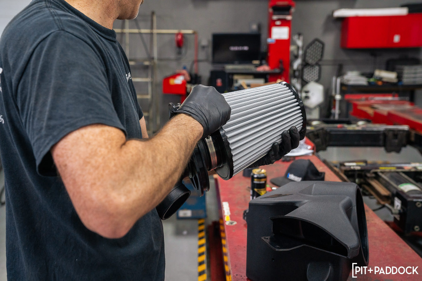Pat then reconvened back in the engine bay to finish equipping the Mishimoto intake box with all of the OE sensors, the new grommets, filter, and tubing included with the intake kit. Pat mapped out and drilled the top snorkel holes to reinforce the highest reaches of the kit’s structure to complete this installation.
