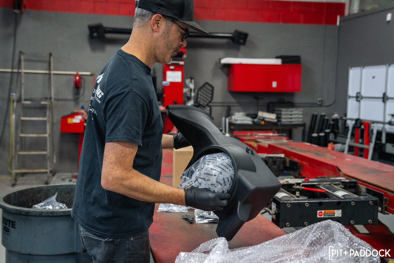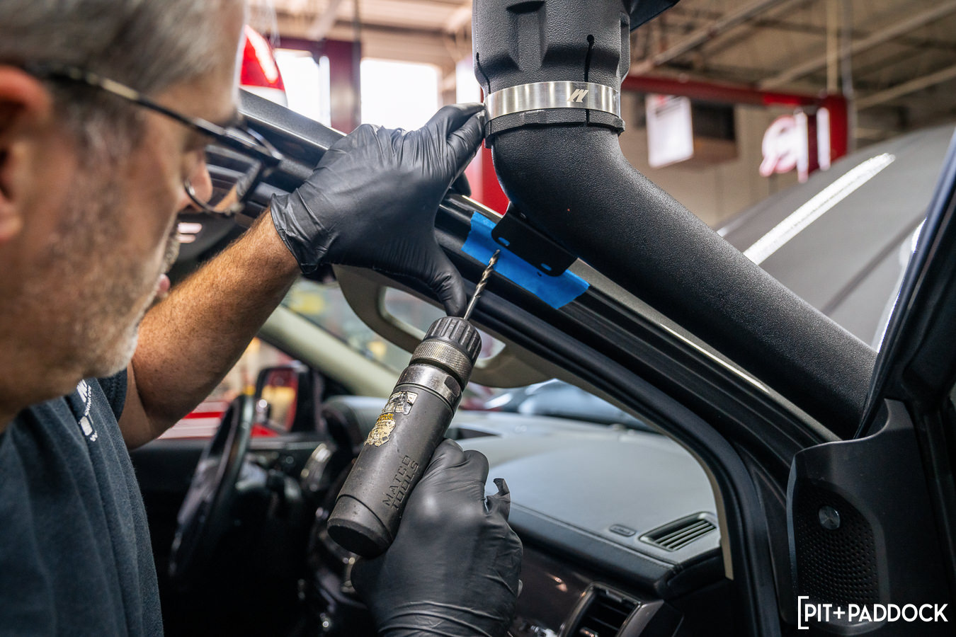 Moving onto the snorkel briefly, Pat from R/T Tuning removed the fender trim and guard to access inside the fender area. With those items removed, he could prep for the snorkel attachment by drilling holes in the fender (behind the trim badge) and the Mishimoto intake box, according to the template provided. Drilling the intake box will require a sizeable four-inch hole saw. This tool isn’t too common in everyone’s arsenal, thus raising the level of this installation.