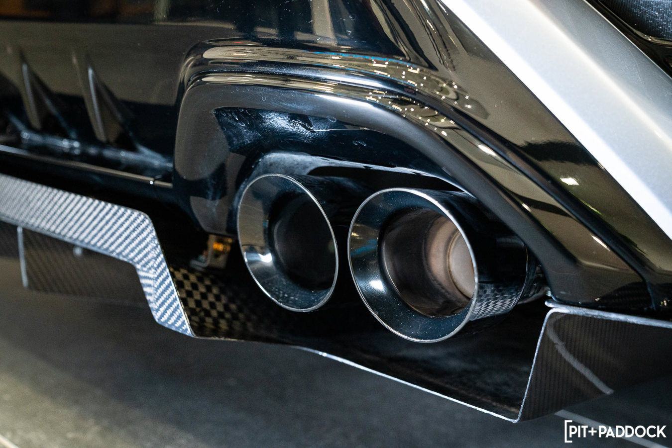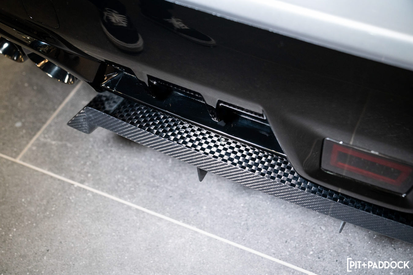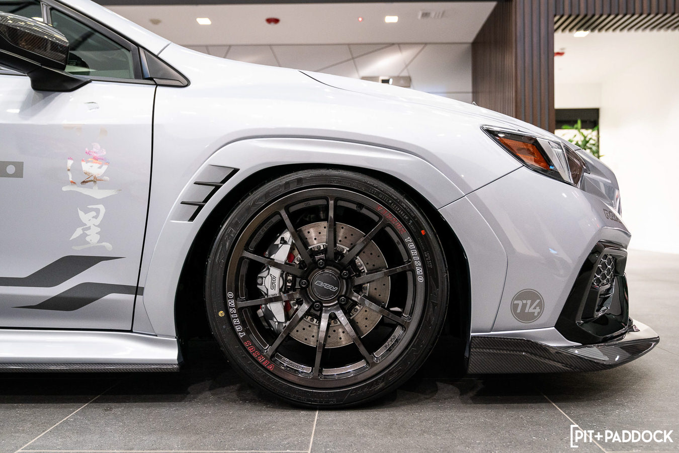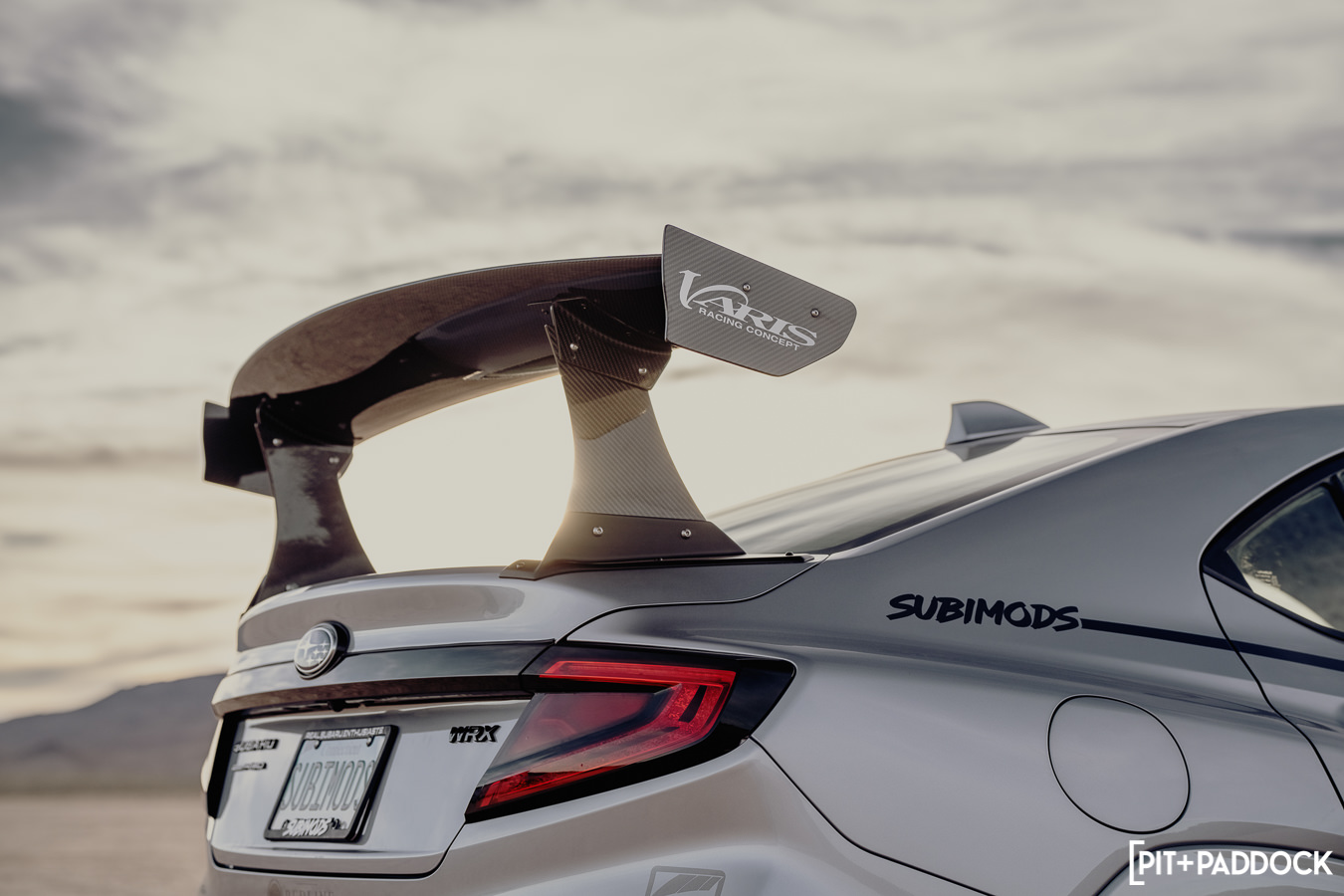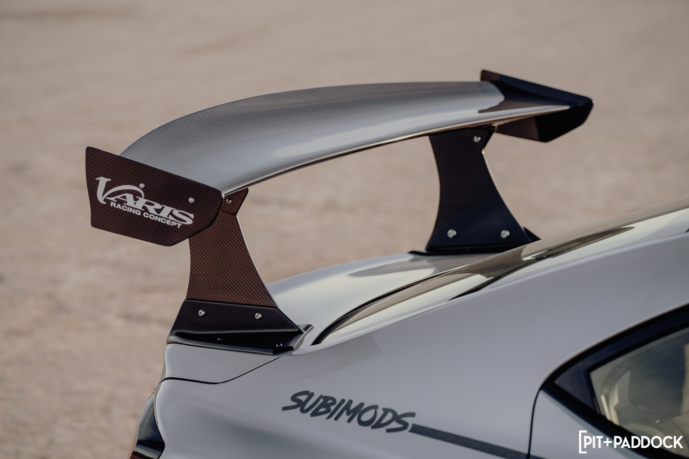 That conscious decision shows just how attuned Subimods is to its fan base. Rather than alienate aspirations, the company wants WRX owners to look at their car and think, “yes, this is something I can create”. While it may have initially been challenging to think within those bounds, the Subimods team has nevertheless created something truly special here. Painting the car’s lower valences and arches in piano black and body color, respectively, makes the car look so much more cohesive. The team’s sustained relationships with some of the industry’s heaviest hitters have afforded them access to the first iterations of several parts: Varis’ Arising-1 aero kit and GT wing, VSC Performance’s carbon hood vent set, and prototype Öhlins Road & Track coilovers.