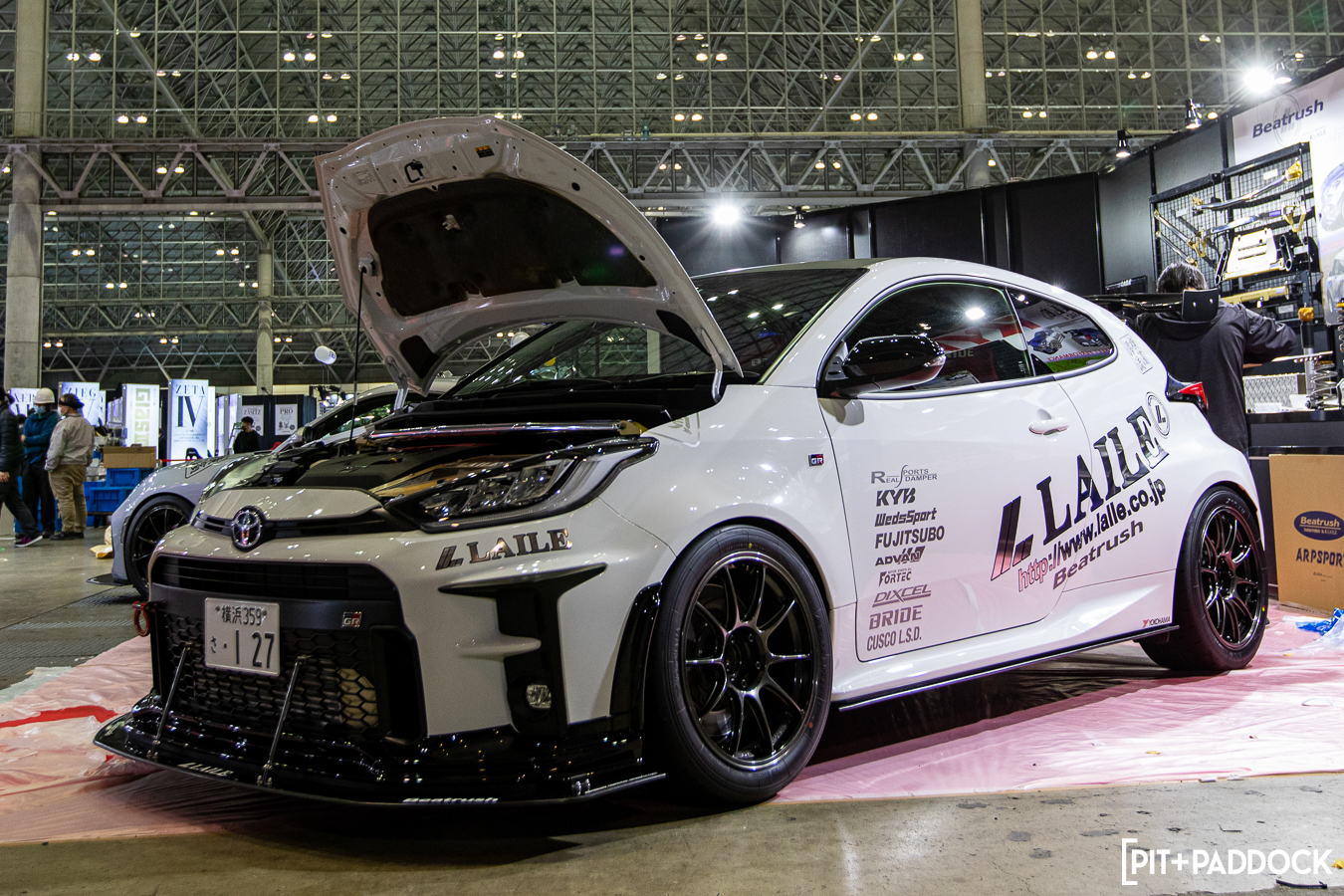 Laile/Beatrush and Garage Vary both exhibited a pair of GR Yaris builds that were worth stopping to take a photo of. The Laile/Beatrush vehicle looked the part of a ready-to-rock time attack car while the Garage Vary Yaris sported a forged carbon hood and an interesting red stripe. It arguably appeals more to a street audience.