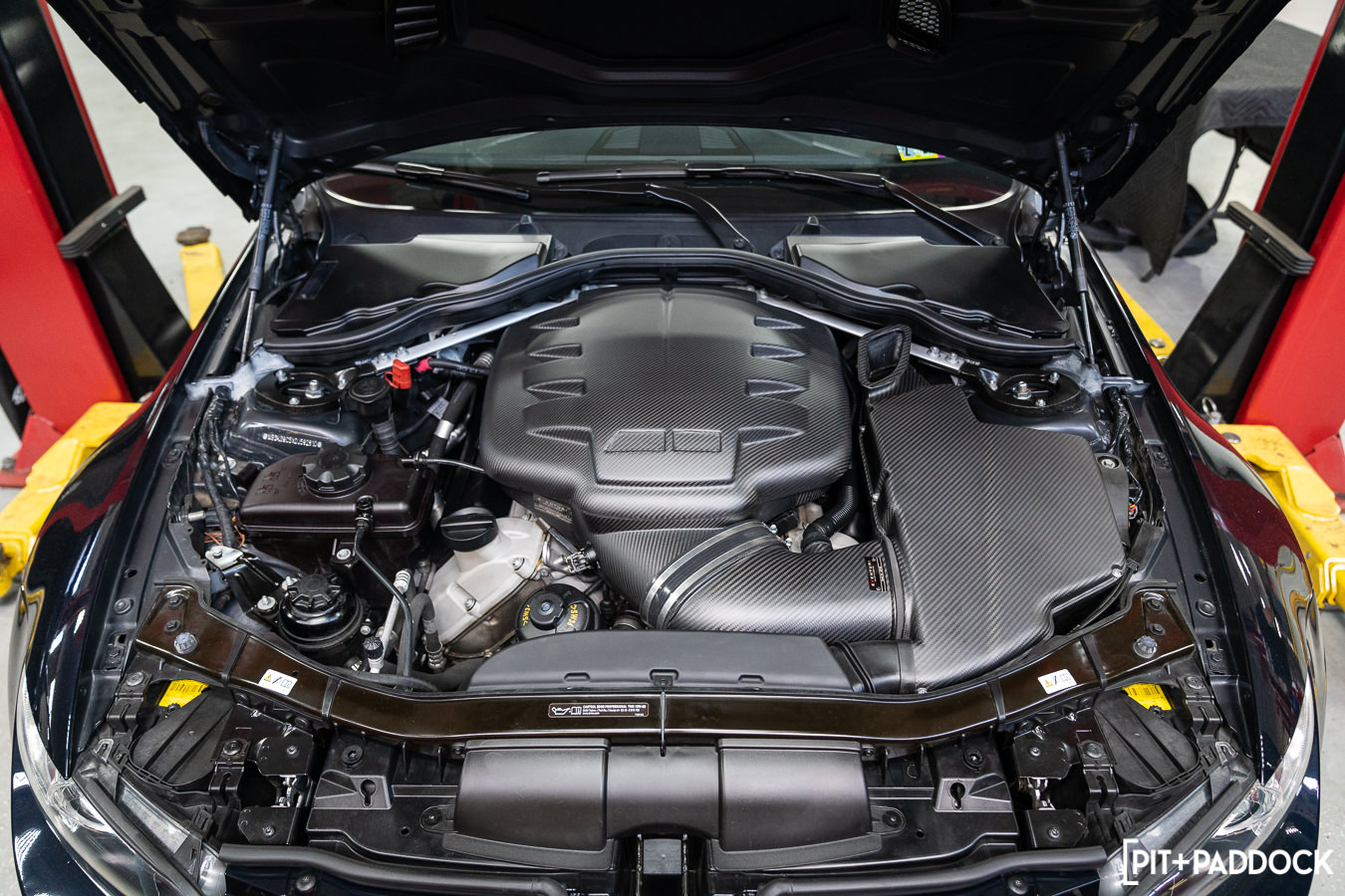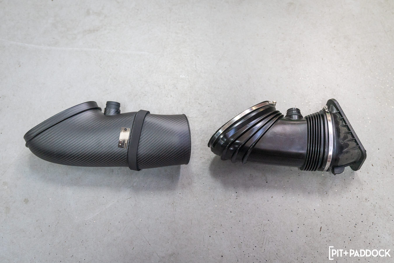 Eventuri’s matching carbon fiber airbox lid (EVE-E9X-CFM-ARB) adopts a similar philosophy to the plenum. It’s all OEM in shape and size, but thanks to its thinner (yet stronger) carbon fiber construction, more sound is allowed to penetrate the cabin for more theatrics.