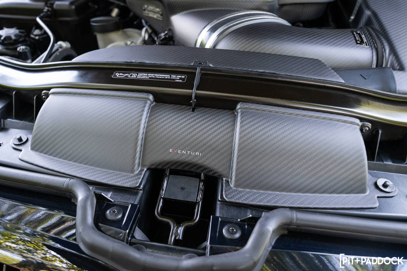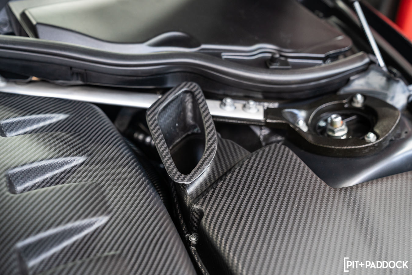 Similar to our previous chapter where we focused on several interior enhancements, the Eventuri suite installs with predictable ease since dimensionally, each carbon fiber component is identical to OEM, even down to the factory mounting points. A few extra ticks of time were devoted to ensuring the silicone hose coupler was properly seated against the plenum and that the debris shield was adequately oriented (downward) within the factory airbox base. Some care should be taken to ensure you install the carbon inlet scoop beneath the OEM temperature sensor in the bumper opening.