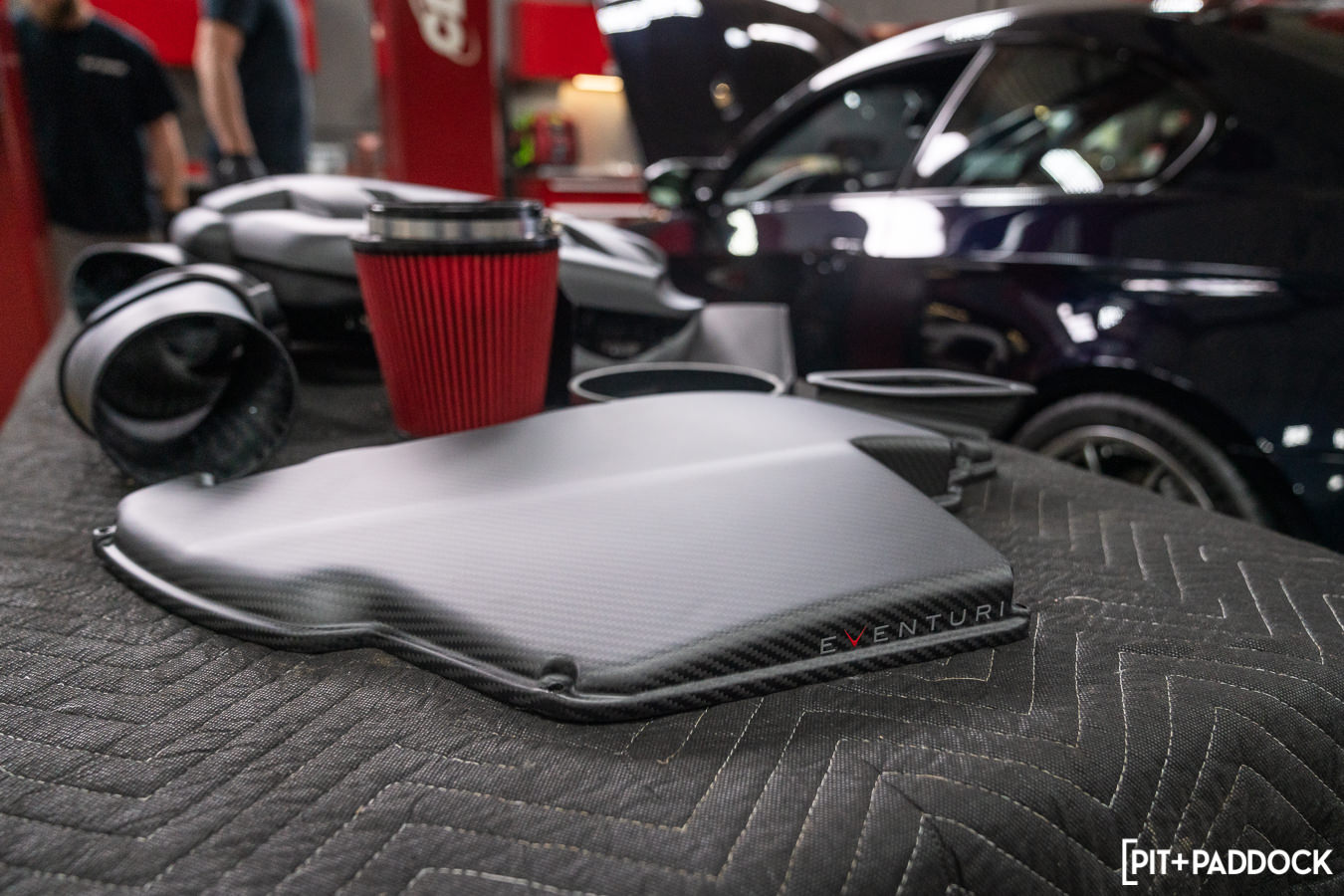 Eventuri has built its reputation on boasting big performance gains out of gorgeously engineered carbon fiber induction equipment and living up to them every time. Their background in Aeronautics and tuning have paid dividends—Eventuri has set a new benchmark in their segment and continuously leverages new technologies and rigorous testing to push the envelope. After building a strong foundation within the intake sub-genre, they’ve added engine bay styling into their rapidly expanding repertoire. To make sure everything goes smoothly, we’re back at our usual stomping ground, R/T Tuning, in Montgomeryville, PA.