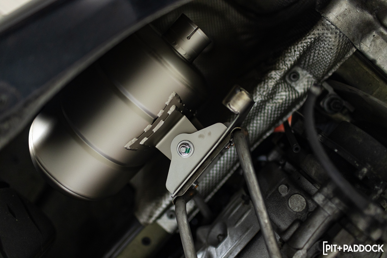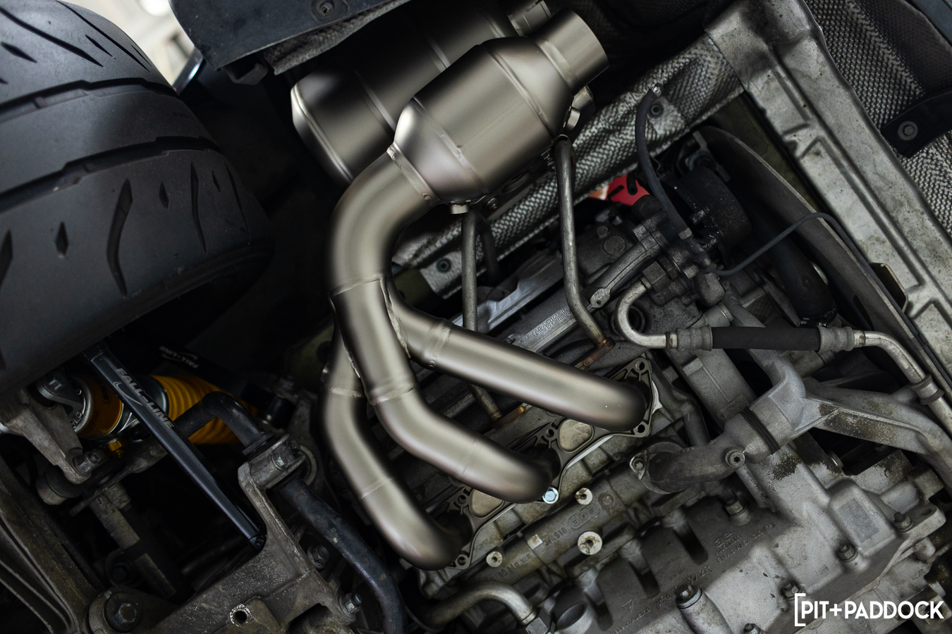 The Akrapovič Evolution line builds upon the company’s slip-on systems, adding more performance, weight savings, and volume. For the 997.1 GT3 specifically, the Evolution exhaust system (S-PO997GT3E) pairs titanium, 100-cell catted headers, and what they call “pre-mufflers” (side mufflers) with the existing slip-on center. These two Evolution-specific add-ons greatly contribute to the 37.5 lbs diet, and given the location of the weight loss, it’s enough to make it perceivable from behind the wheel. The Akrapovič header actually includes a little “peg” that slides into the side muffler bracket, which is a pretty ingenious mounting solution and prevents contact between the two pieces under load.