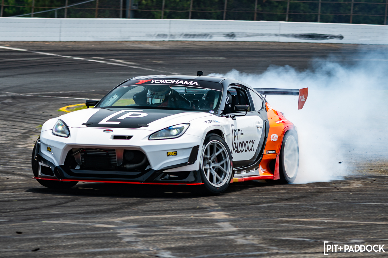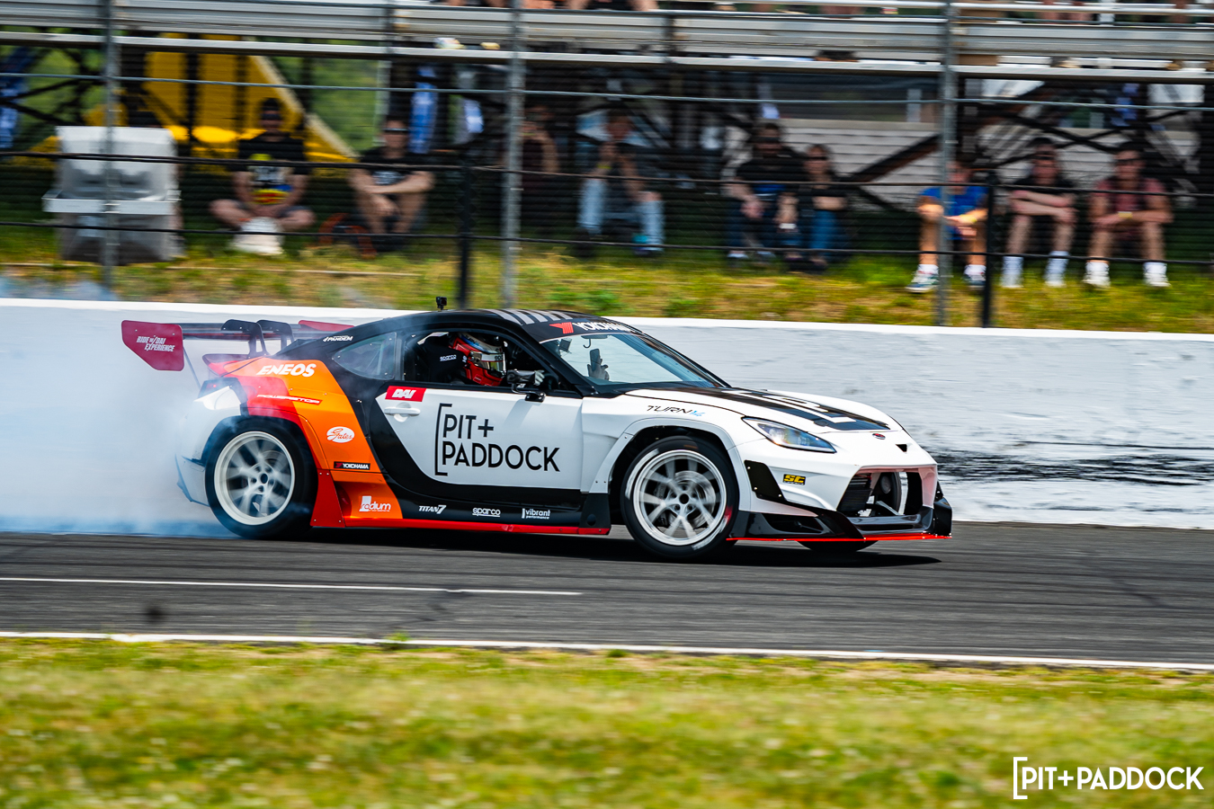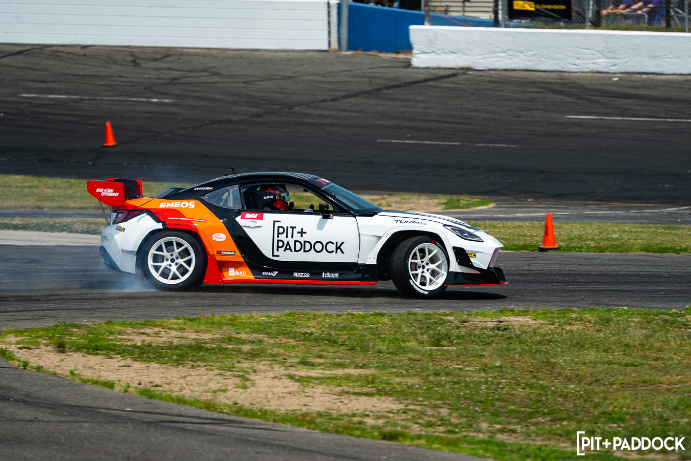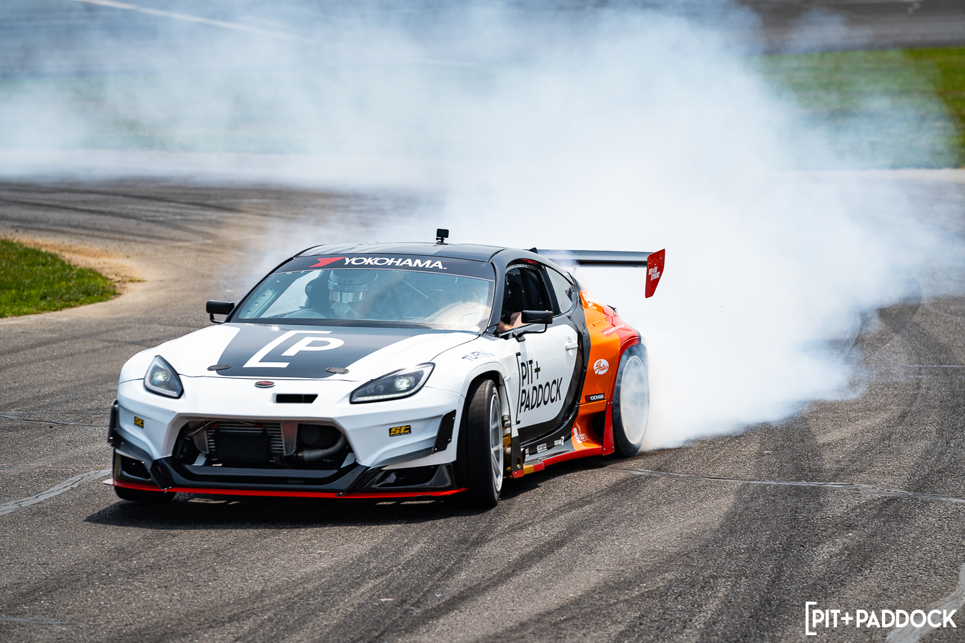 I have to give Dai credit… One would think after retiring from Formula DRIFT after 18 years, he might’ve lost a pep to his step. Maybe he’d even dial things back a notch to preserve tires, save the car from any danger, or perhaps take into consideration that he has a terrified passenger strapped into his passenger seat. But no. Dai Yoshihara only knows one speed and that is full send. He gave exactly that at Round 1 of Pit+Paddock x PowerStop Ride with Dai at Wicked Big Meet presented by Gates!