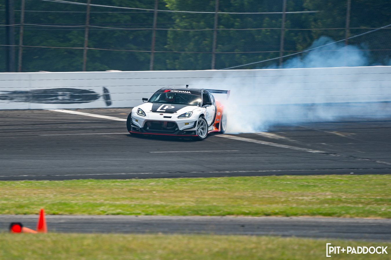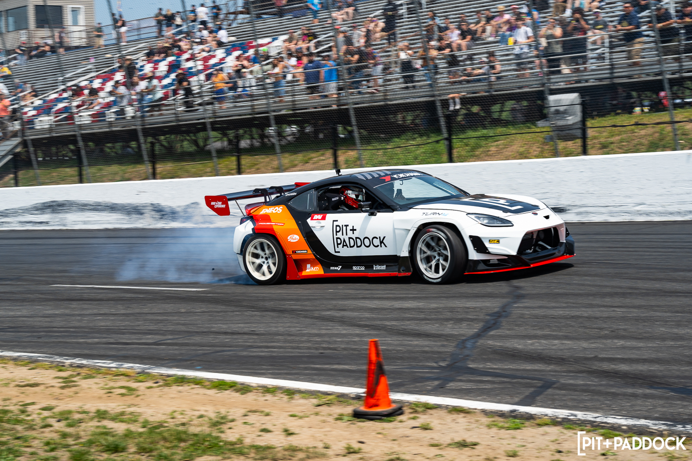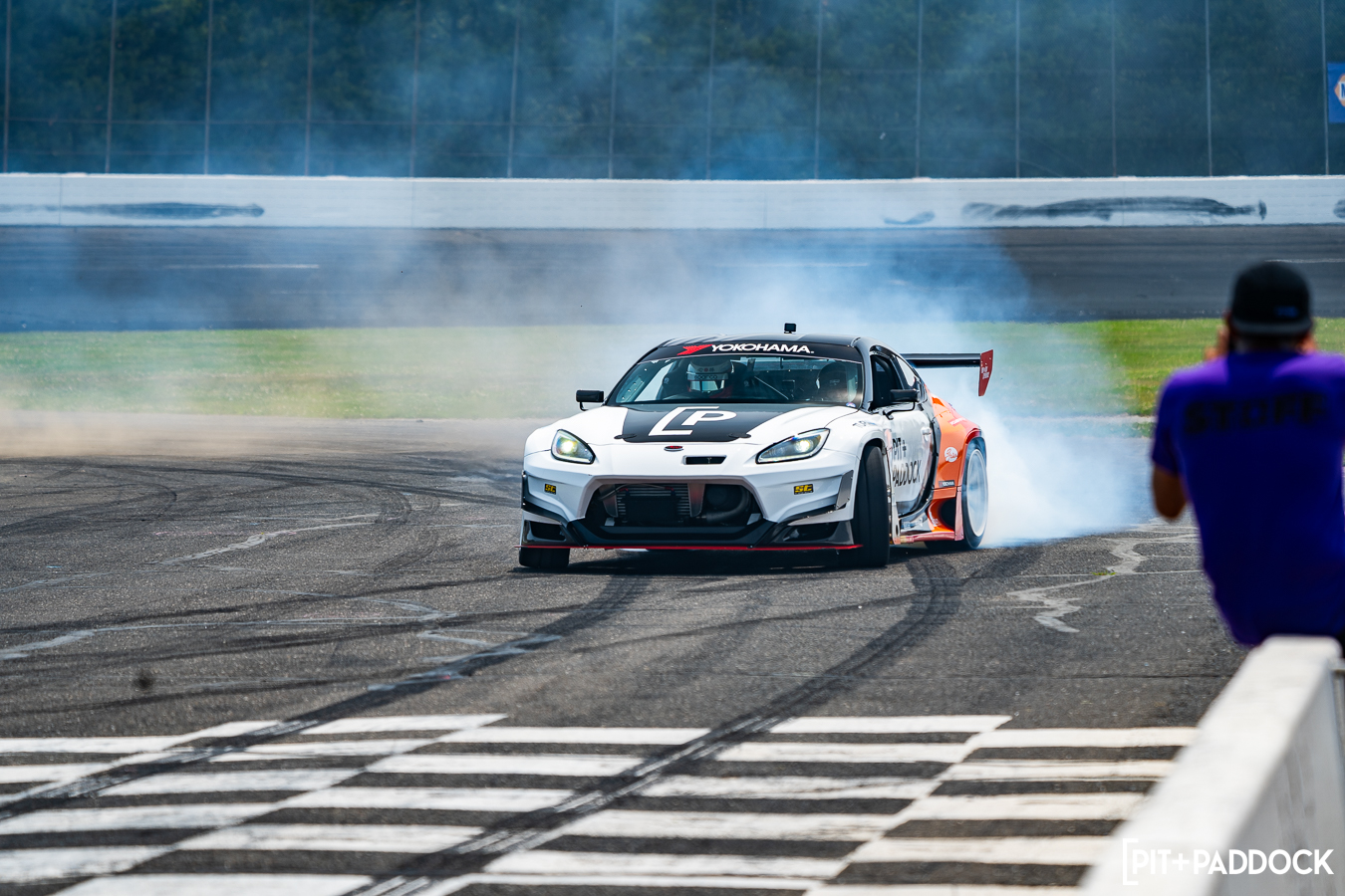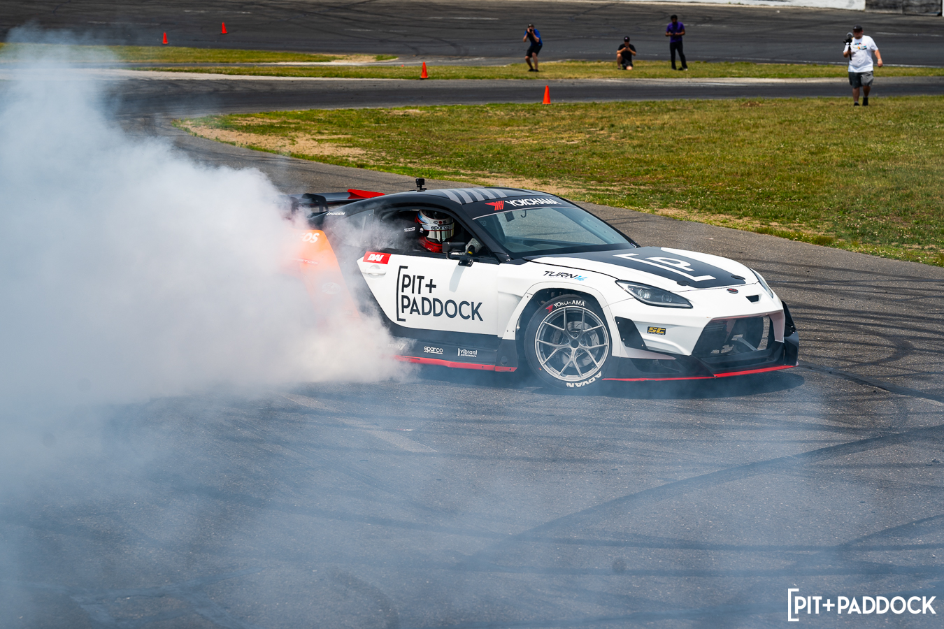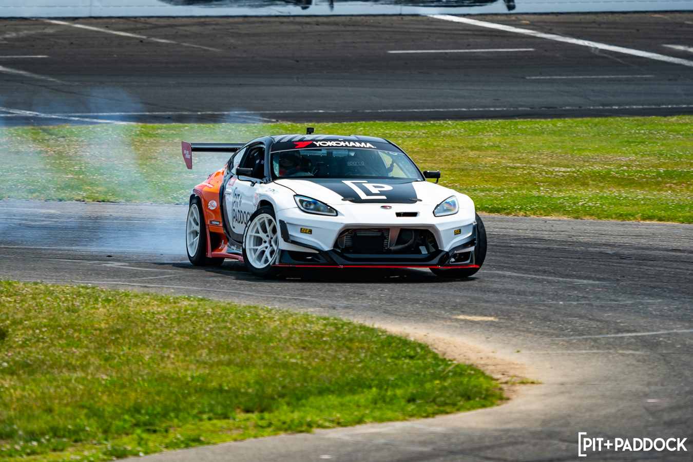 I have to give Dai credit… One would think after retiring from Formula DRIFT after 18 years, he might’ve lost a pep to his step. Maybe he’d even dial things back a notch to preserve tires, save the car from any danger, or perhaps take into consideration that he has a terrified passenger strapped into his passenger seat. But no. Dai Yoshihara only knows one speed and that is full send. He gave exactly that at Round 1 of Pit+Paddock x PowerStop Ride with Dai at Wicked Big Meet presented by Gates!