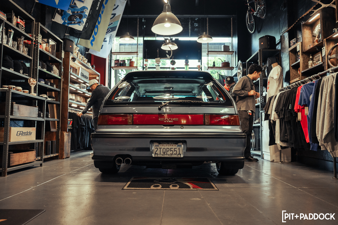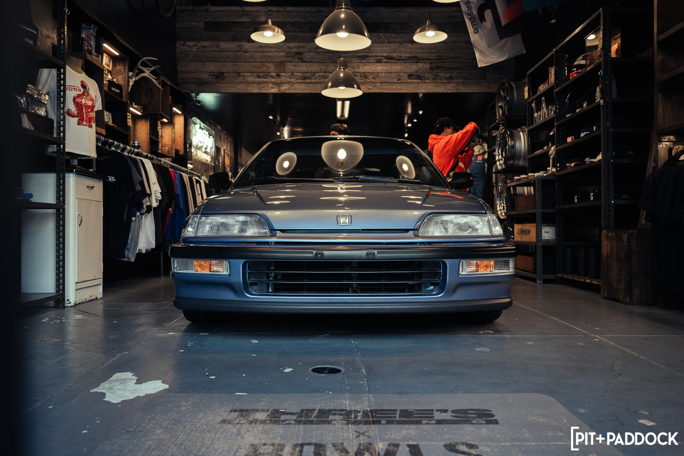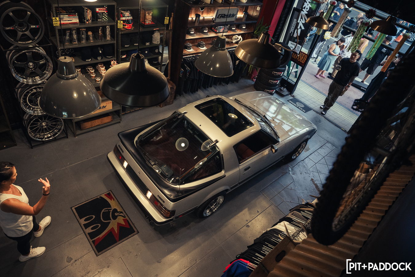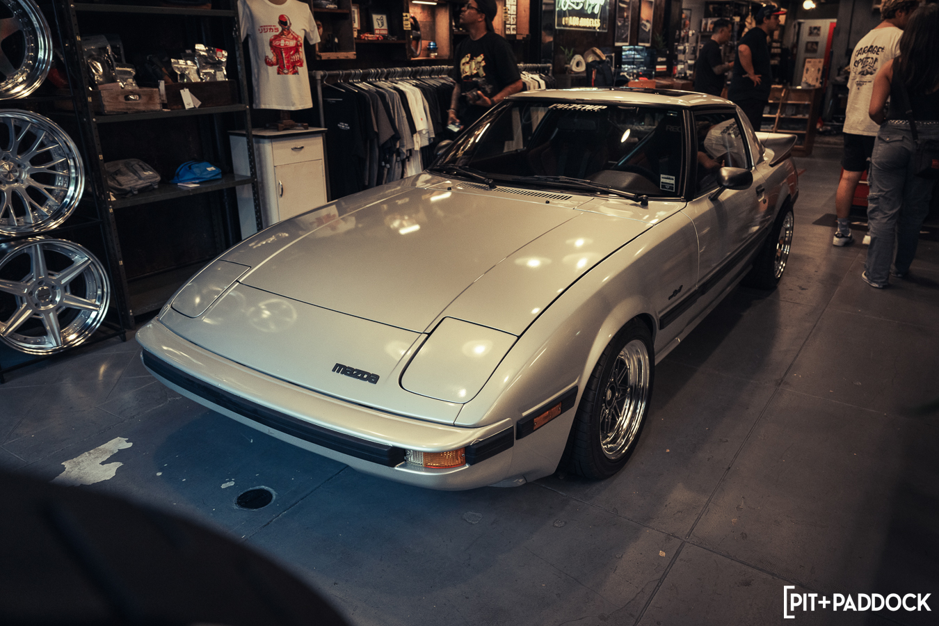 The obvious car for Bowls to shoehorn inside would’ve been the ever-so-popular FD RX-7; however, the narrow opening of the storefront’s doors limits what cars can actually fit. Hence, there was only one option: a first-generation SA22C or FB RX-7. Only sold for three years in the U.S., these cars are extremely rare to find, but luckily, Pit+Paddock’s very own Daryl Sampson is a longtime owner of a silver SA22C RX-7 that sits pretty on SSR MKIII wheels. It just so happened that the car was stored locally in Los Angeles.