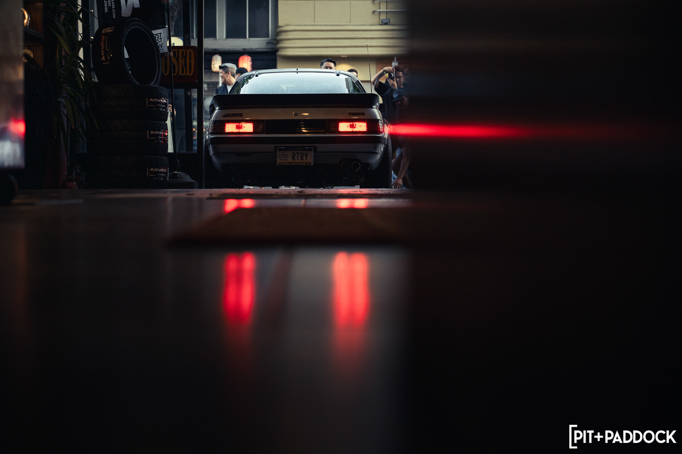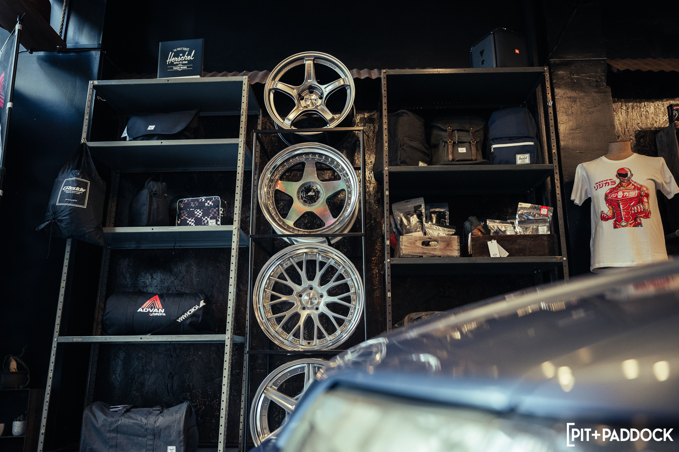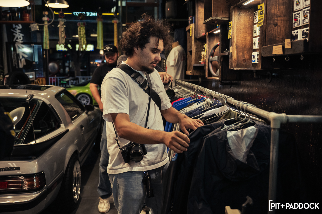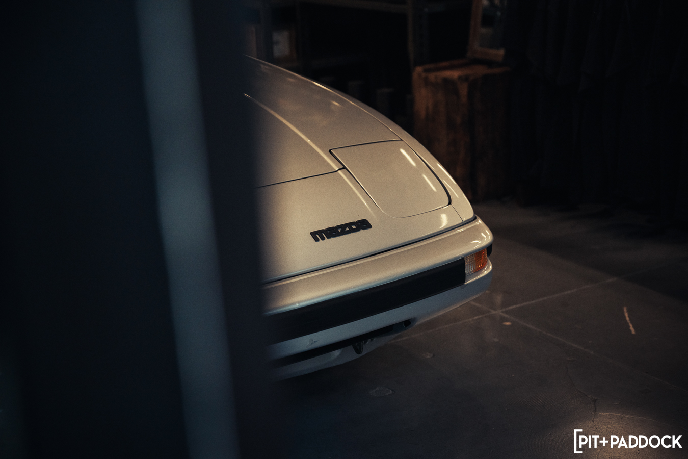 The obvious car for Bowls to shoehorn inside would’ve been the ever-so-popular FD RX-7; however, the narrow opening of the storefront’s doors limits what cars can actually fit. Hence, there was only one option: a first-generation SA22C or FB RX-7. Only sold for three years in the U.S., these cars are extremely rare to find, but luckily, Pit+Paddock’s very own Daryl Sampson is a longtime owner of a silver SA22C RX-7 that sits pretty on SSR MKIII wheels. It just so happened that the car was stored locally in Los Angeles.