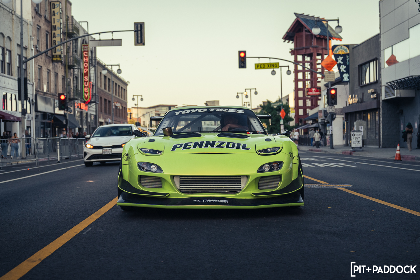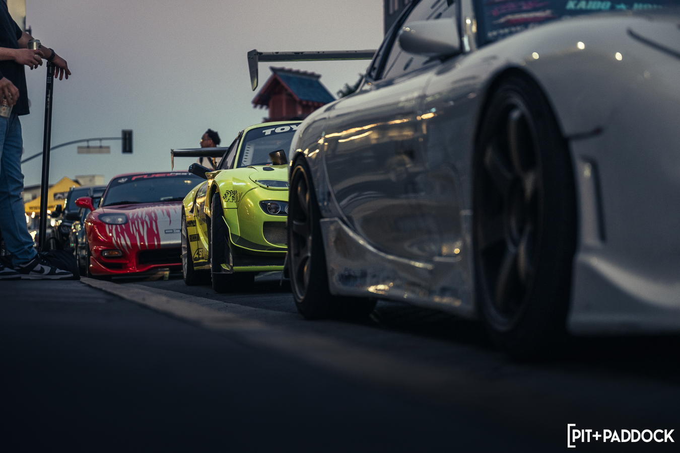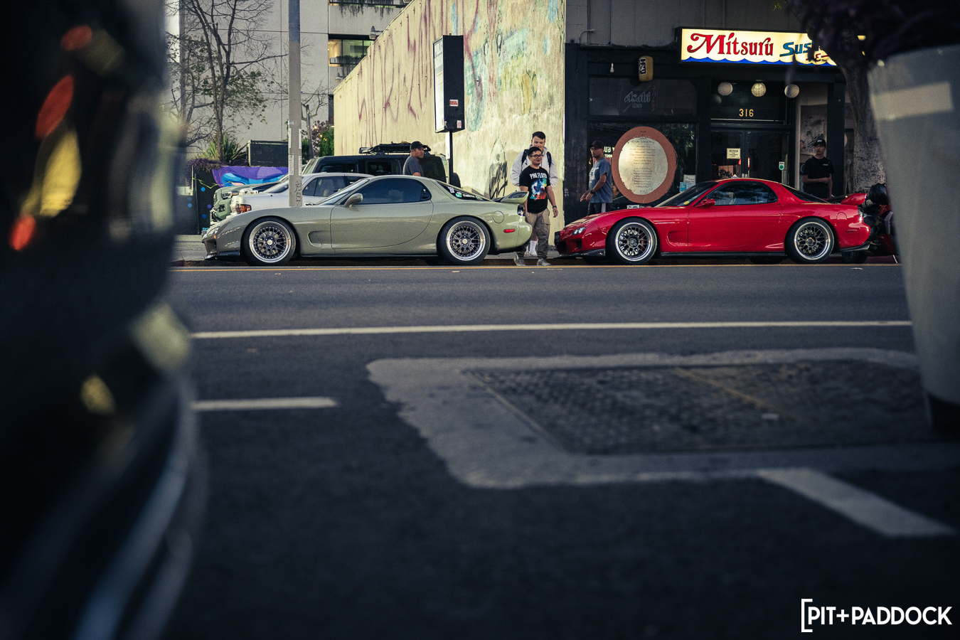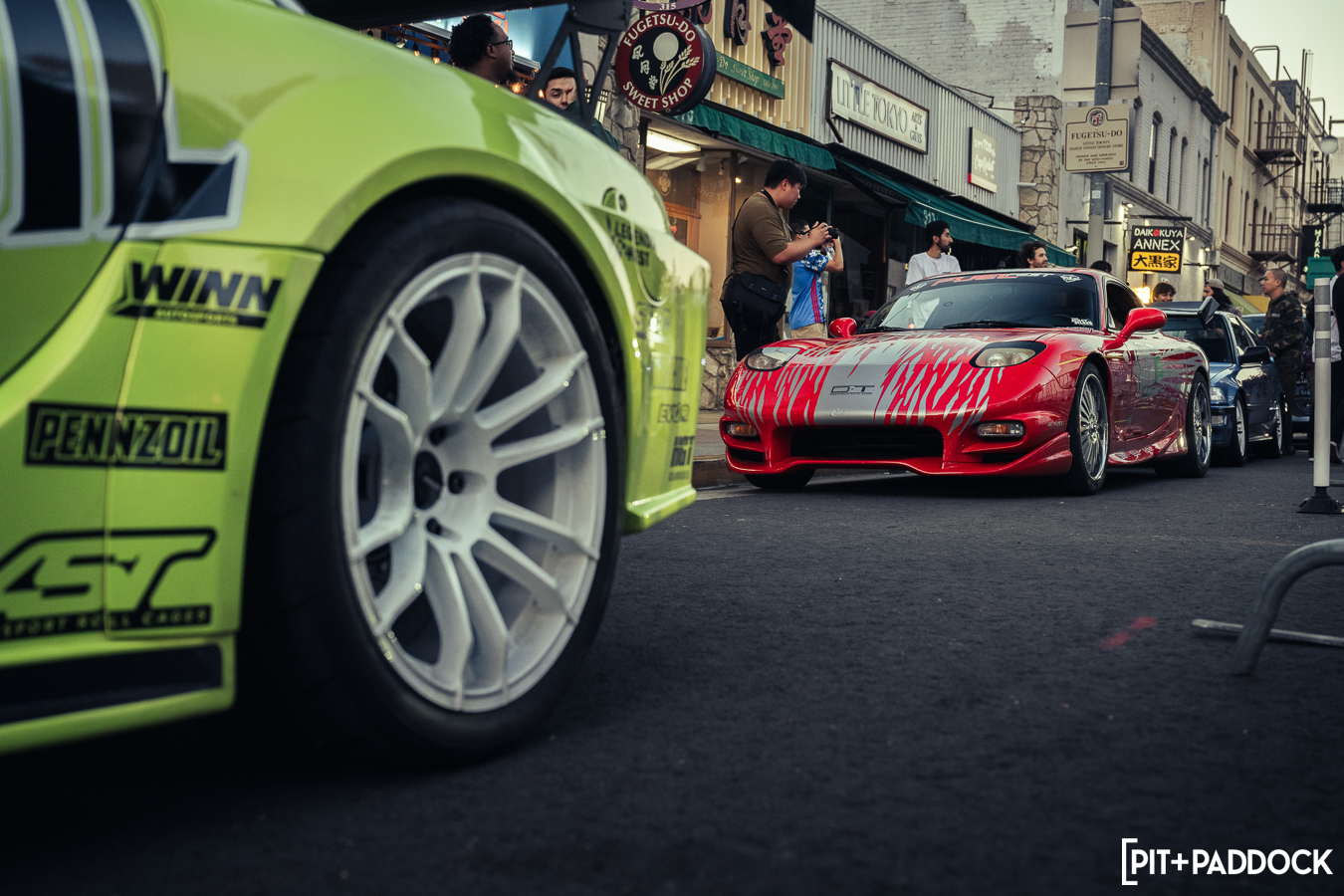 Once Daryl’s RX-7 was positioned into place, the sound of rotary engines echoed through Japantown as RX-7s and RX-8s cruised up and down 1st Avenue. Just outside Bowls, seven FD RX-7s secured primo parking spaces, which included a special appearance from Jonathan Grunwald. You’ll remember Jonny as his white TCP Magic widebody RX-7 was the very first Pit+Paddock poster giveaway two years ago. His other FD project car is this bright green one that summons 1,200hp and makes so much noise that it could easily deafen anyone who’s standing within a 30-foot radius. In addition to Jonny’s race car, Ilia Smolov of Final Bout stopped by with his Team Proceed drift car and a Fast & Furious replica car which couldn’t have looked more at home in downtown LA.